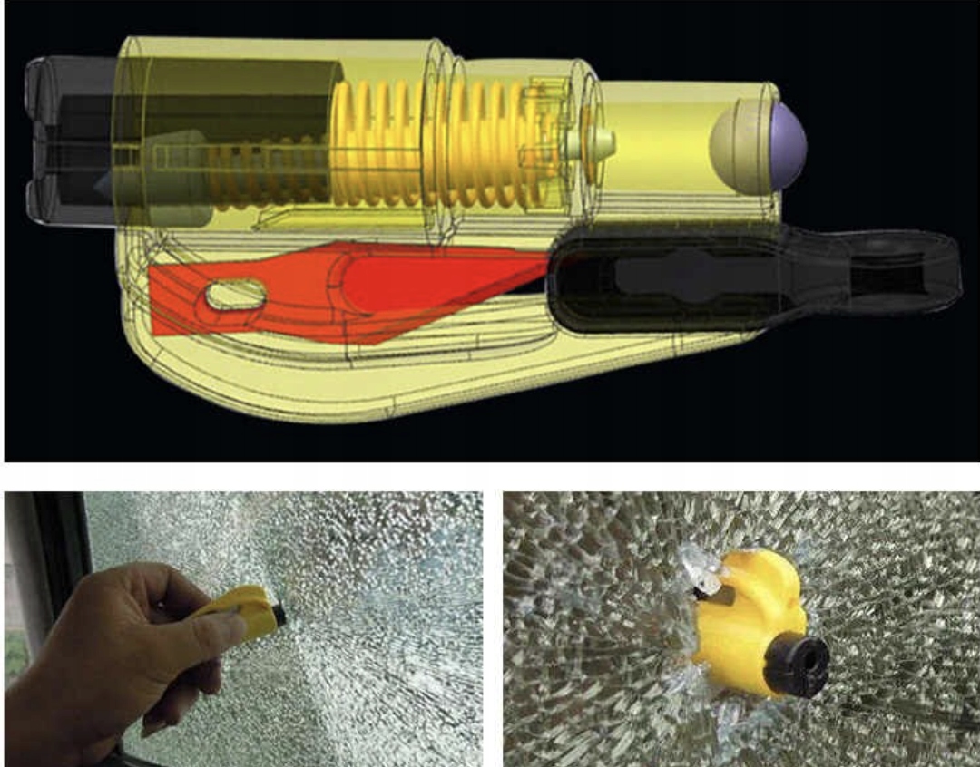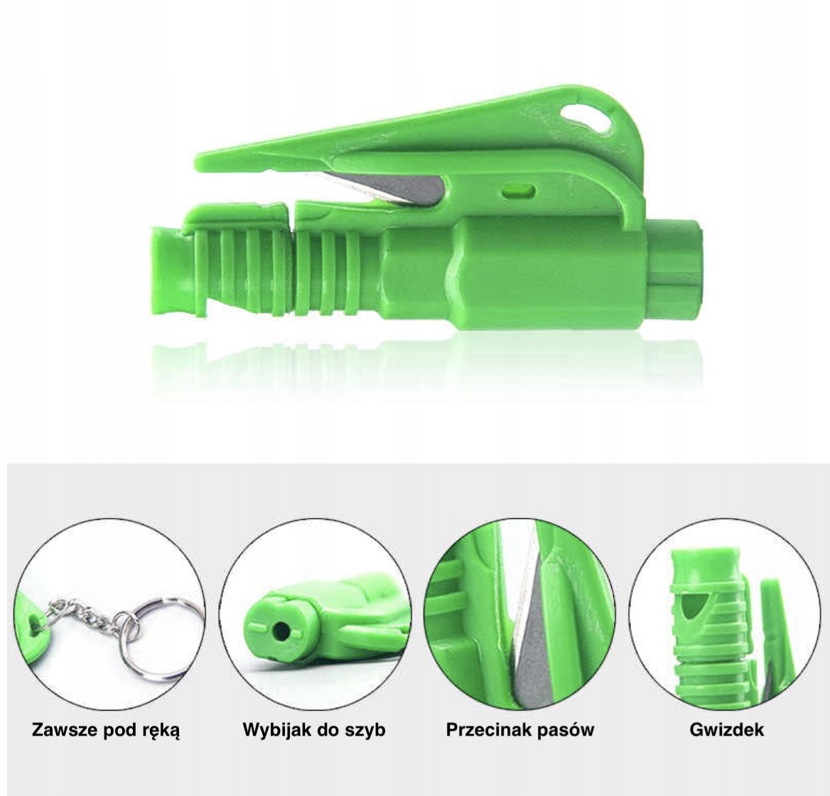 • Narzędzie 3w1 - młotek do rozbijania szyb (hartowanych, nielaminowanych), przecinak pasów bezpieczeństwa, breloczek do kluczyków samochodowych oraz gwizdek.