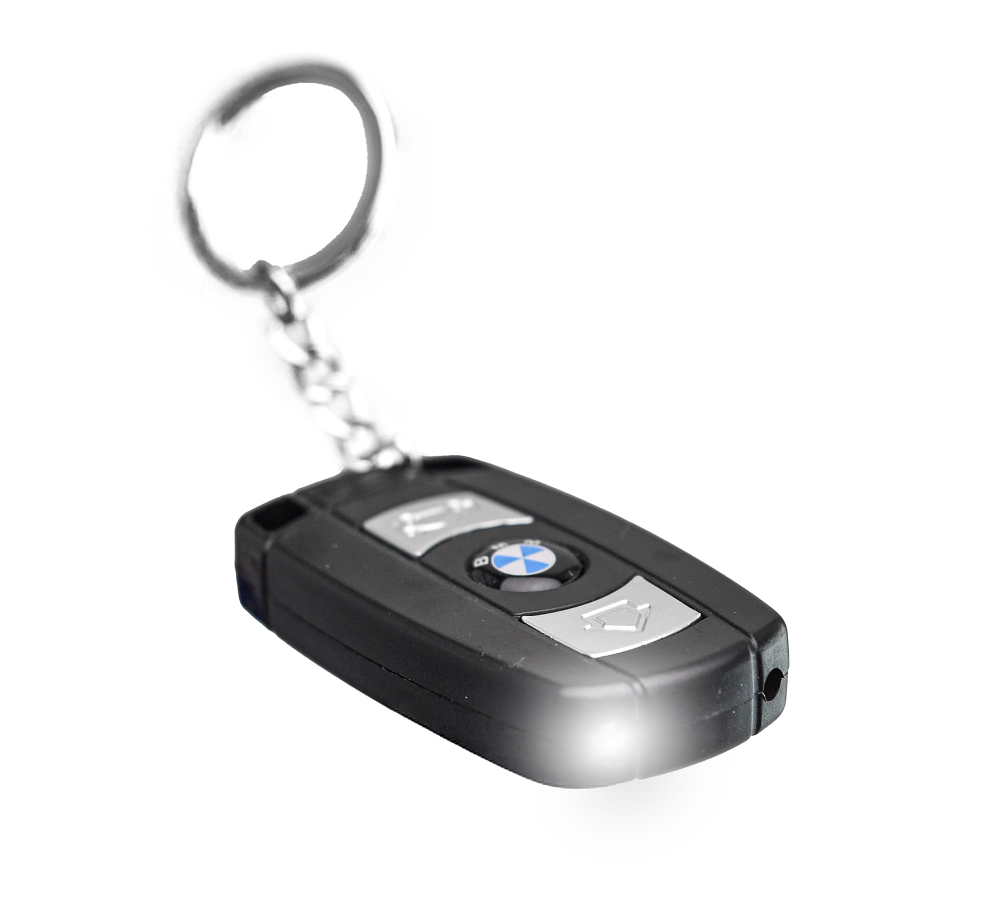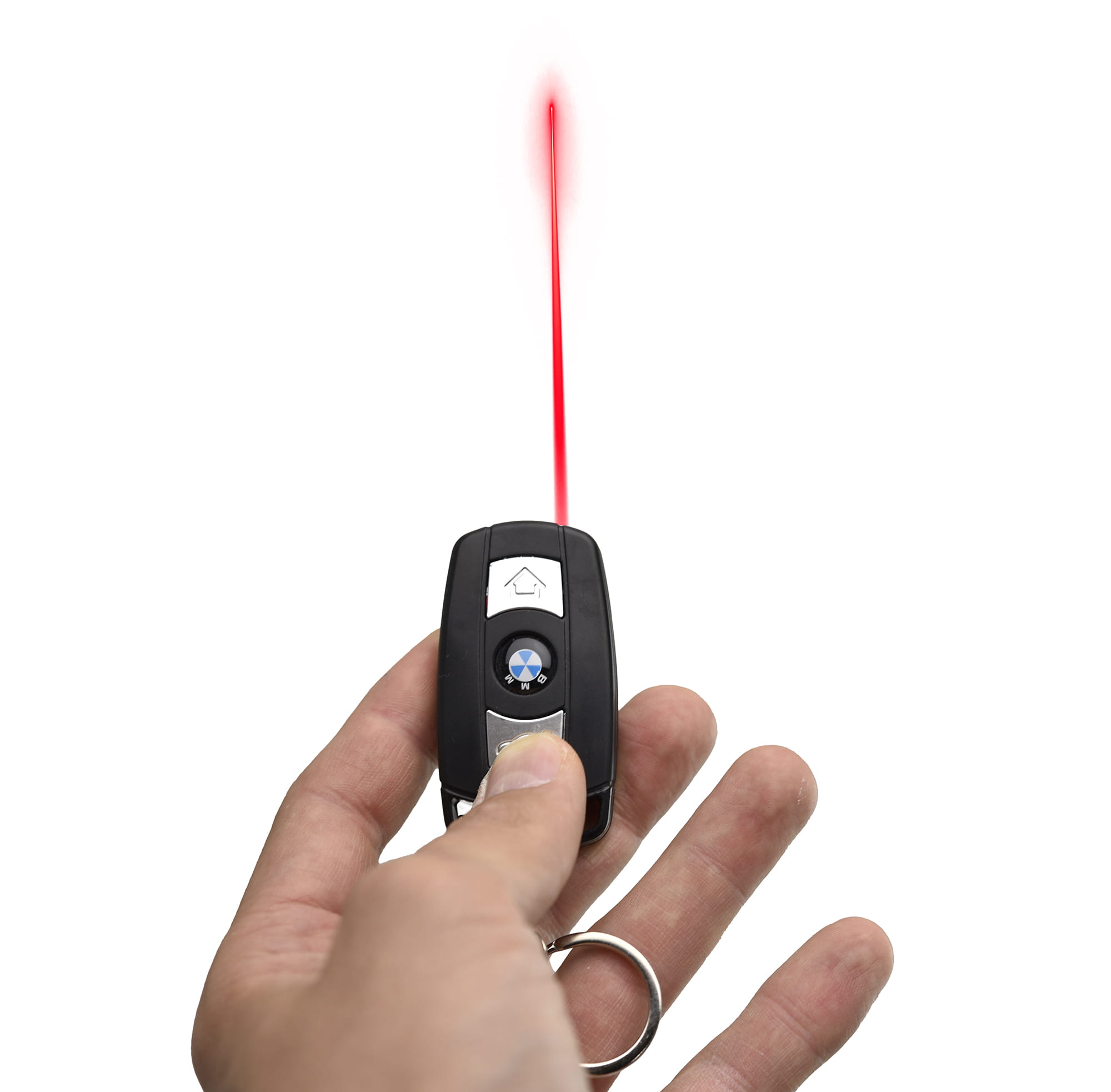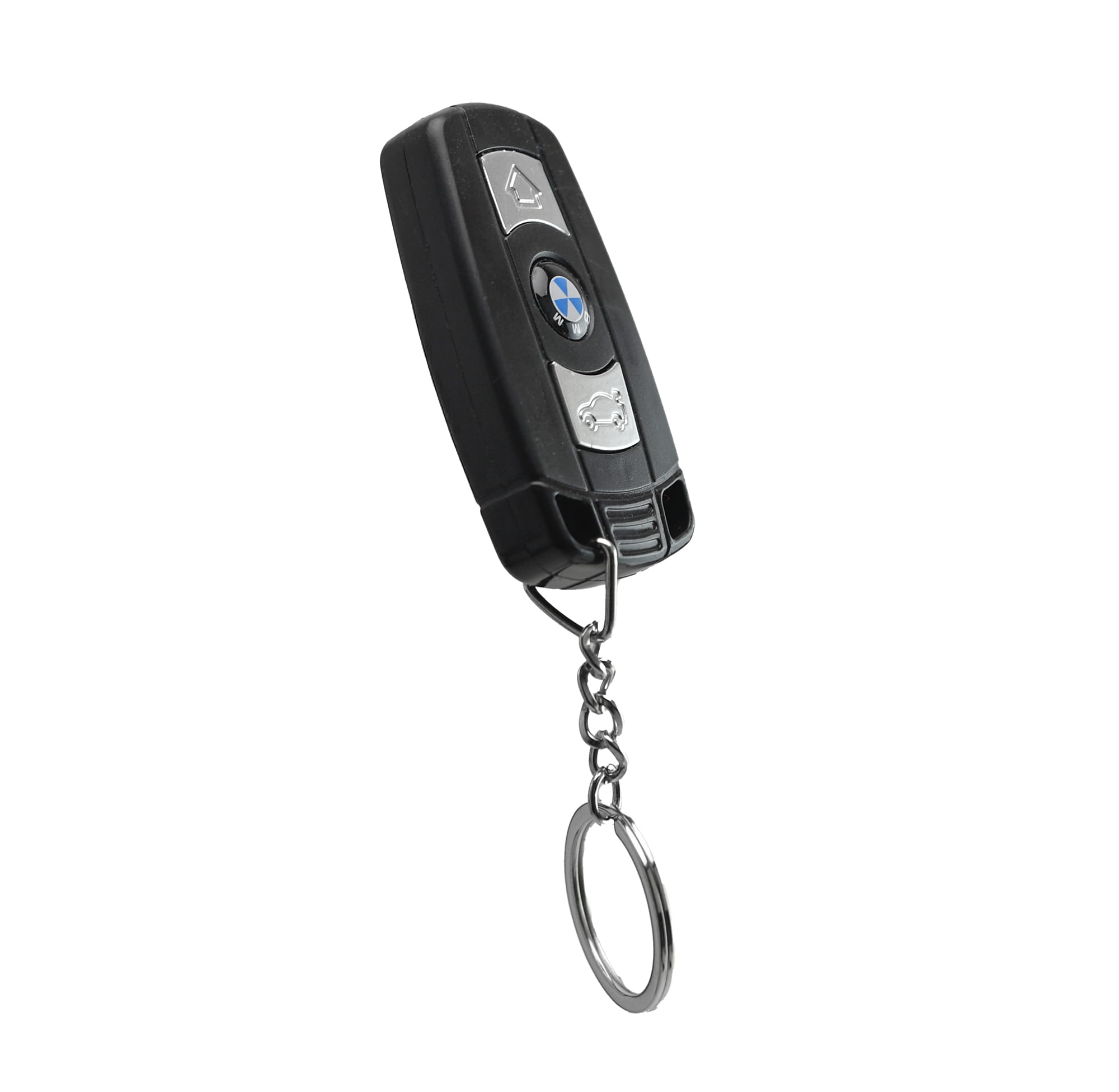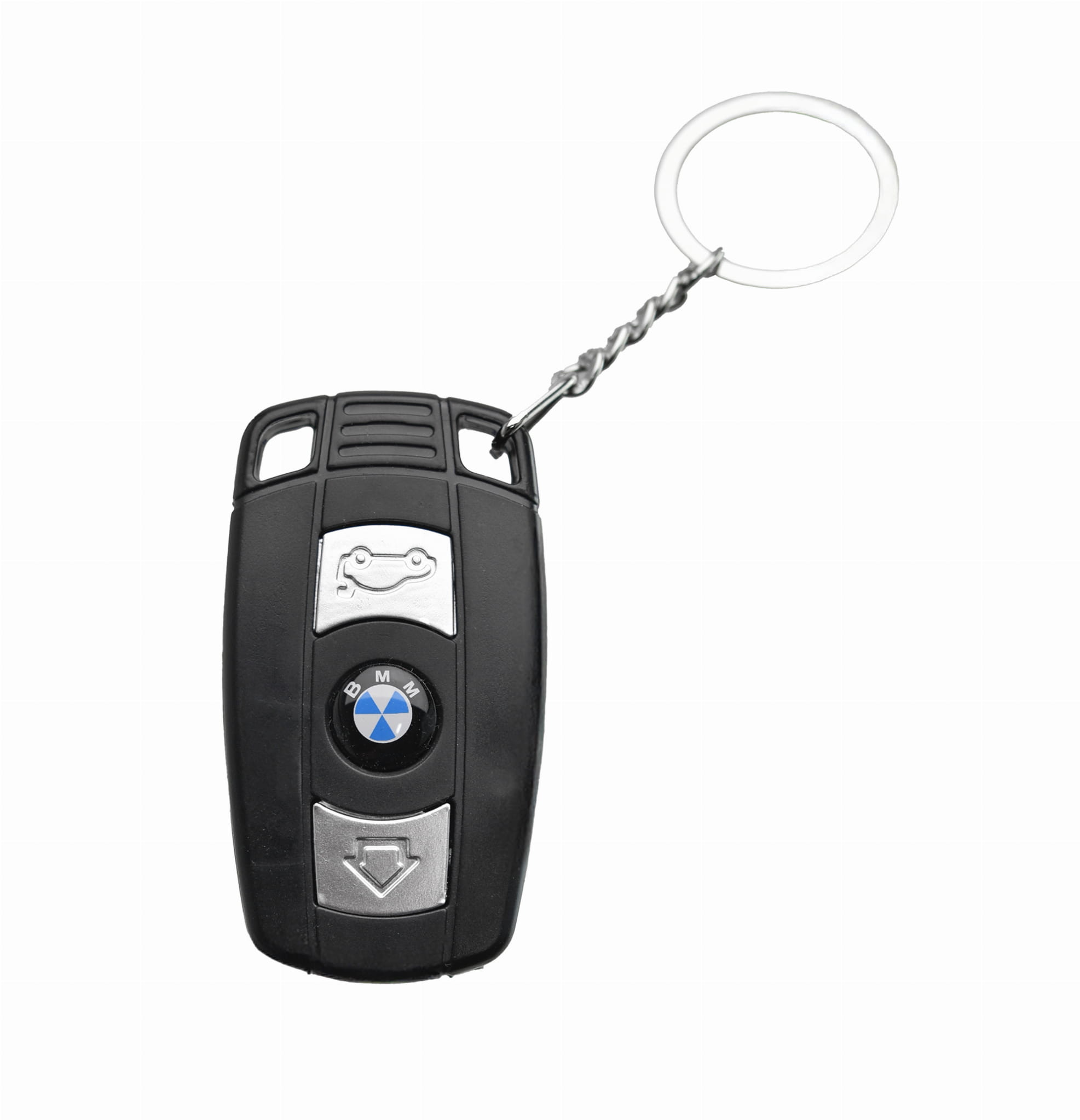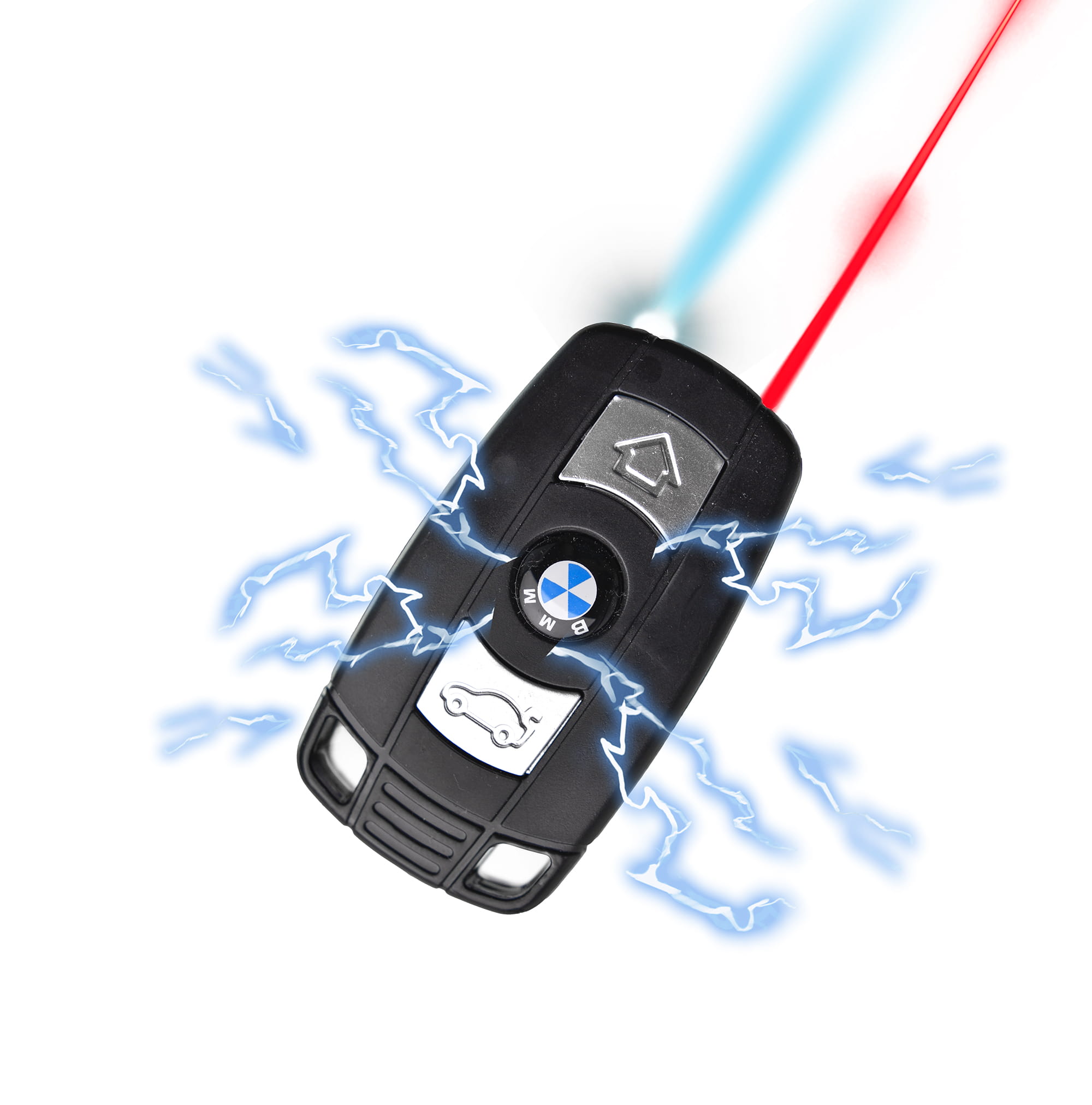 Brelok-kluczyk imitujący kluczyk samochodowy marki Bayerische Motoren Werke z funkcją latarki, lasera i impulsem elektrycznym