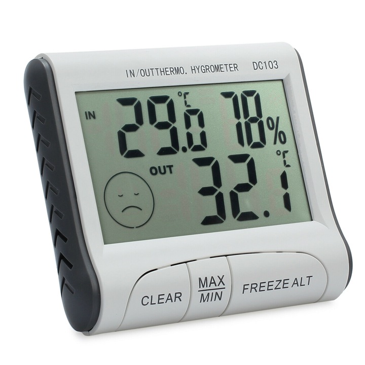 Higrometr to dokładne urządzenie służące do wykonywania pomiarów wilgotności powietrza w pomieszczeniu oraz temperatury w pomieszczeniu i na dworze. Do zestawu dołączona jest specjalna sonda służąca do pomiarów zewnętrznych. Należy podłączyć ją do urządzenia, a drugi koniec wystawić przez okno. Urządzenie posiada stabilną nóżkę na obudowie.