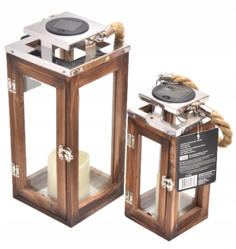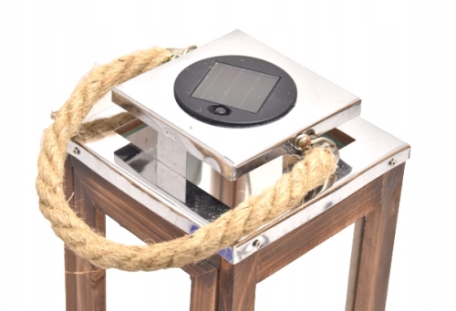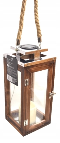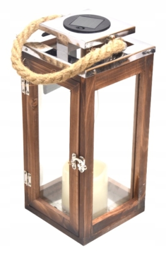 - Latarnia wykonana jest z prawdziwego drewna, szkła oraz metalu. Rączka to pleciony sznur oraz metalowe okucia. Wewnątrz znajdziemy diodę led ukrytą w obudowie do złudzenia przypominającą prawdziwą świecę. Lampion oprócz panelu SOLARNEGO posiada również czujnik zmierzchu tak więc gdy zapada zmrok automatycznie zaczyna świecić a kiedy robi się jasno panel solarny doładowuje akumulator aby znów mógł świecić całą noc.