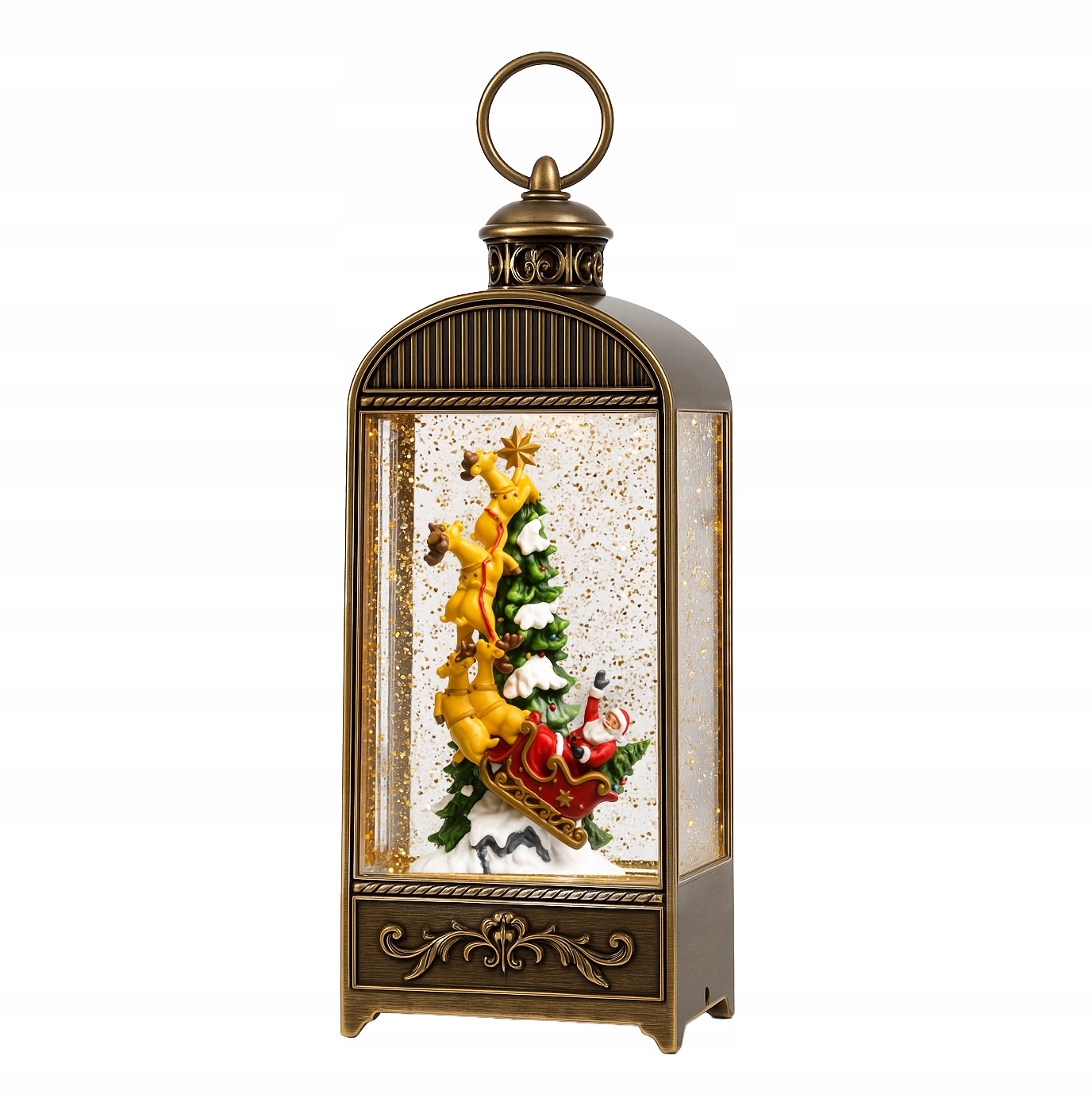 Wnętrze lampionu wypełnia realistyczna, świąteczna sceneria – Mikołaj w czerwonym stroju w saniach, otoczony reniferami i choinką pokrytą śniegiem. Całość zatopiona jest w przejrzystym płynie, w którym krąży spadający śnieg w postaci błyszczącego konfetti.