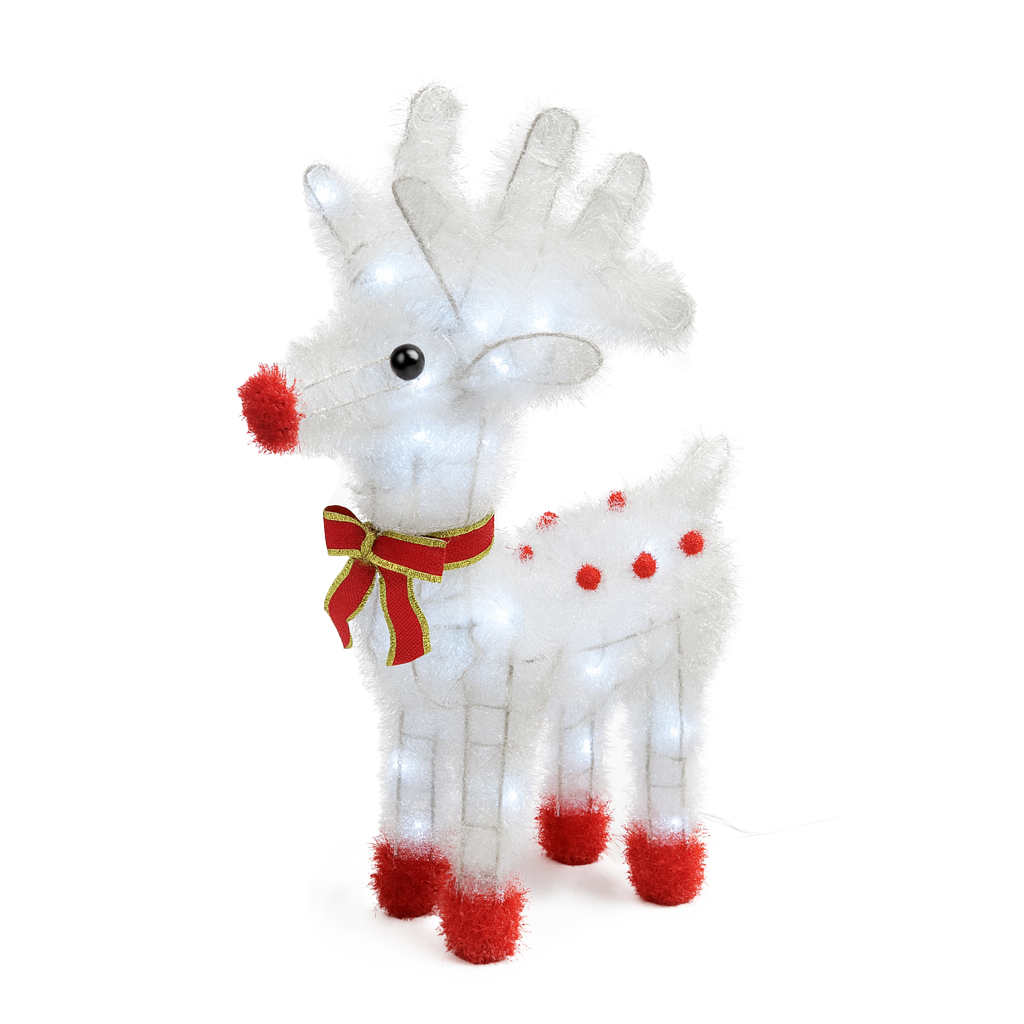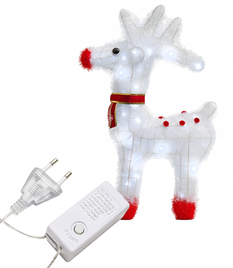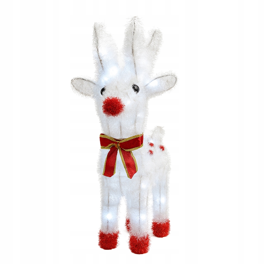 - Wprowadź do swojego domu (lub ogrodu!) wyjątkowy świąteczny klimat dzięki tej niezwykłej dekoracji – dużemu, śnieżnobiałemu reniferowi LED o wysokości aż 50 cm. Jego konstrukcja wykonana jest z solidnego, metalowego stelaża, oplecionego białą, puszystą tasiemką, która pięknie odbija światło i tworzy efekt delikatnego, zimowego połysku. W połączeniu z jasnymi, białymi diodami LED całość daje wyjątkowy, wręcz bajkowy efekt – identyczny jak na zdjęciach.