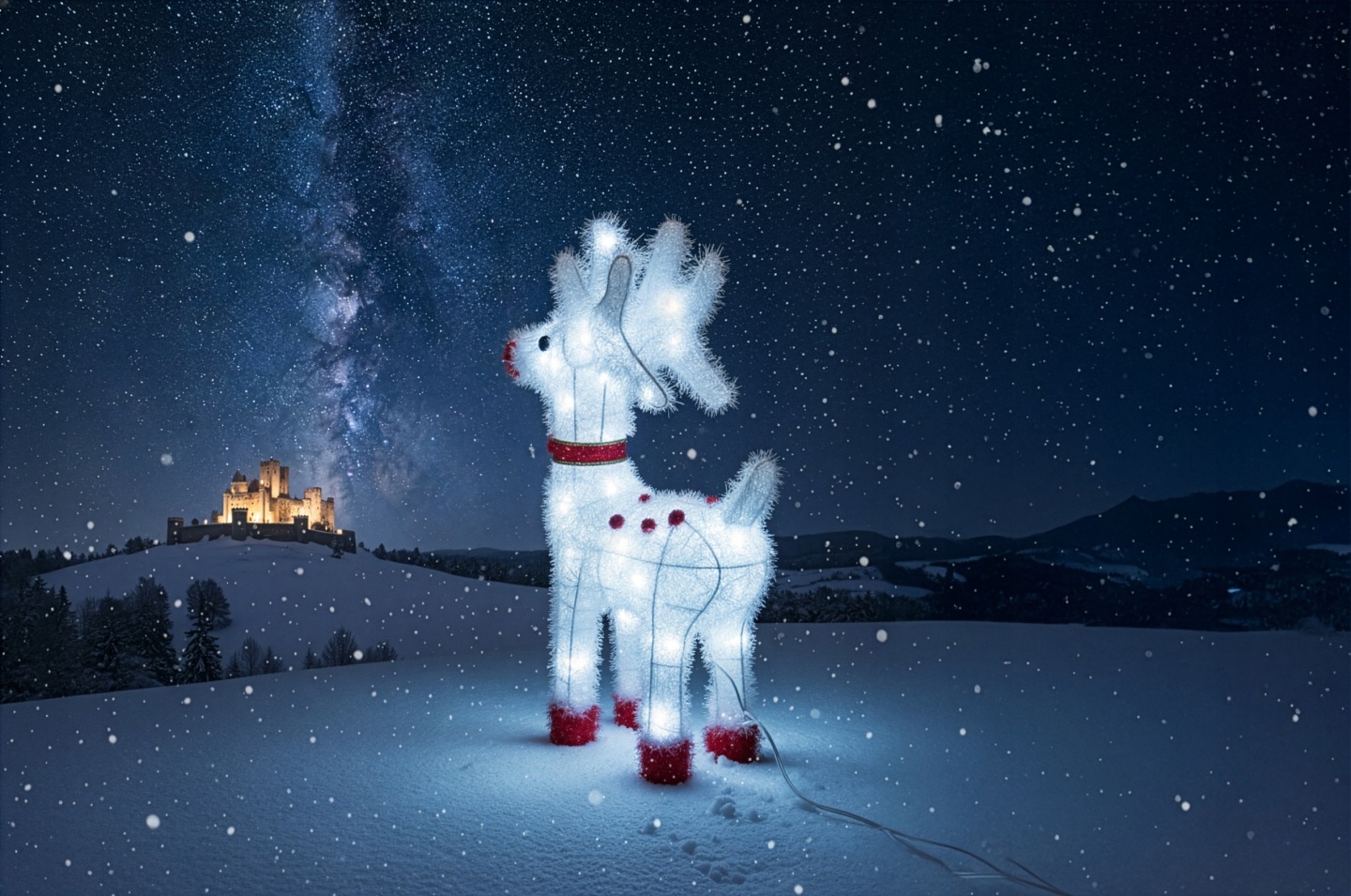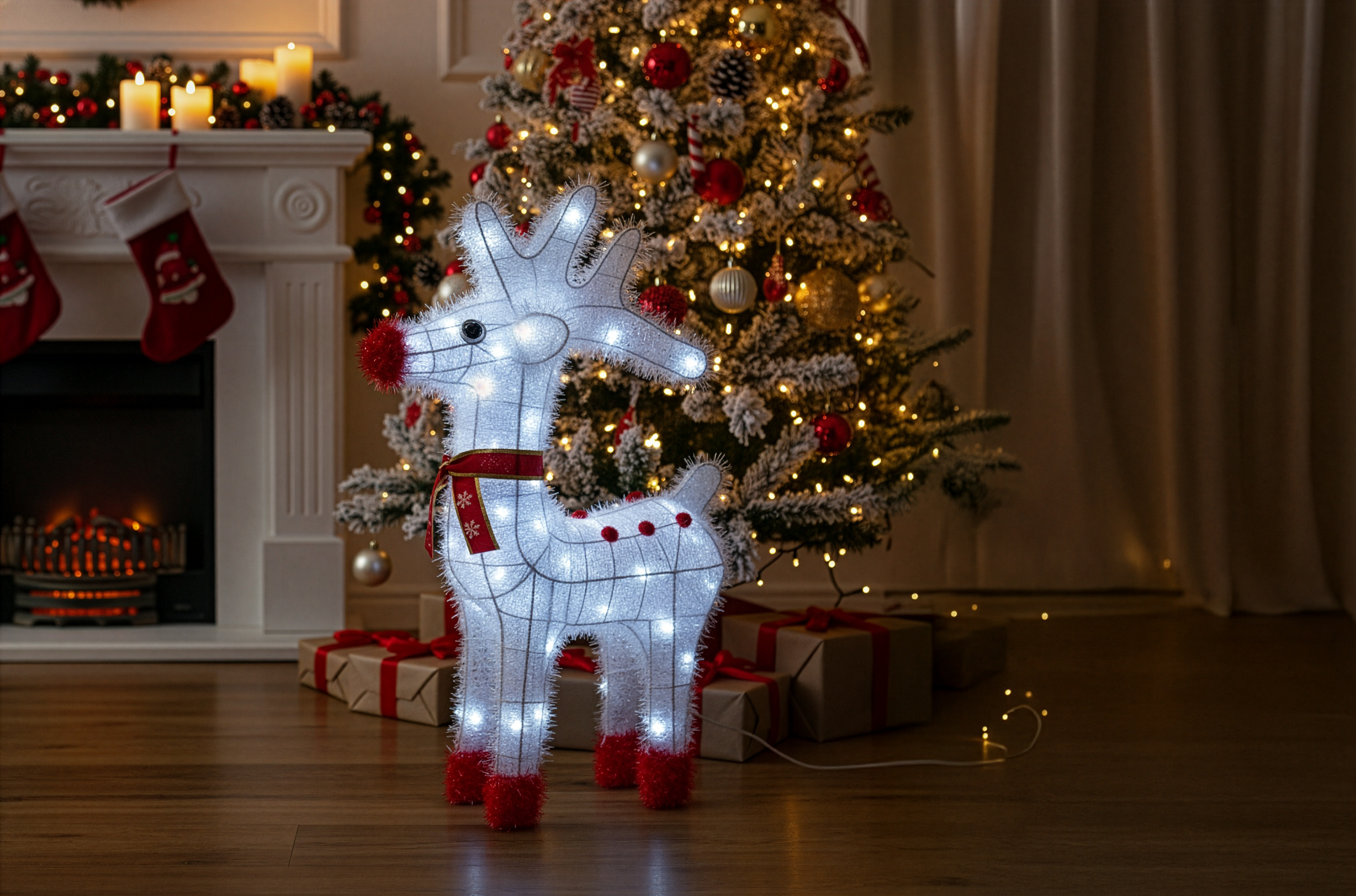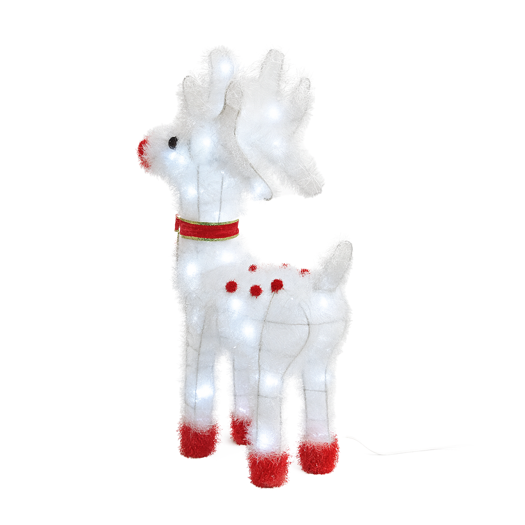 - Wprowadź do swojego domu (lub ogrodu!) wyjątkowy świąteczny klimat dzięki tej niezwykłej dekoracji – dużemu, śnieżnobiałemu reniferowi LED o wysokości aż 50 cm. Jego konstrukcja wykonana jest z solidnego, metalowego stelaża, oplecionego białą, puszystą tasiemką, która pięknie odbija światło i tworzy efekt delikatnego, zimowego połysku. W połączeniu z jasnymi, białymi diodami LED całość daje wyjątkowy, wręcz bajkowy efekt – identyczny jak na zdjęciach.