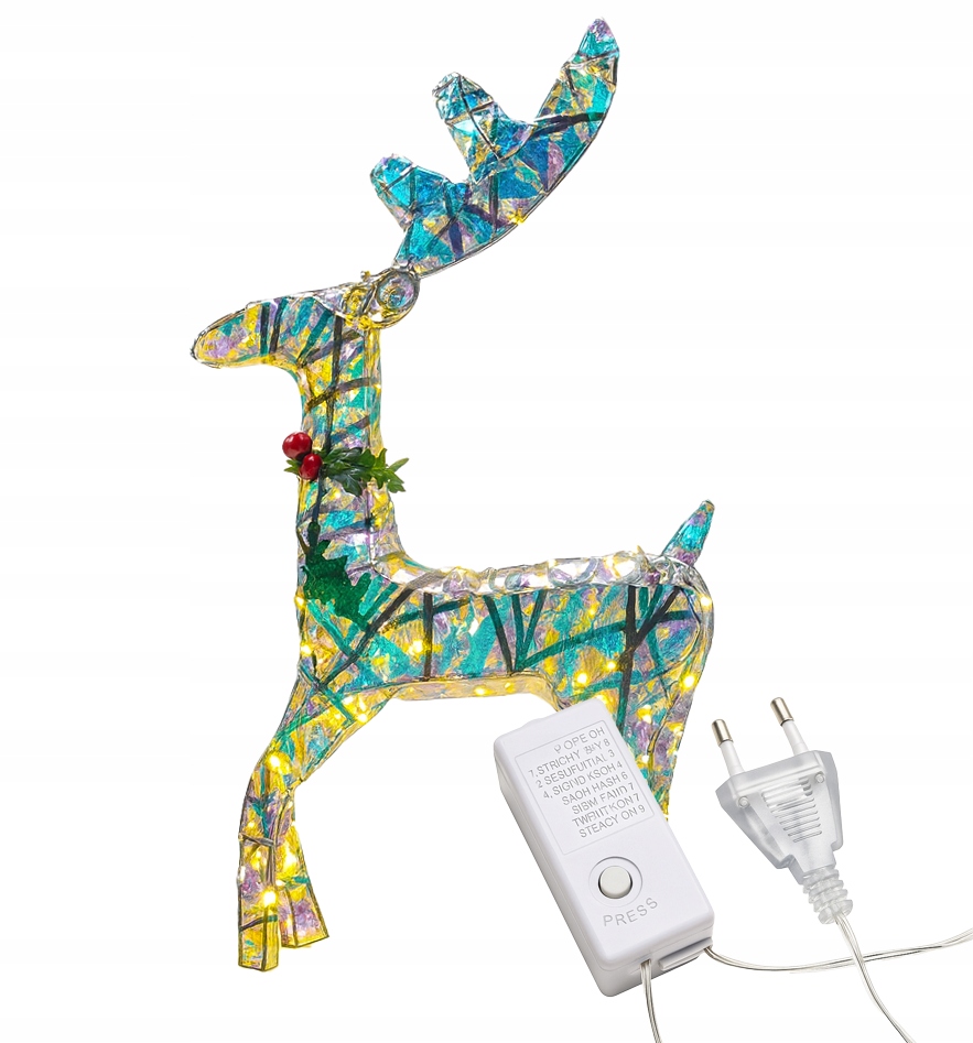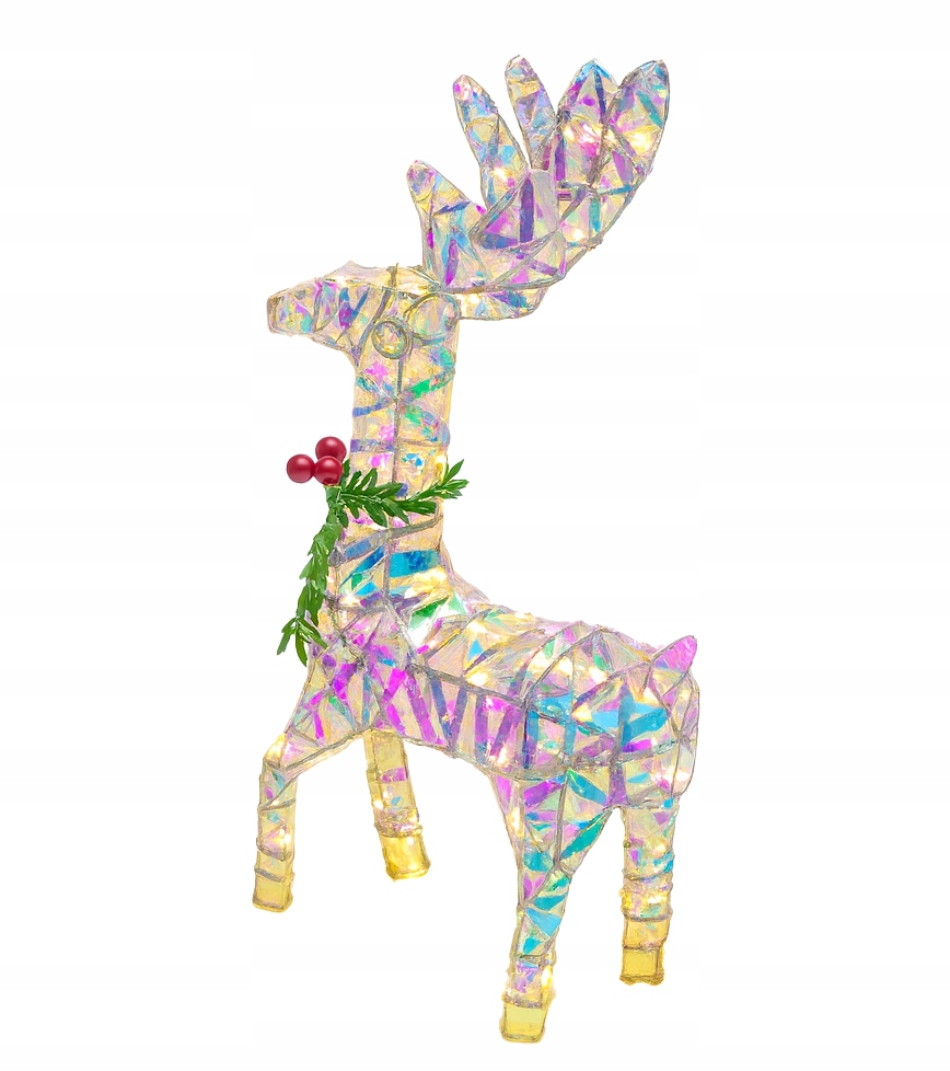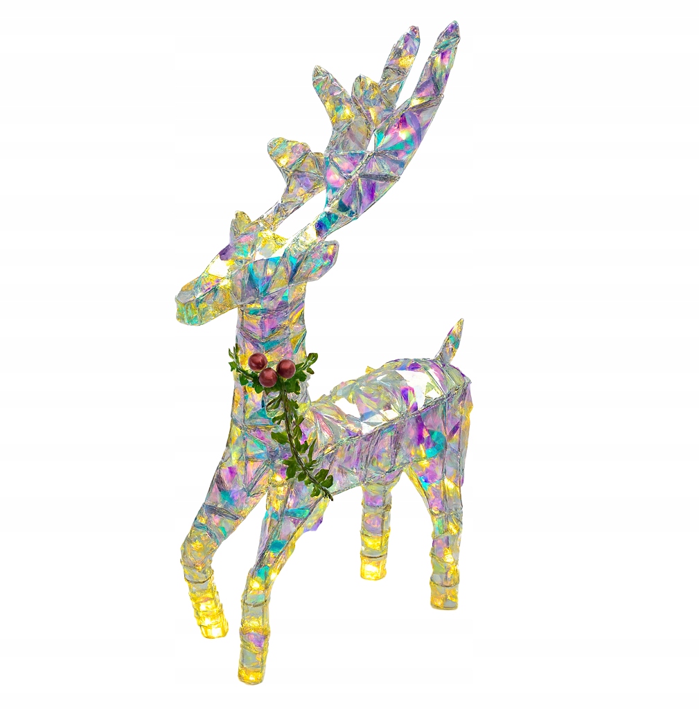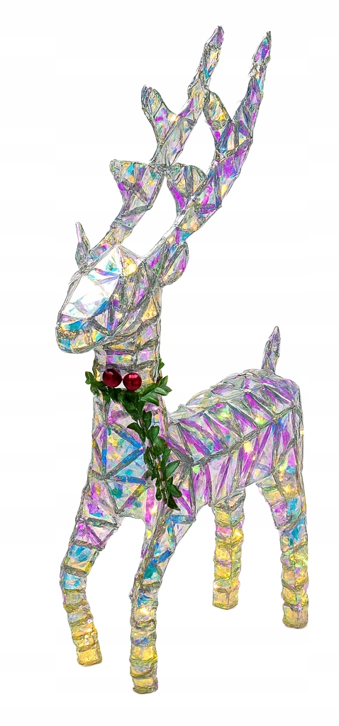 - Wprowadź do swojego domu (lub ogrodu!) wyjątkowy świąteczny klimat dzięki tej niezwykłej dekoracji – dużemu, mieniącemu się reniferowi LED o wysokości aż 54 cm. Jego konstrukcja wykonana jest z solidnego, metalowego stelaża, oplecionego kolorową, transparentną tasiemką o efekcie irydyzacji, która przepięknie odbija światło. W połączeniu z dużymi, ciepłymi diodami LED całość tworzy wyjątkowy, wręcz bajkowy efekt – identyczny jak na zdjęciach.