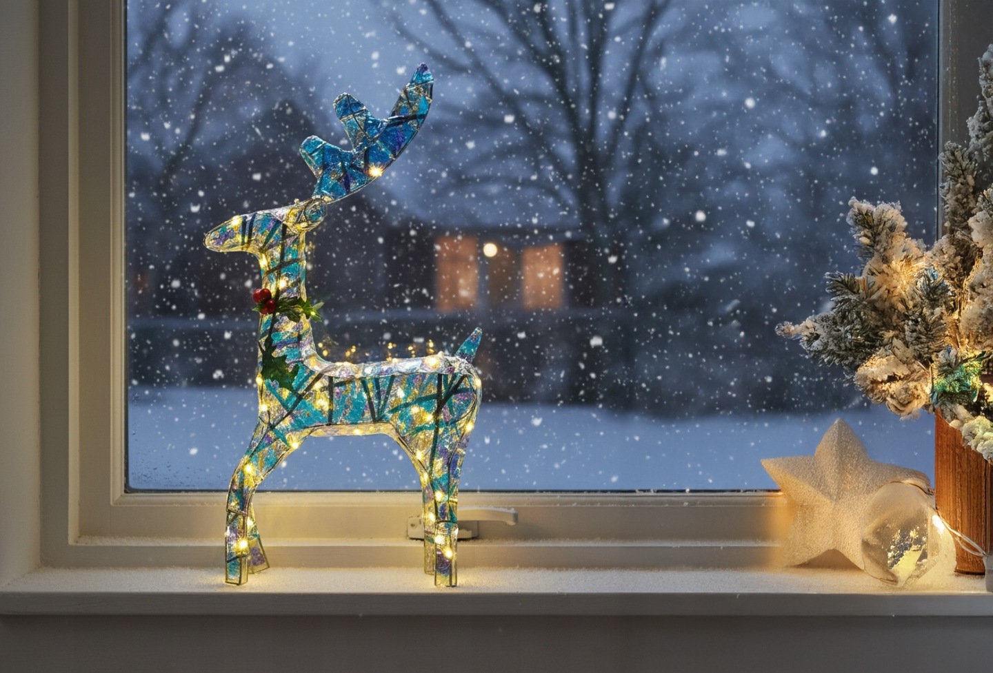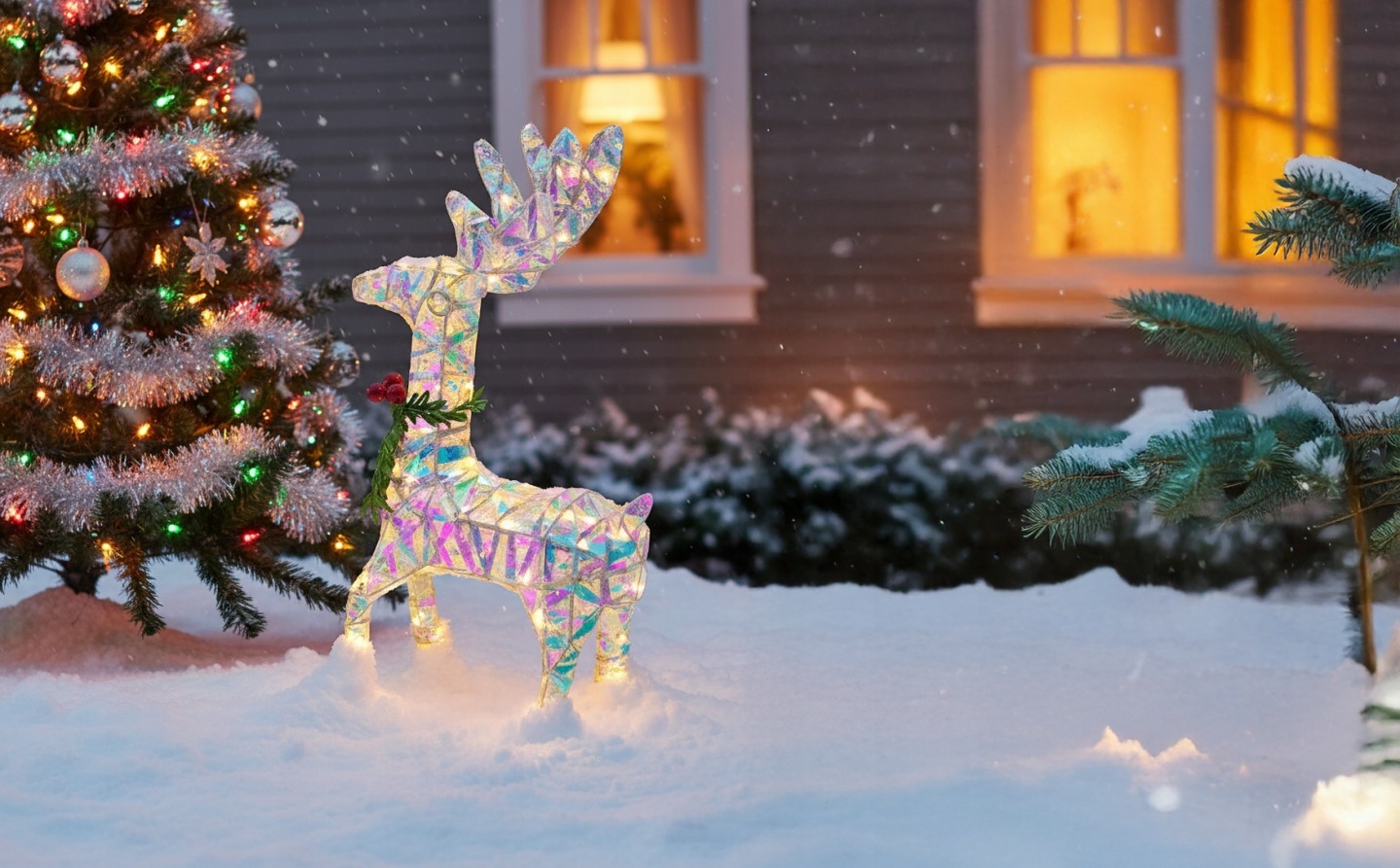 - To dekoracja, która od razu przyciąga wzrok: zarówno w dzień dzięki pięknej, holograficznej powierzchni, jak i wieczorem, gdy rozświetla ją ciepłe, świąteczne światło.