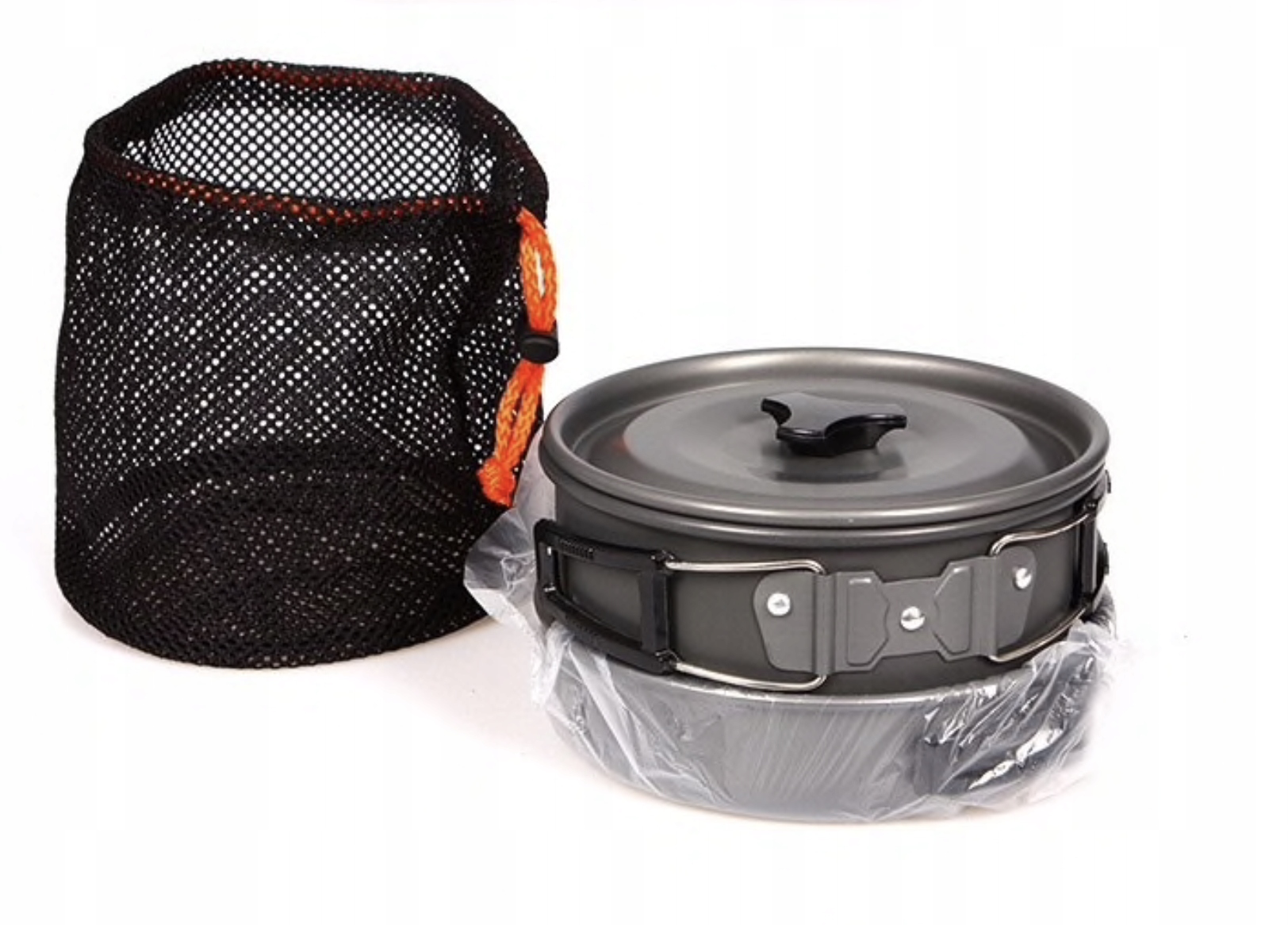 Naczynia zostały wykonane z anodowanego aluminium co czyni je trwałe lekkie (około 600g całość) i łatwe w utrzymaniu czystości.