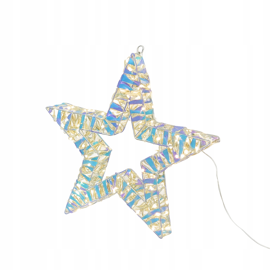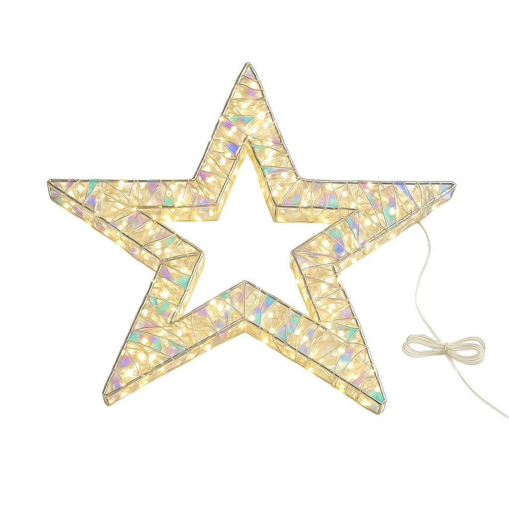 - opleciona około 240 ciepłymi LED-ami, które tworzą efektowną, świąteczną iluminację idealną do każdego wnętrza. Lampki pięknie rozświetlają irydyzującą, przezroczystą tasiemkę, nadając dekoracji głębi oraz subtelnych kolorowych refleksów — efekt ten jest trudny do uchwycenia na zdjęciu, dlatego w rzeczywistości gwiazda wygląda jeszcze bardziej imponująco.