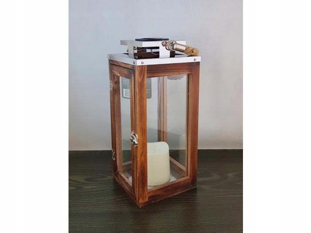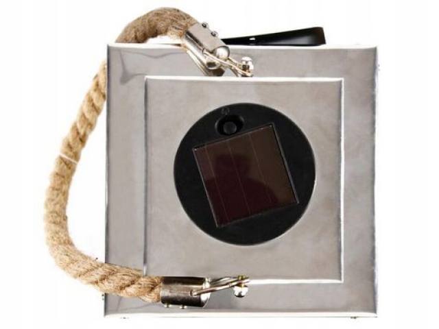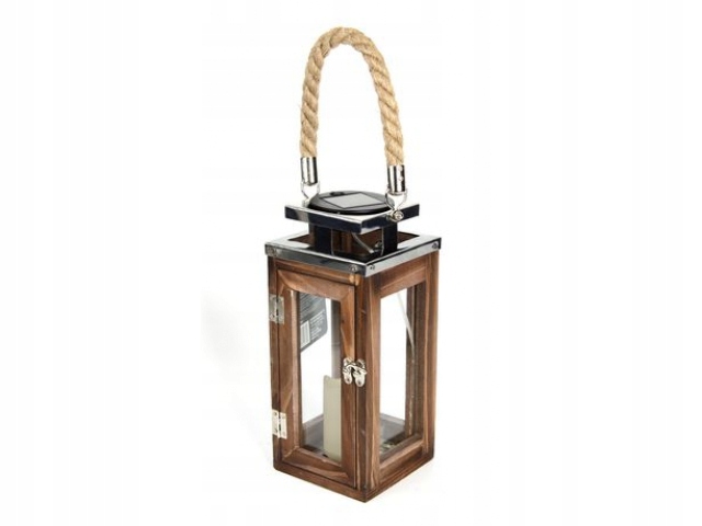 Latarnia wykonana jest z prawdziwego drewna, szkła oraz metalu. Rączka to pleciony sznur oraz metalowe okucia. Wewnątrz znajdziemy diodę led ukrytą w obudowie do złudzenia przypominającą prawdziwą świecę. Lampion oprócz panelu SOLARNEGO posiada również czujnik zmierzchu tak więc gdy zapada zmrok automatycznie zaczyna świecić a kiedy robi się jasno panel solarny doładowuje akumulator aby znów mógł świecić całą noc.