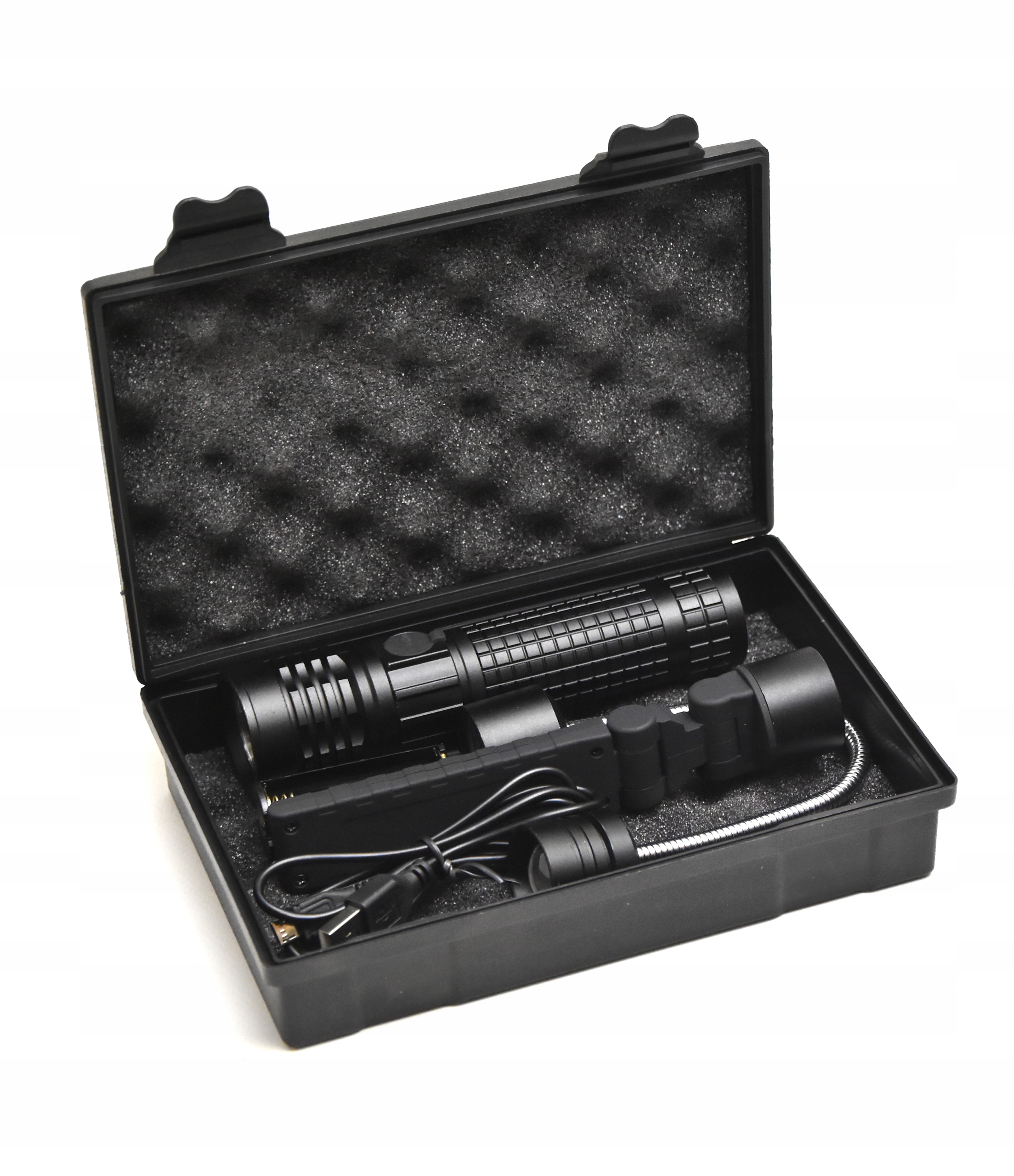 Ta wspaniała profesjonalna latarka ma 3 wymienne moduły, to tak jak byś posiadał 3 różne latarki, cały zestaw zapakowany jest w twarde taktyczne opakowanie