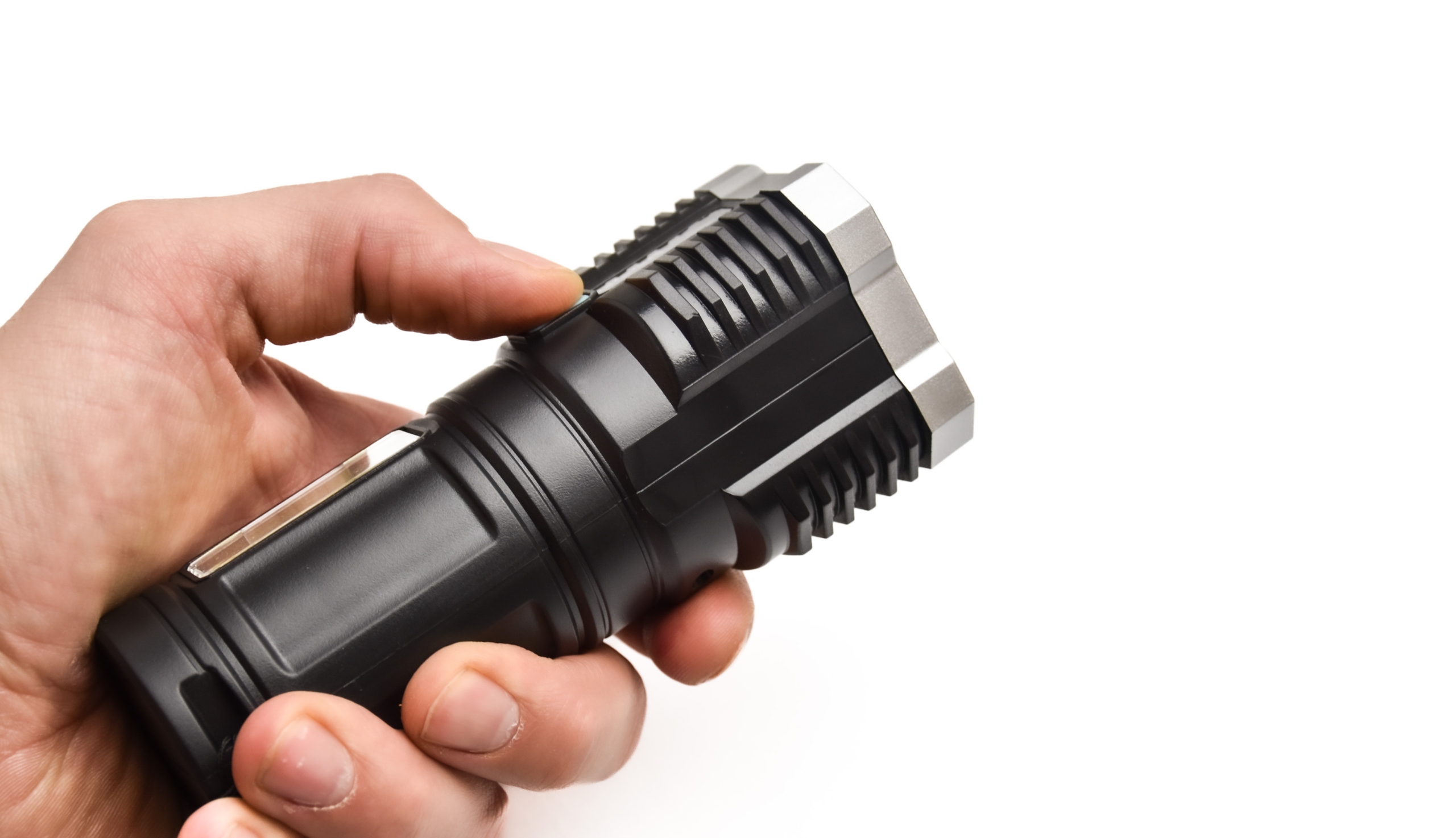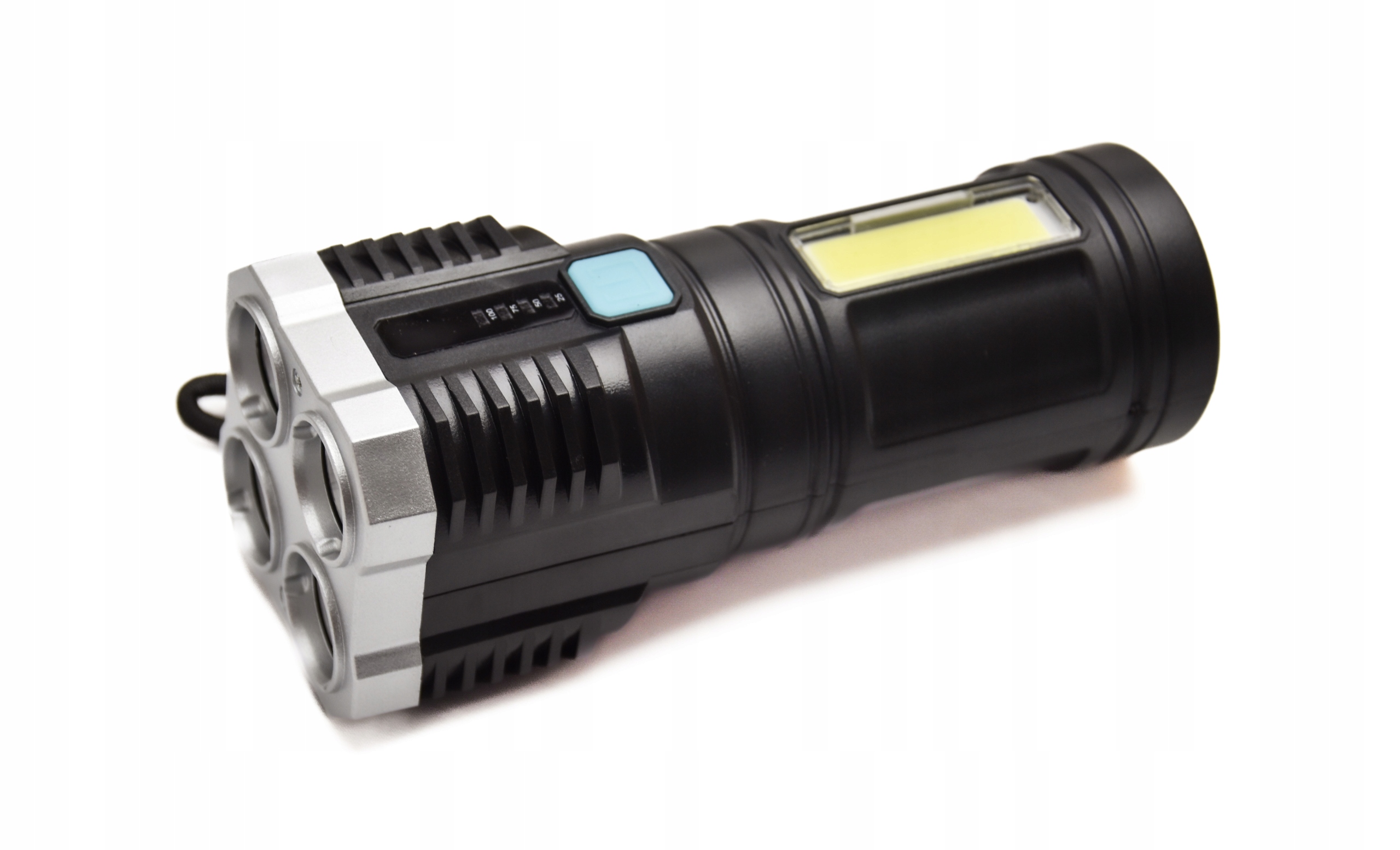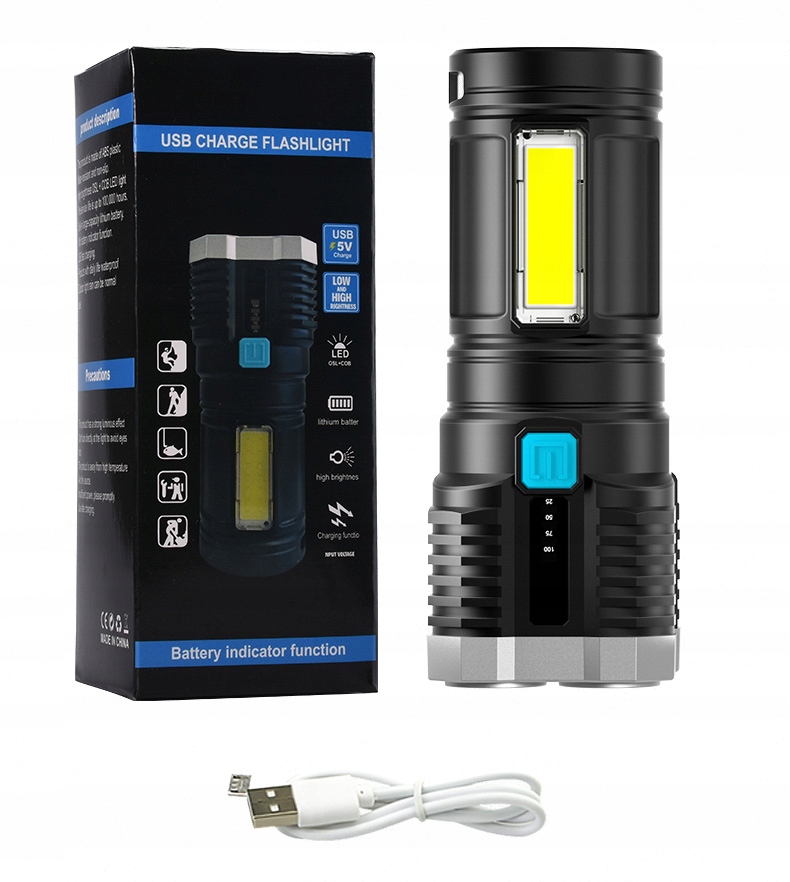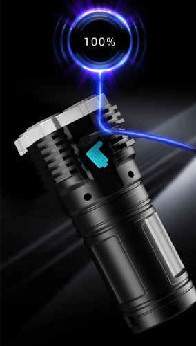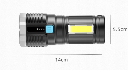 - Na boku latarki wmontowano mocną jasną i energooszczędną diodę COB