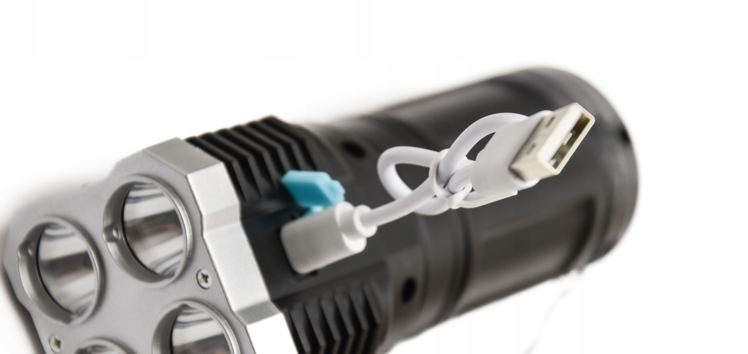 - Latarka ładowana jest poprzez złącze USB powszechnie stosowane na całym świecie miedzy innymi jako żródło zasilania