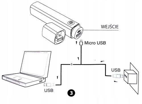 - Połącz jeden koniec dołączonego kabla micro USB z przenośną ładowarką. Aby rozpocząć ładowanie urządzenia połącz drugi koniec USB (np. Laptop)