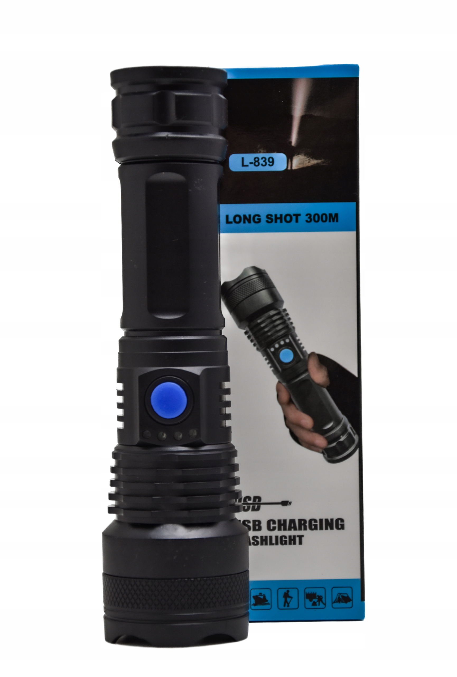 - Sieciowe lub USB: latarka posiada wejście mikro USB 5V (w zestawie kabel USB – mikro USB biały