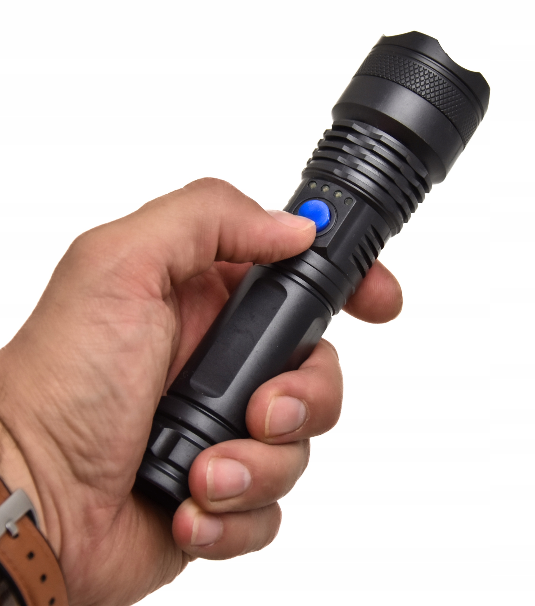 - Antypoślizgowa powierzchnia zapobiega ślizganiu latarki w dłoni