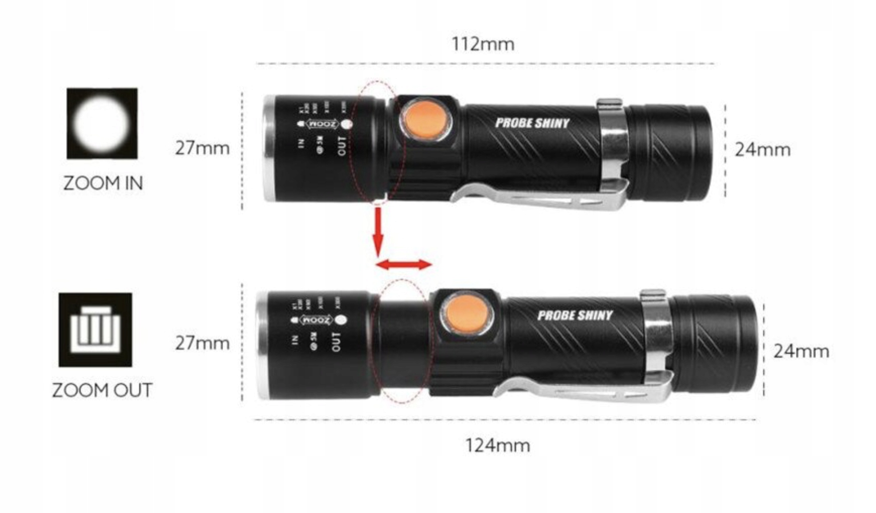 - Latarka posiada funkcje ZOOM (5x zoom)