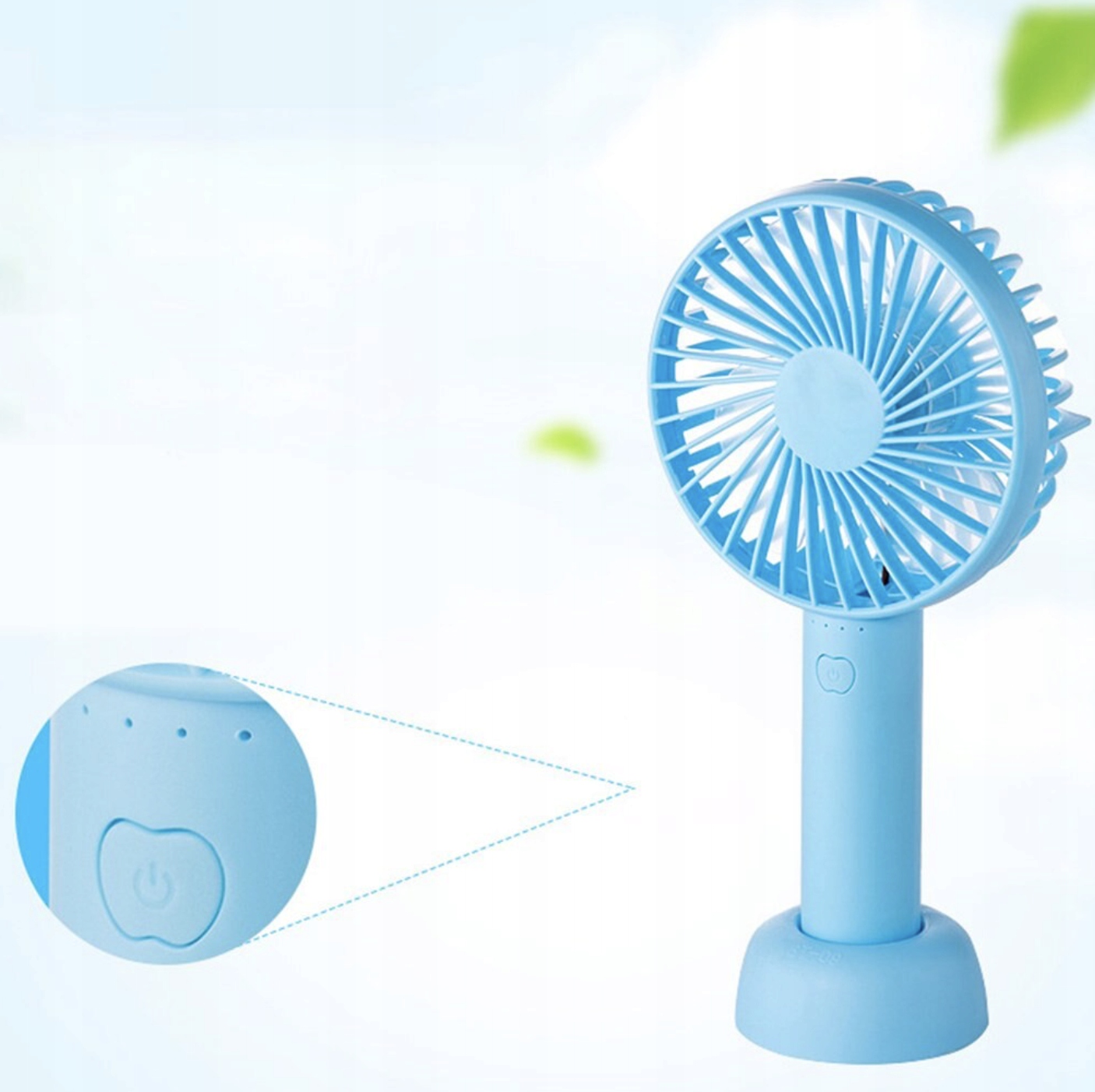 Wiatrak ręczny z akumulatorem i podstawką na biurko.