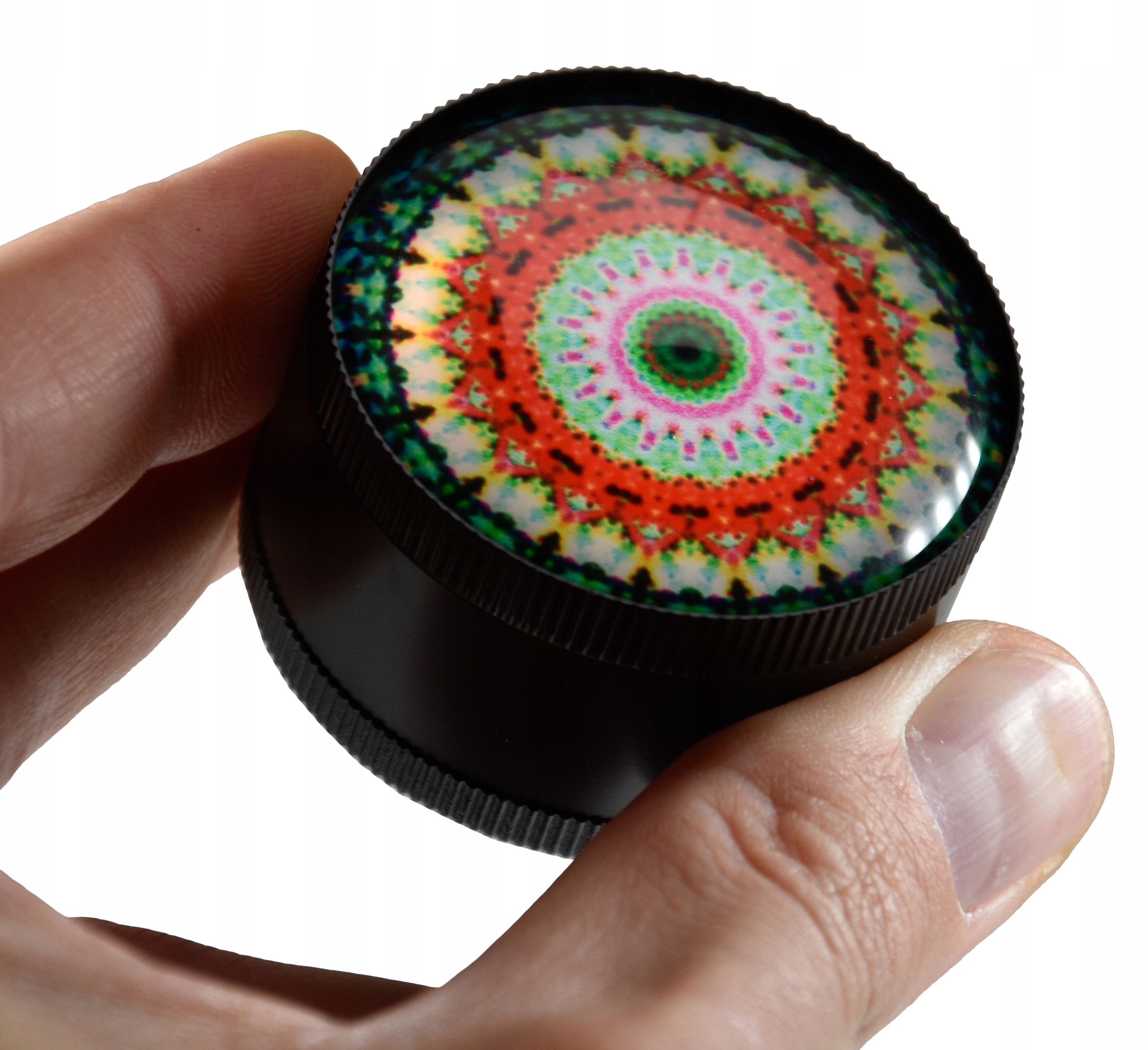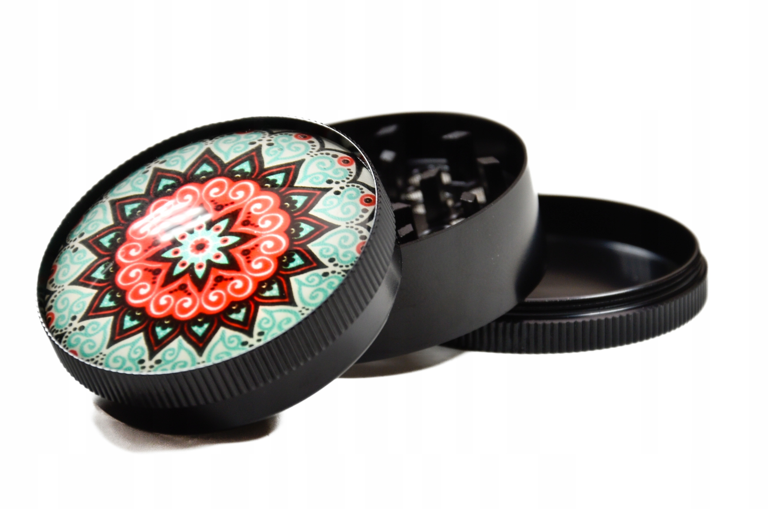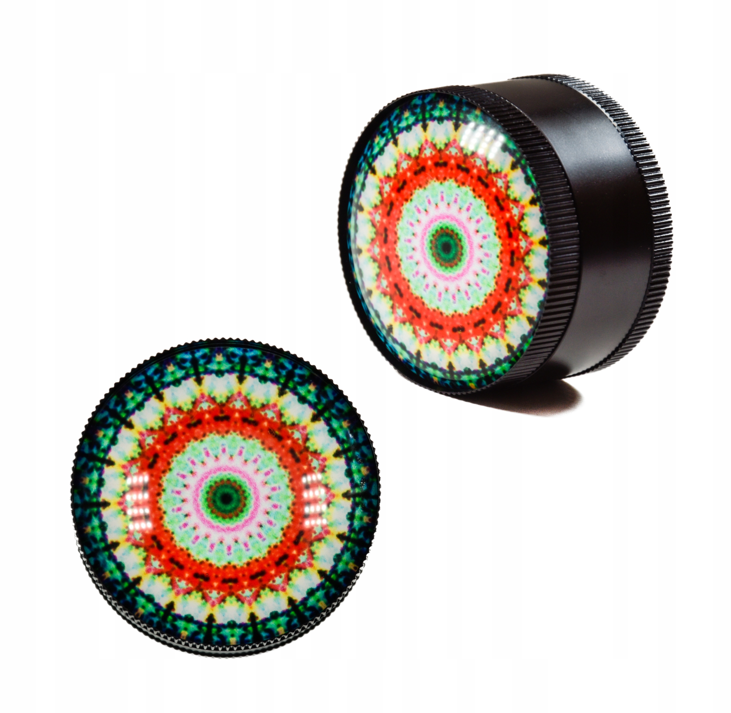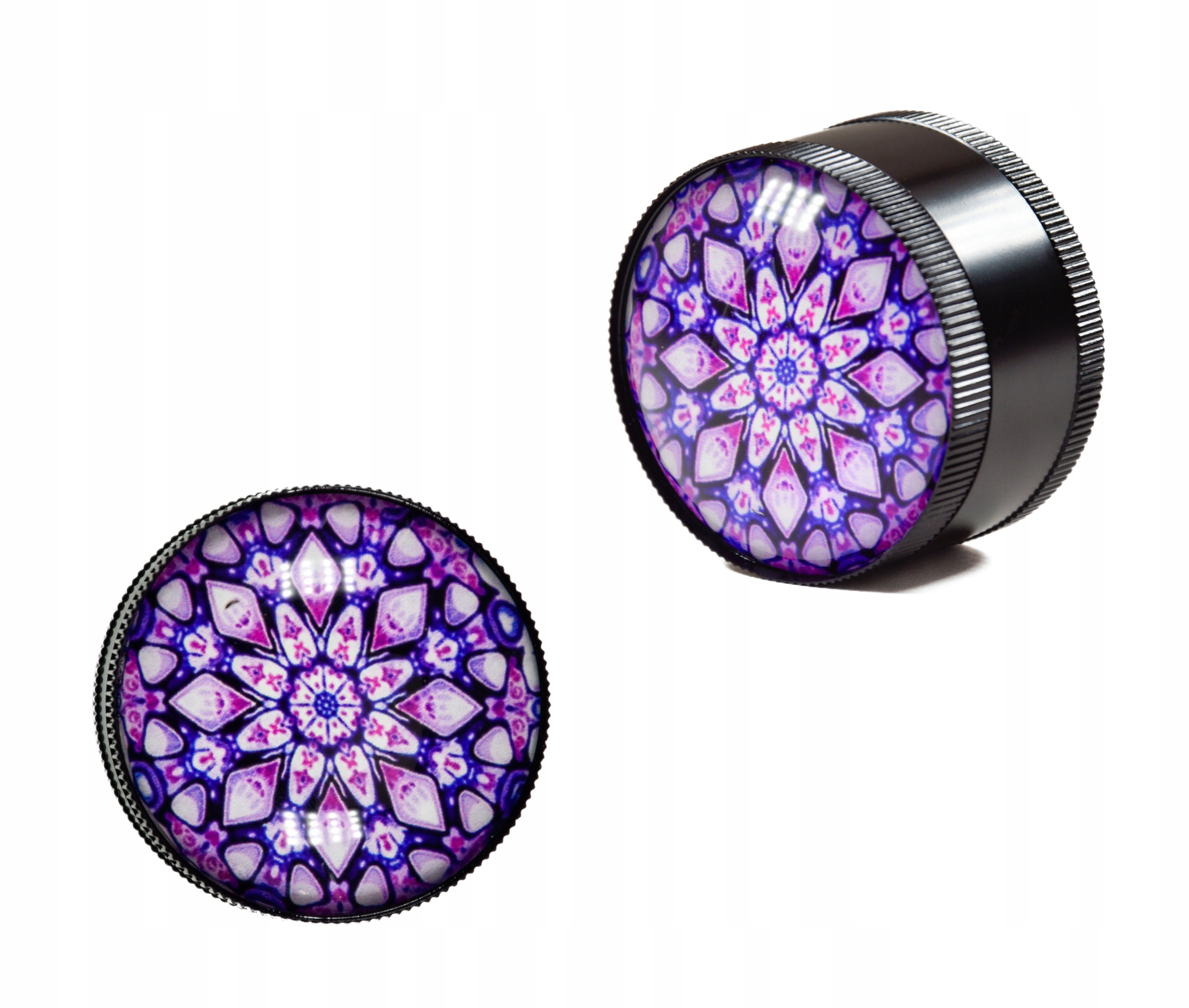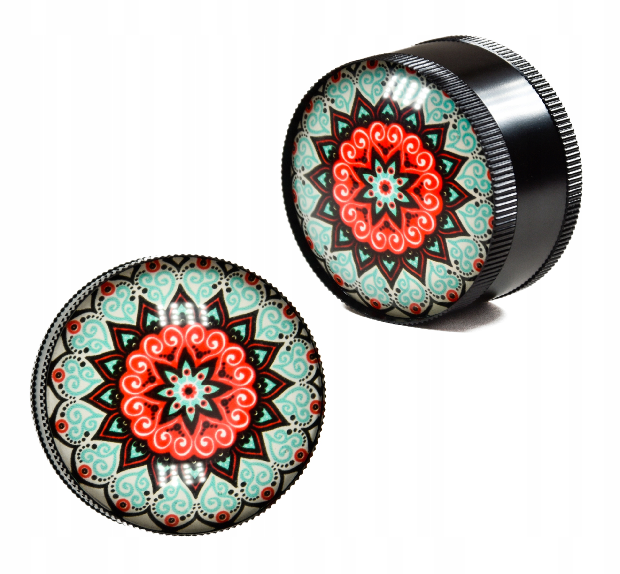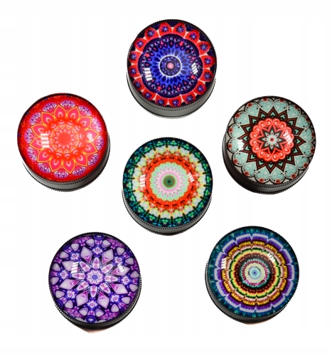 - Piękny młynek o średnicy 50mm zaprojektowany w stylu Mandala posiada piękną wypukłą pokrywę wykonaną ze szkła.