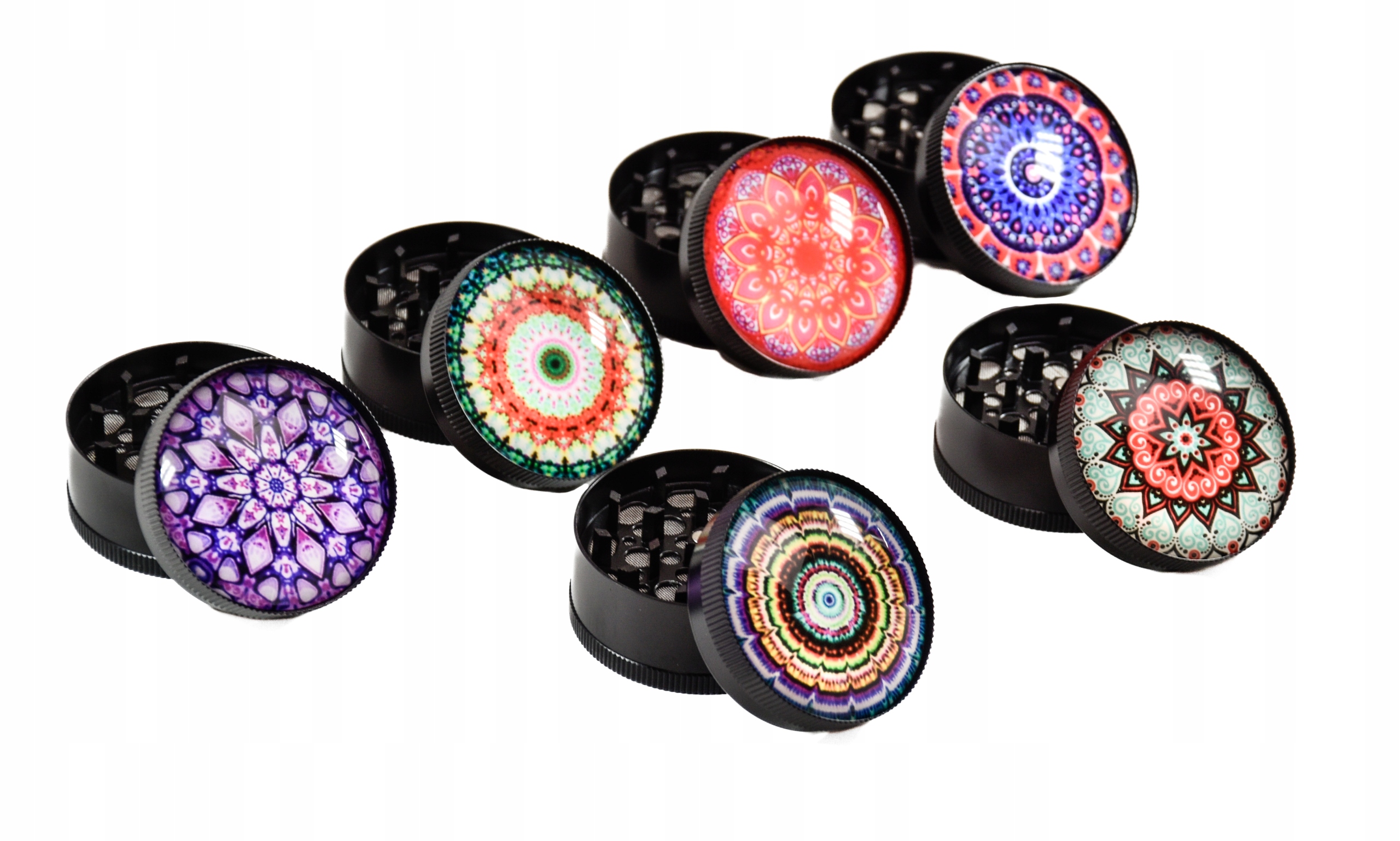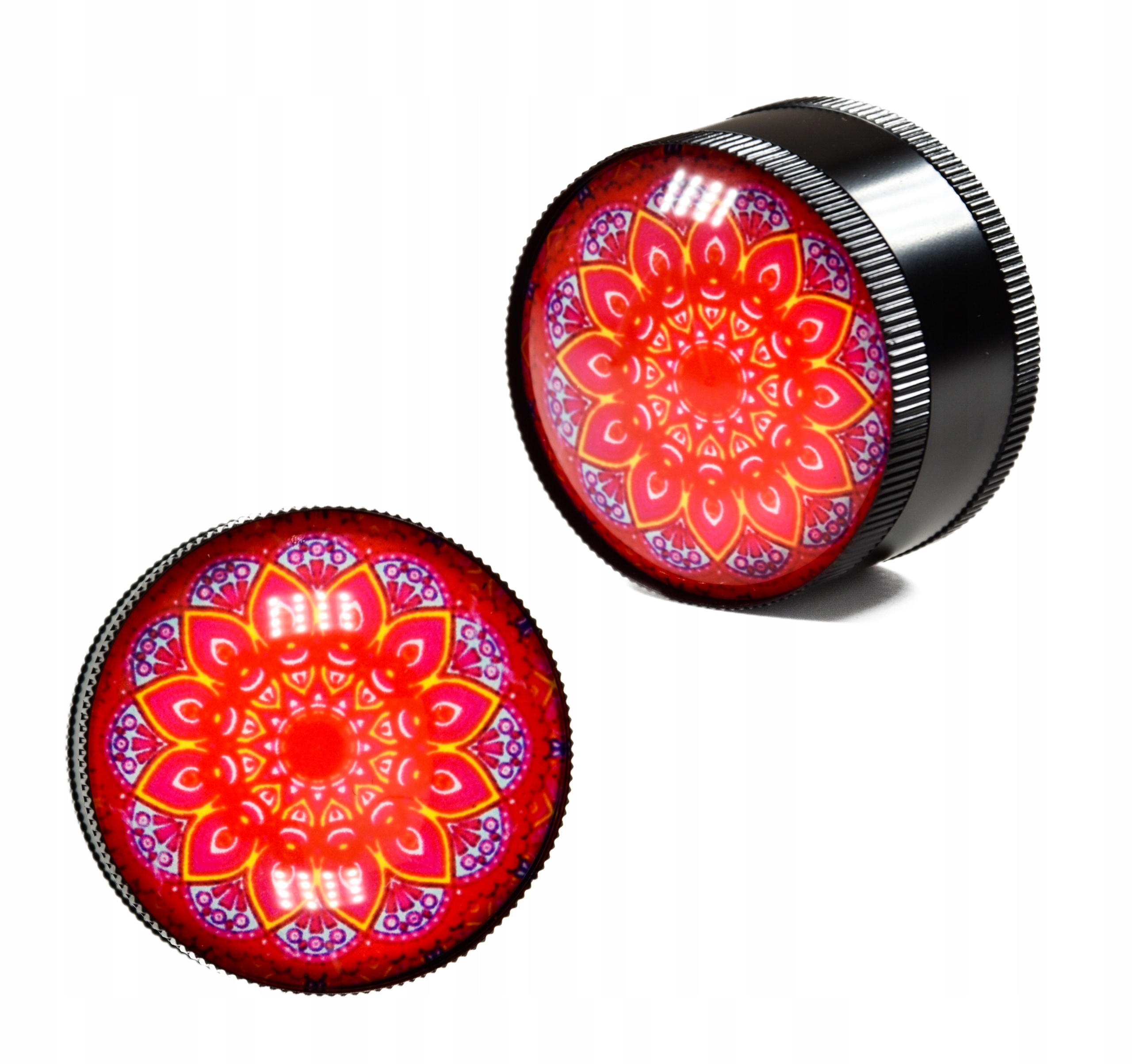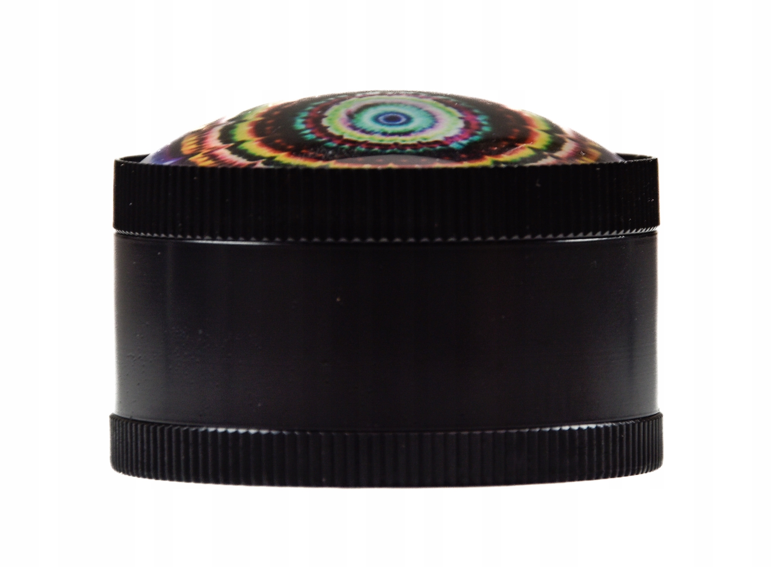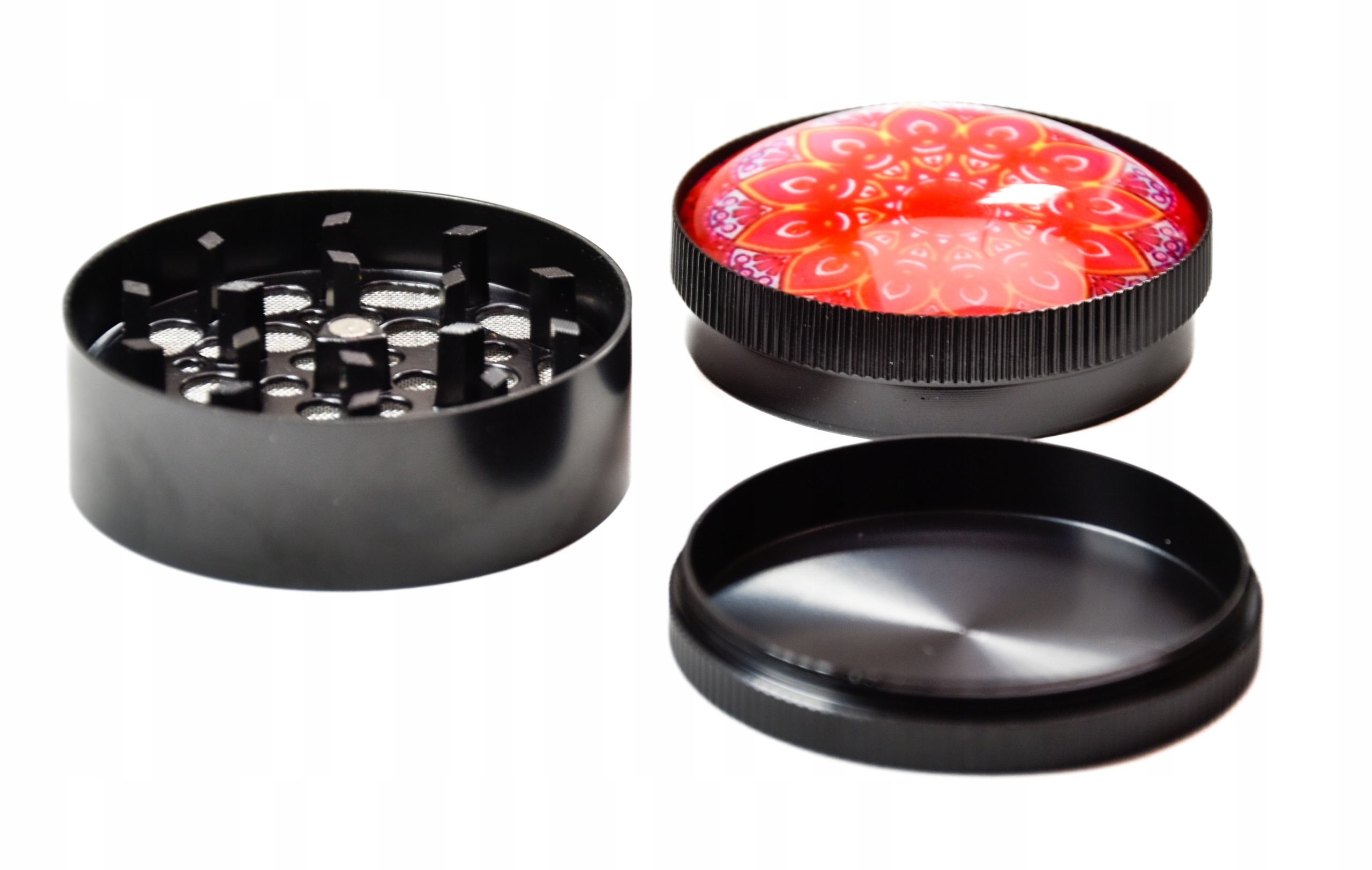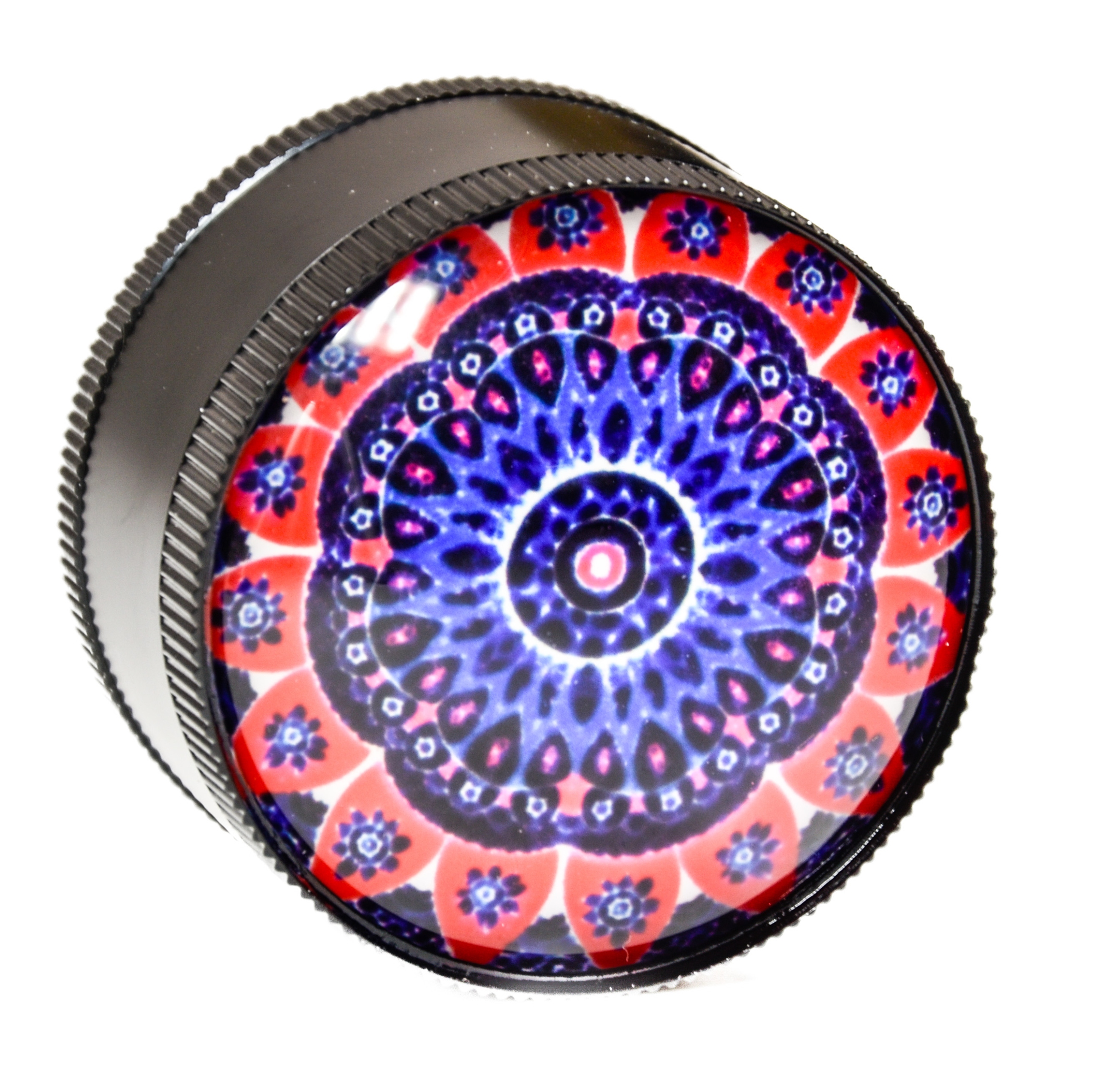 - Piękny młynek o średnicy 50mm zaprojektowany w stylu Mandala posiada piękną wypukłą pokrywę wykonaną ze szkła.