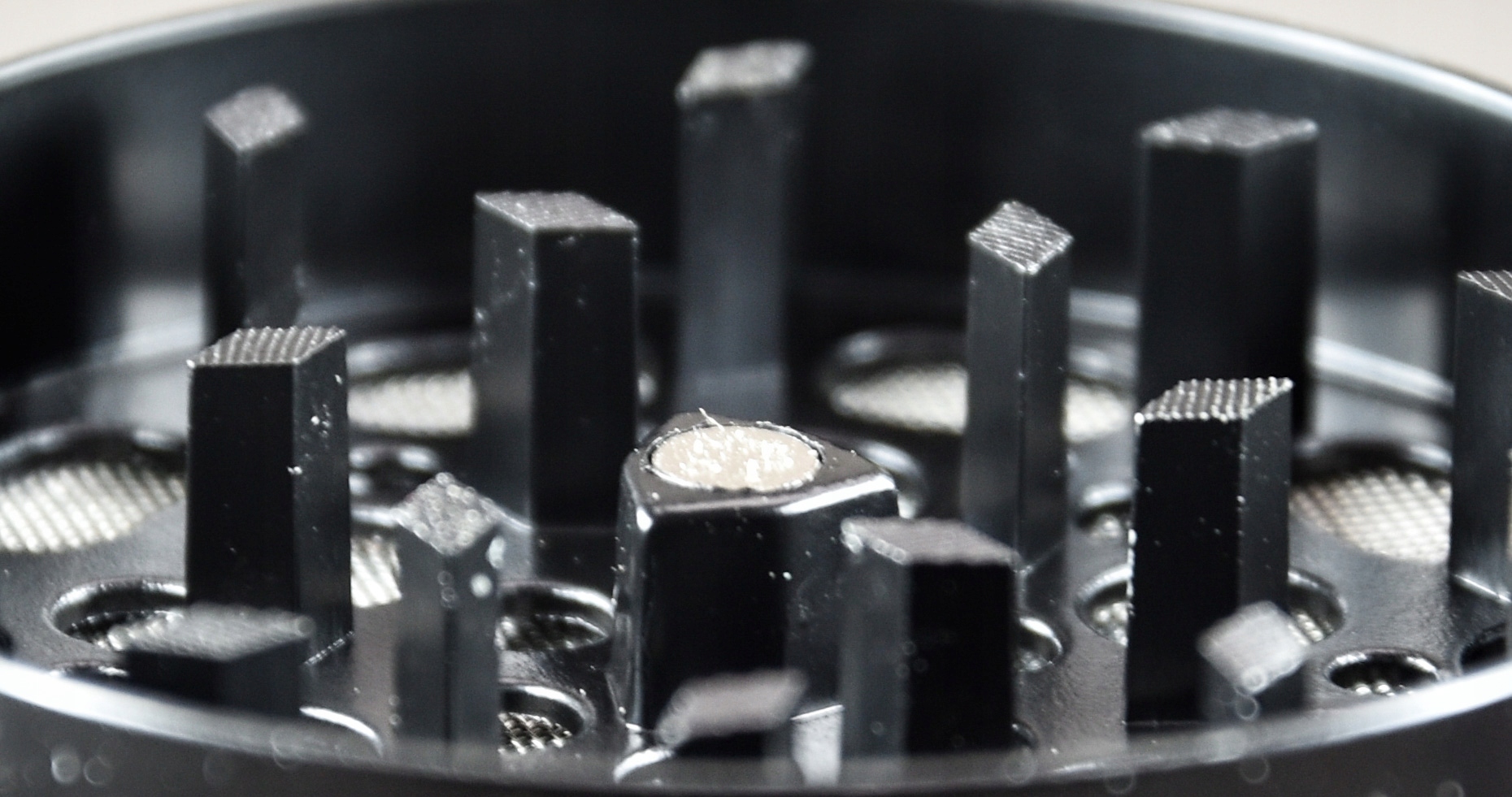- Młynek posiada 3 komory: pierwsza na porcję suszu do zmielenia, druga na już zmielone zioła oraz najniższy poziom przeznaczony do kolekcji pyłku.
