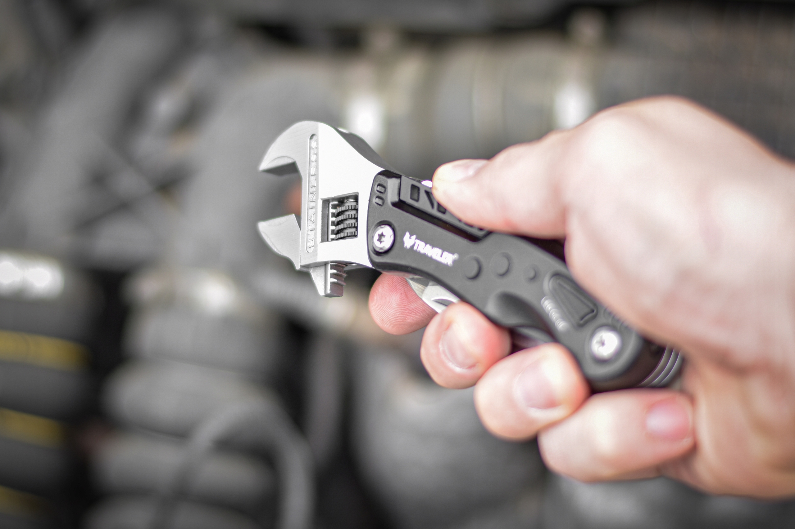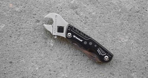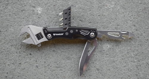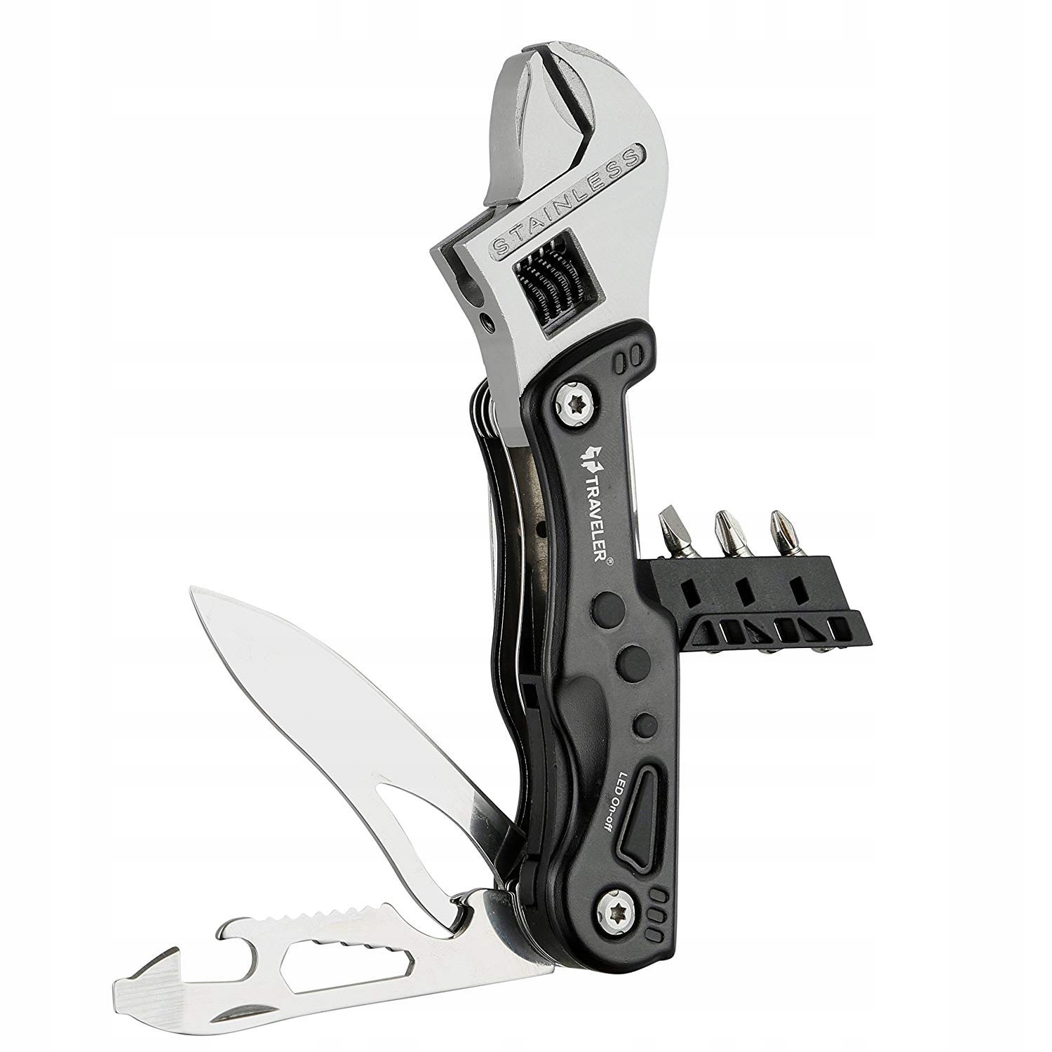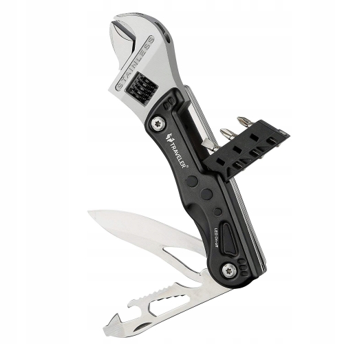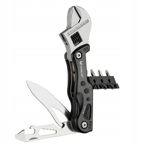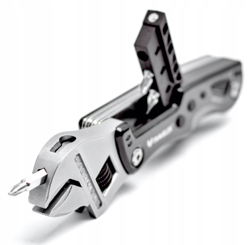 - Jest to niezbędne narzędzie każdego majsterkowicza, które warto mieć przy sobie w przypadku nagłych awarii. Zawiera bardzo dużo funkcji w jednym narzędziu, z czego najważniejszym jest klucz nastawny (francuski) . Dodatkowo posiada takie funkcje jak: nóż, komplet 3 bitów, uniwersalny klucz sześciokątny, płaski śrubokręt, piłę oraz otwieracz do butelek i puszek. W komplecie znajduje się również czarny, materiałowy pokrowiec na narzędzie.