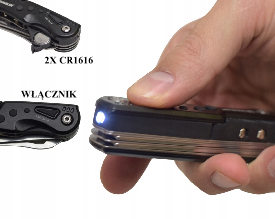 - W tym solidnym i niezawodnym narzędziu wielofunkcyjnym znajdziemy również latarkę led zasilaną dwoma bateriami CR1616 dodane do zestawu.