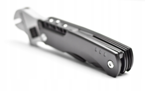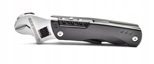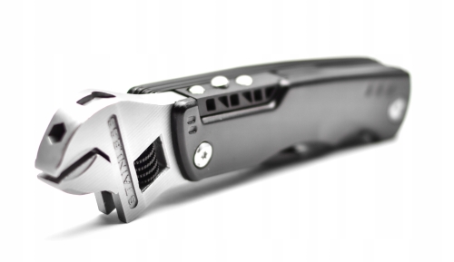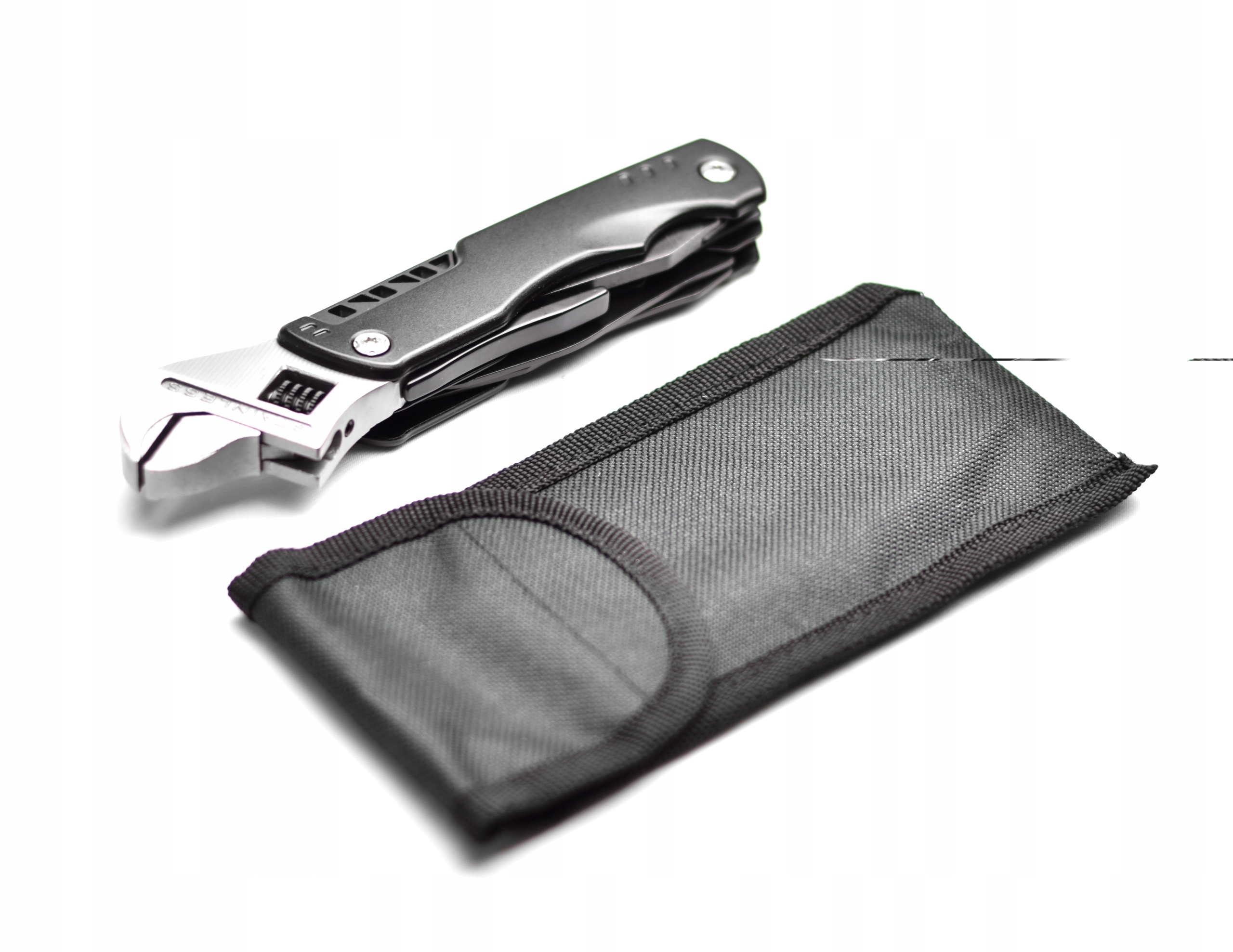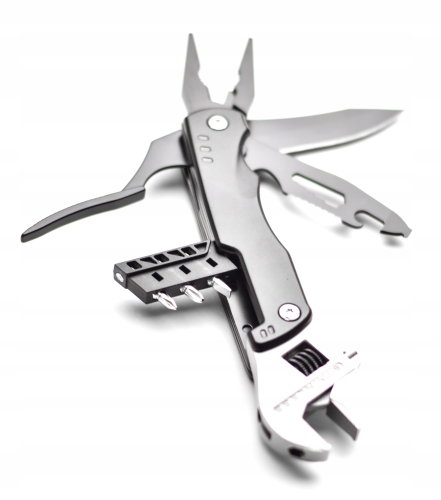 - Jest to niezbędne narzędzie każdego majsterkowicza, które warto mieć przy sobie w przypadku nagłych awarii. Zawiera bardzo dużo funkcji w jednym narzędziu, z czego najważniejszym jest klucz nastawny (francuski) i kombinerki (szczypce). Dodatkowo posiada takie funkcje jak: nóż, komplet 3 bitów, uniwersalny klucz sześciokątny, płaski śrubokręt, piłę oraz otwieracz do butelek i puszek. W komplecie znajduje się również czarny, materiałowy pokrowiec na narzędzie.