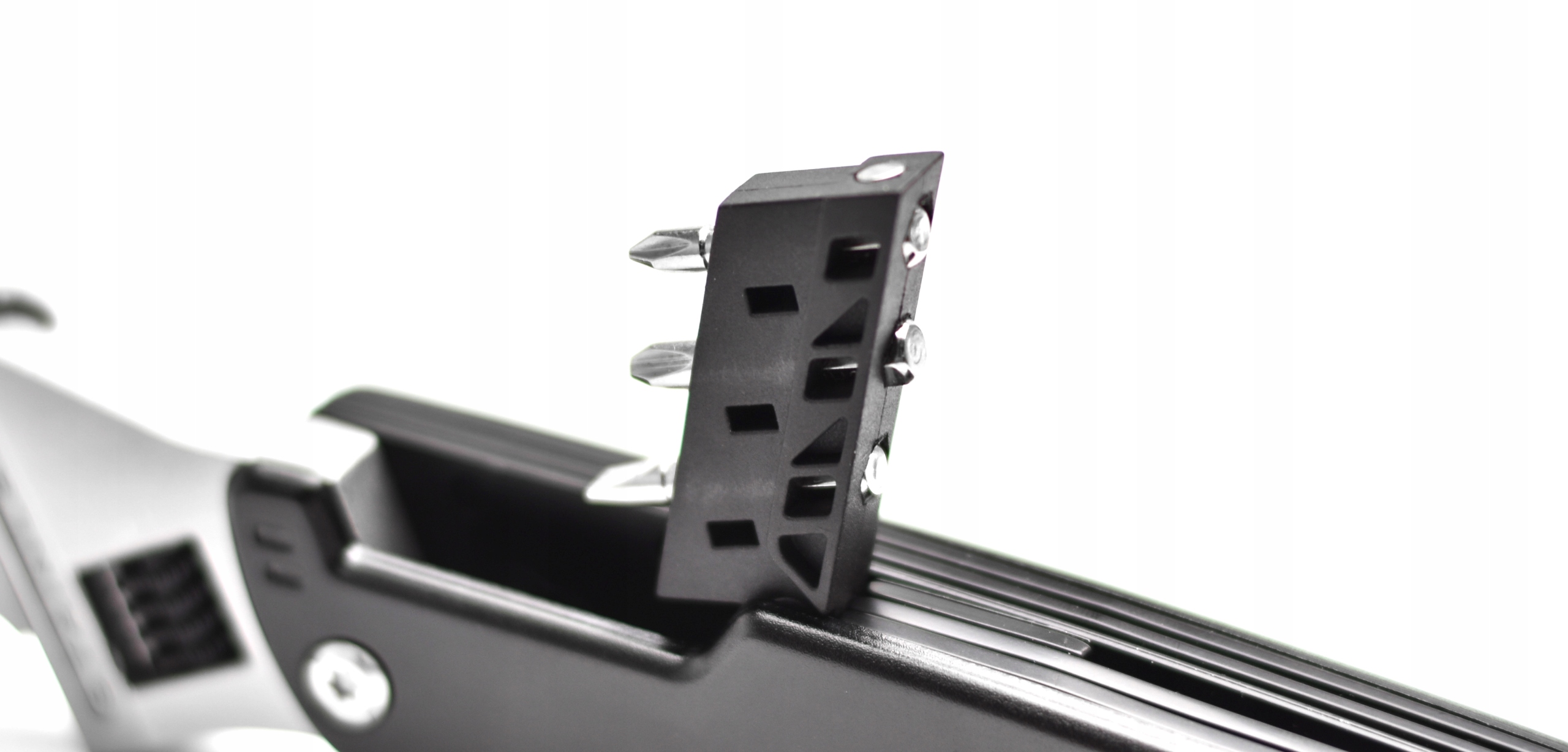 - 3 końcówki robocze - dwie końcówki philips (krzyżakowe) jedna płaska, przystosowane do wkręcania i wykręcania wkrętów, montowane są w czole klucza nastawnego gdzie znajduje się magnes który utrzymuje bit