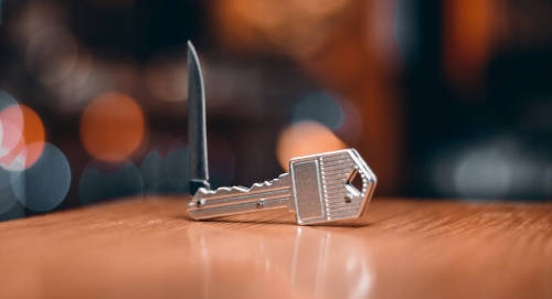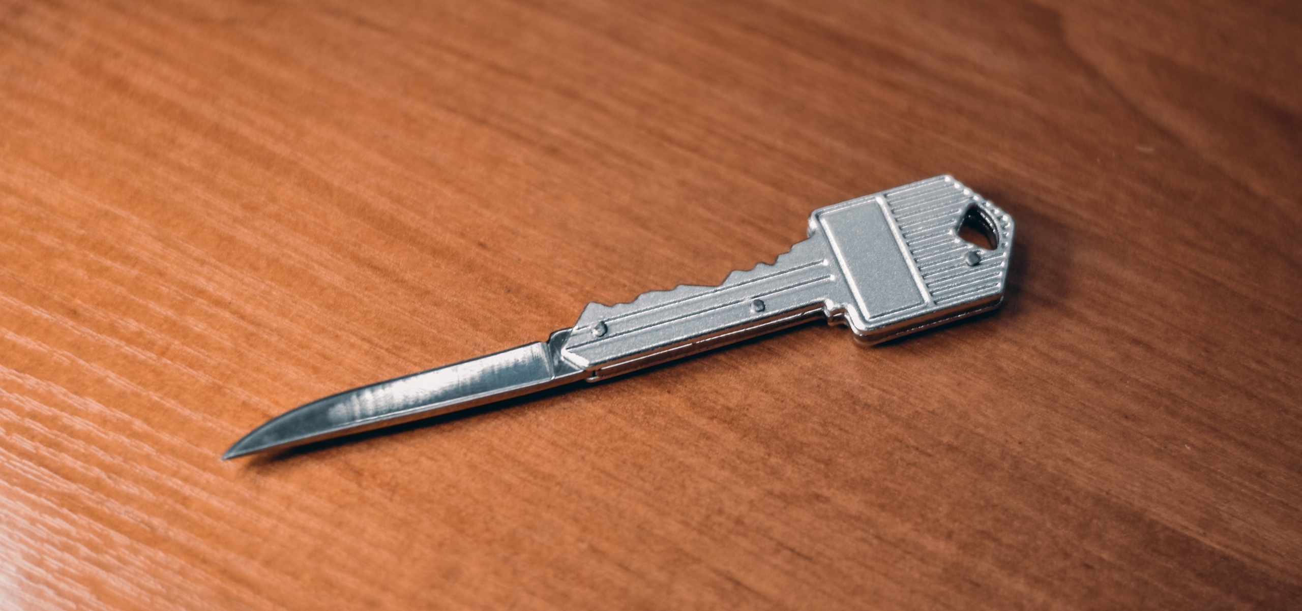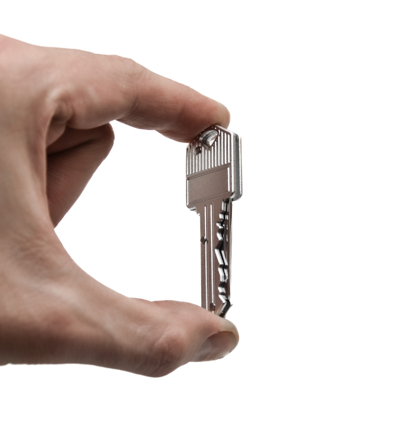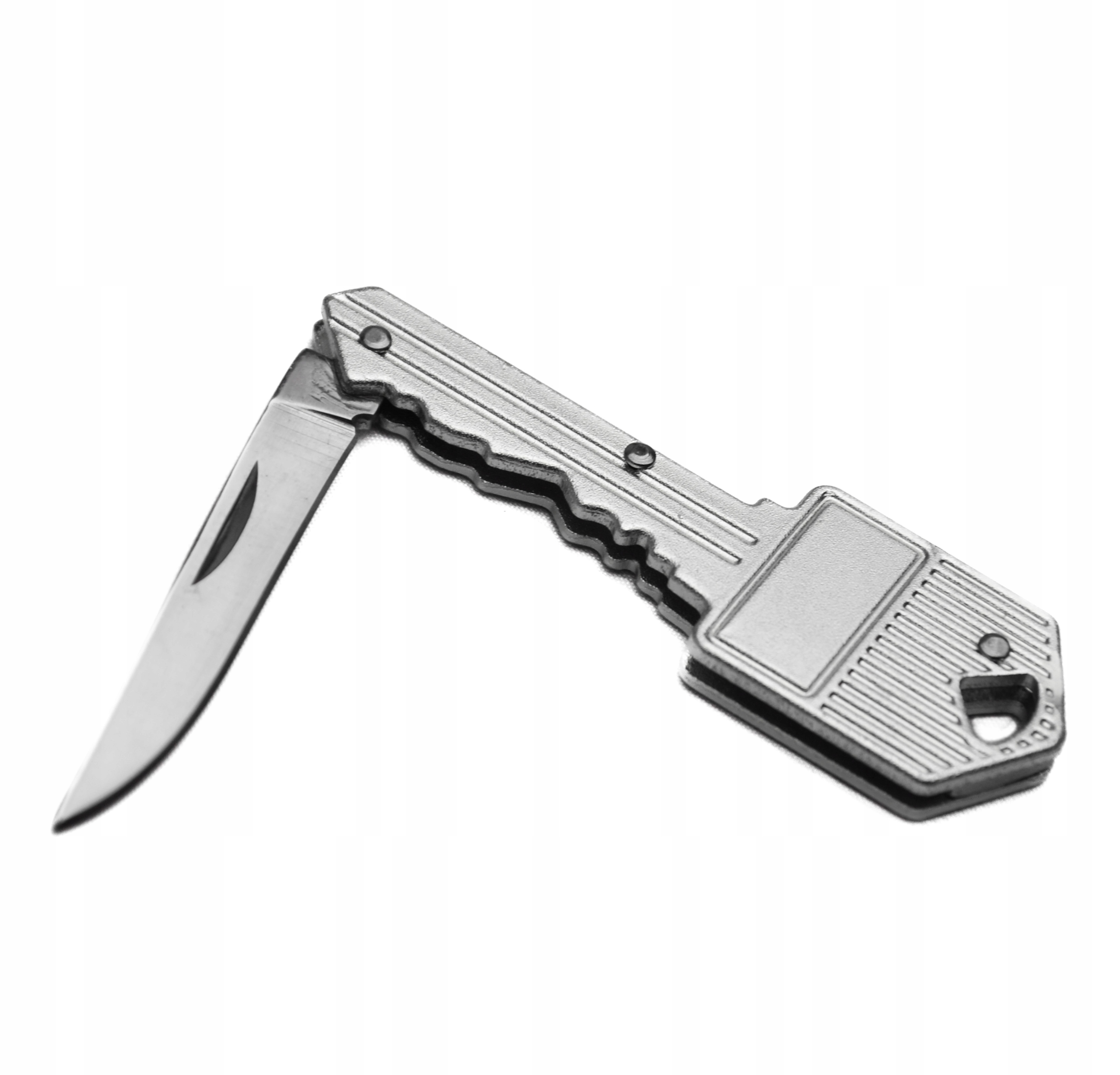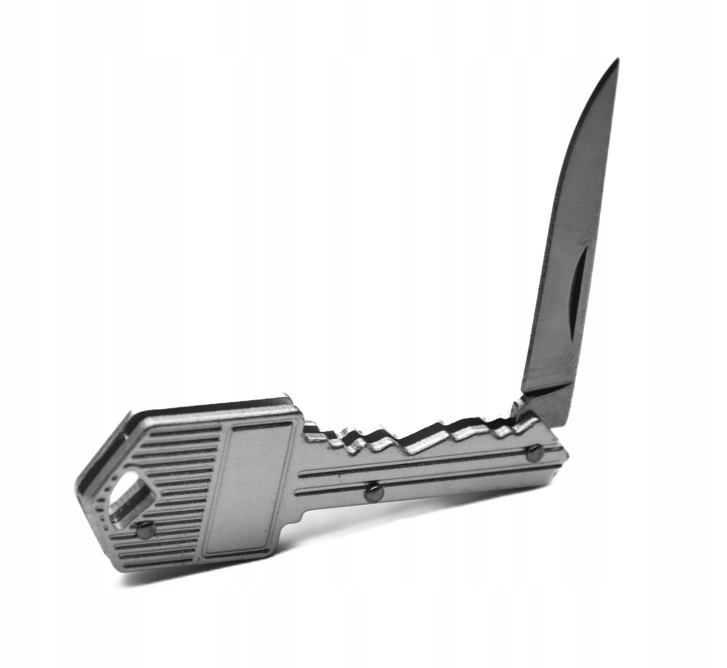 Lekki - płaski - składany nóż w kształcie klucza do drzwi - nie rzuca się w oczy w pęku kluczy - zawsze ze sobą! Idealny na prezent lub jako gadżet reklamowy.