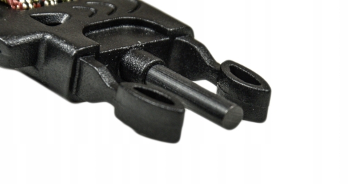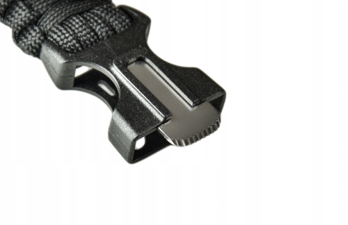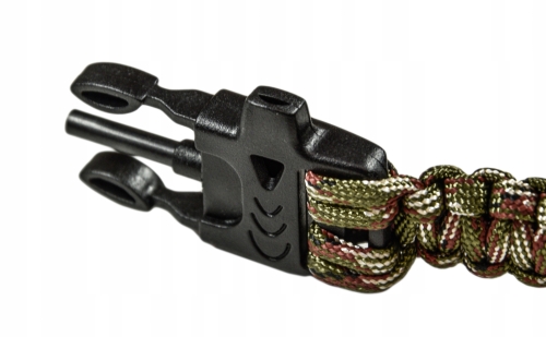 - Zapięcie stanowi klamra wyposażona w: miniaturowy nożyk, krzesiwo magnezowe oraz gwizdek ratunkowy. Po rozpleceniu bransoletki uzyskujemy około 4 metrów wielożyłowej, bardzo wytrzymałej linki.