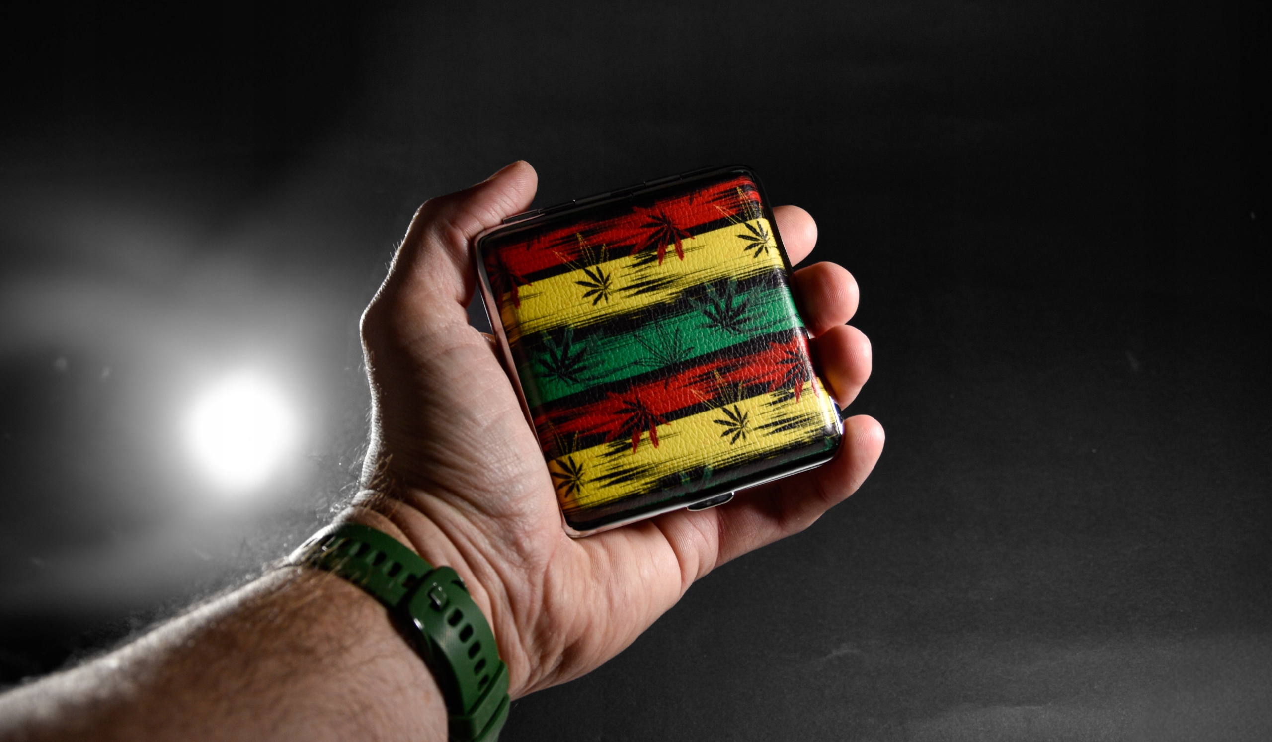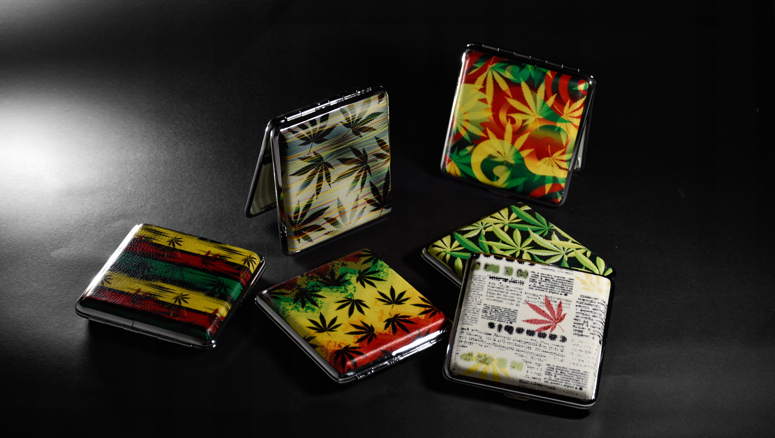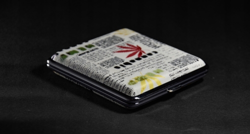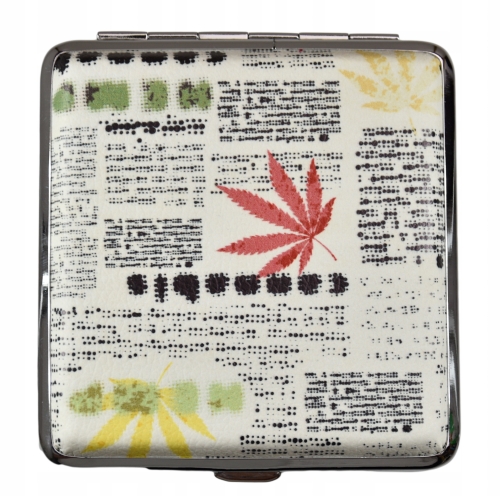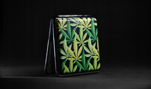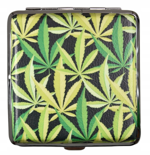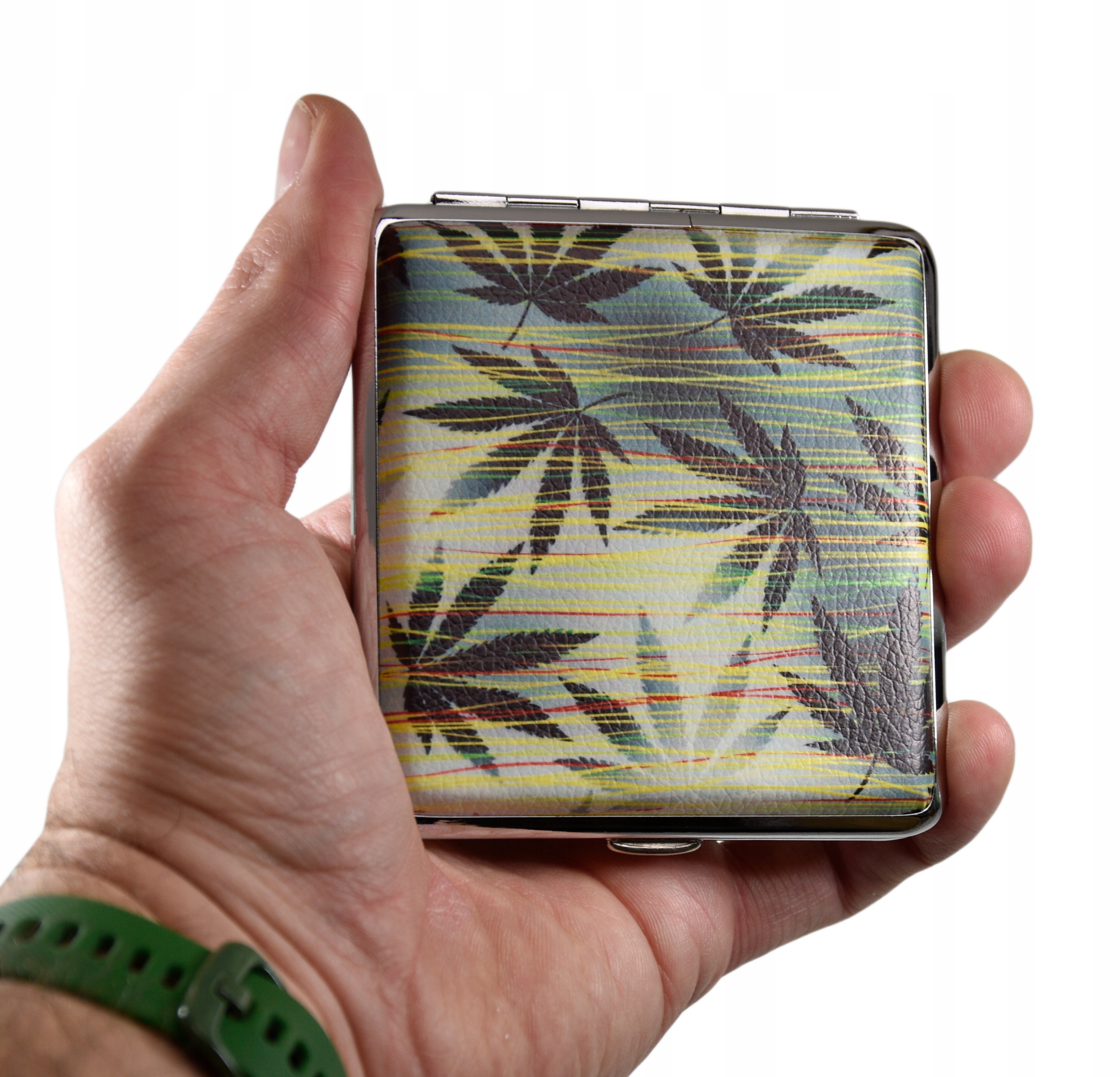 Papierośnica metalowa pokryta ekoskórą z tematyką THC