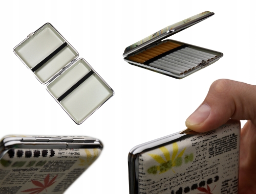 - Wewnątrz miejsce na 20 papierosów, które trzymają się dzięki gumce co sprawia, że papierosy nie gną się ani nie przecinają tak jak to ma miejsce w papierośnicach w których użyto blaszek przytrzymujących