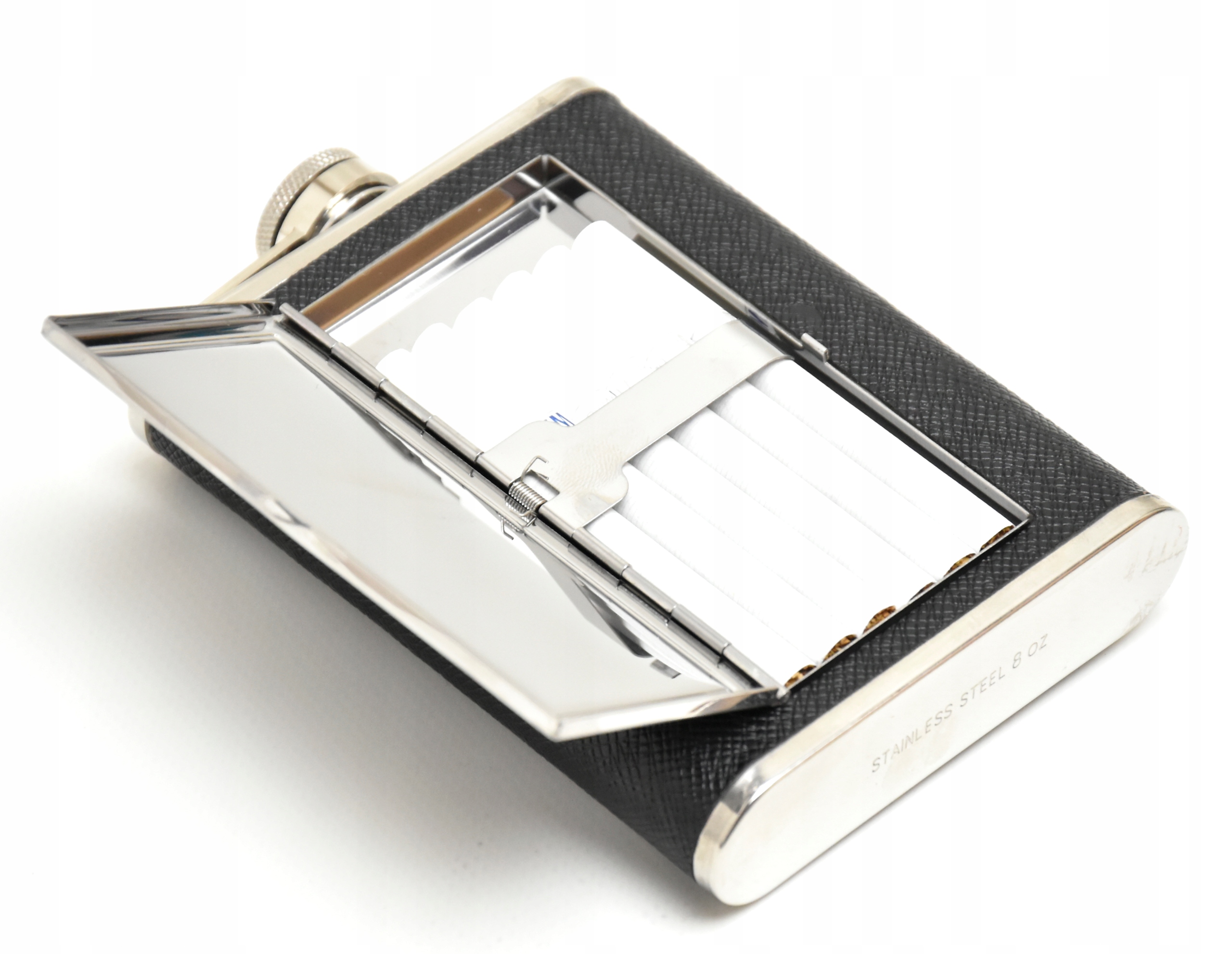 • Oprócz swojej normalnej funkcji piersiówka posiada ukrytą z przodu papierośnice która zmieści 6 papierosów standardowych, grubych, jak i setki.