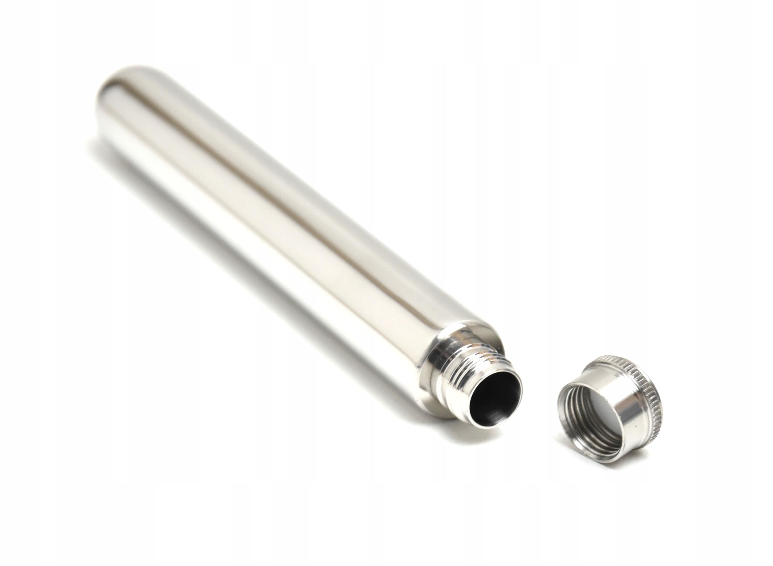 - Piersiówka o nietypowym kształcie, zaokrąglona na rogach, wykonana ze stali nierdzewnej, połyskowa.