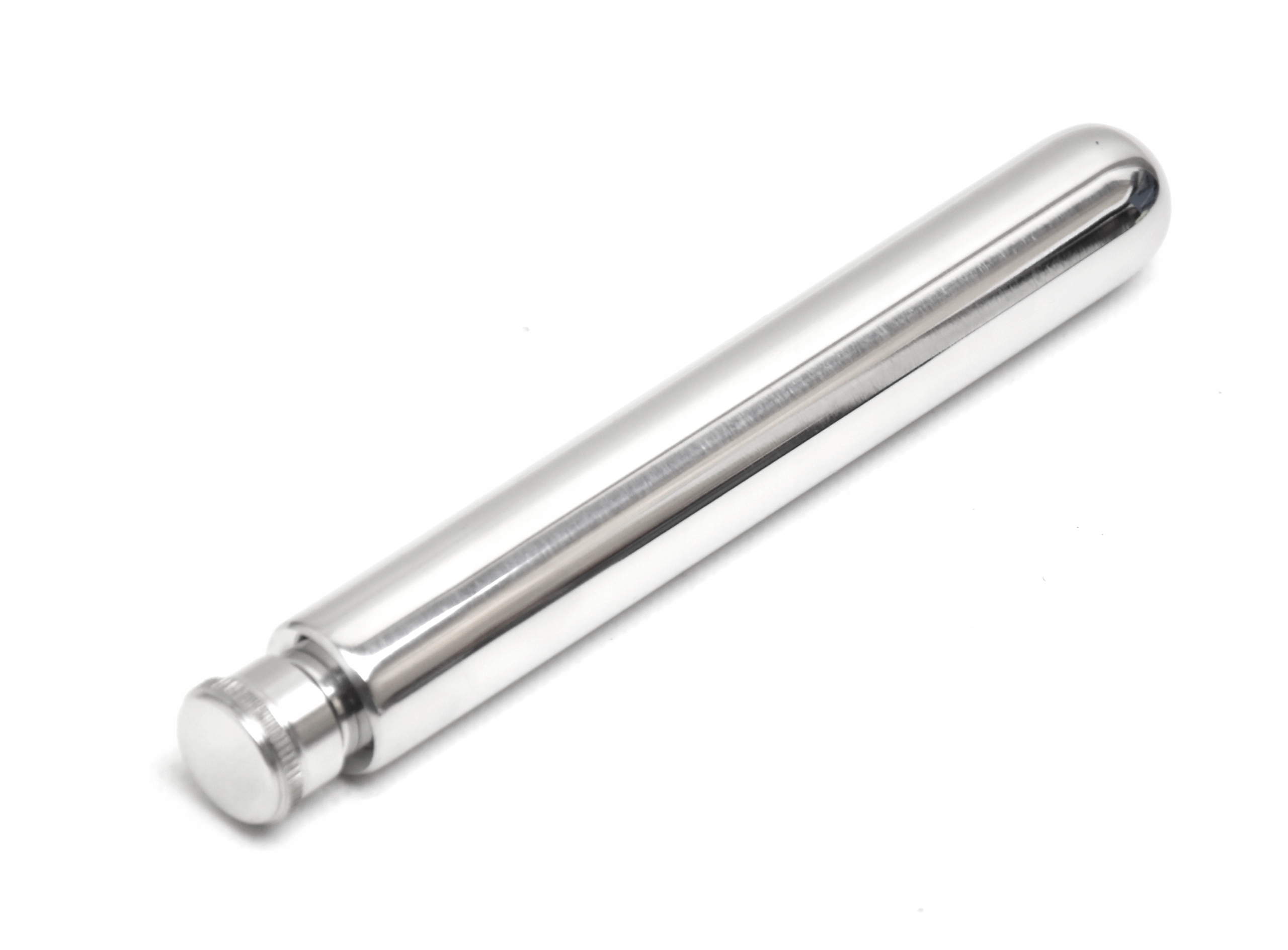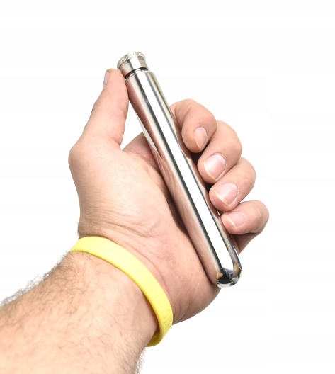 • Piersiówka o nietypowym kształcie, zaokrąglona na końcu, wykonana ze stali nierdzewnej, połyskowa.