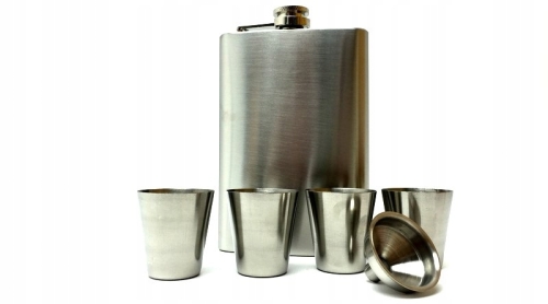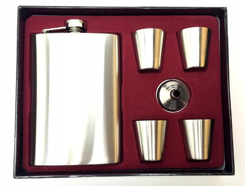 - Piersiówka jak i kieliszki wykonane są z nierdzewnej stali INOX, gładkie idealnie nadające się pod grawer.