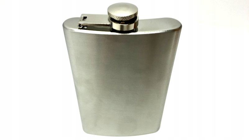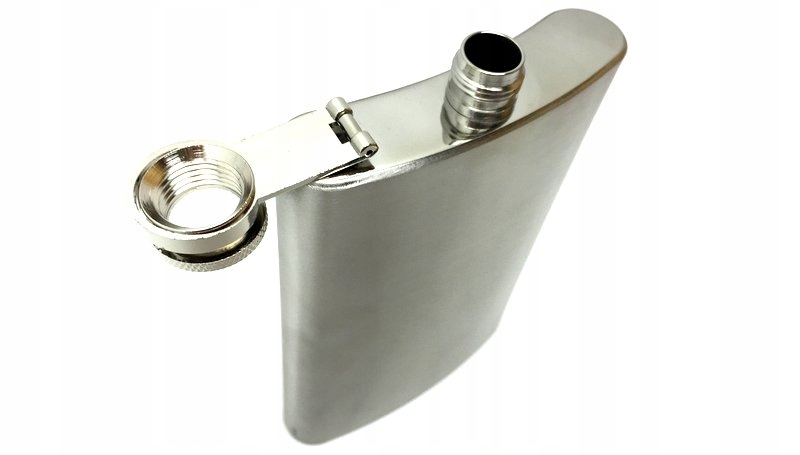 Piersiówka posiada zakręcany korek przymocowany na specjalnym zawiasie.