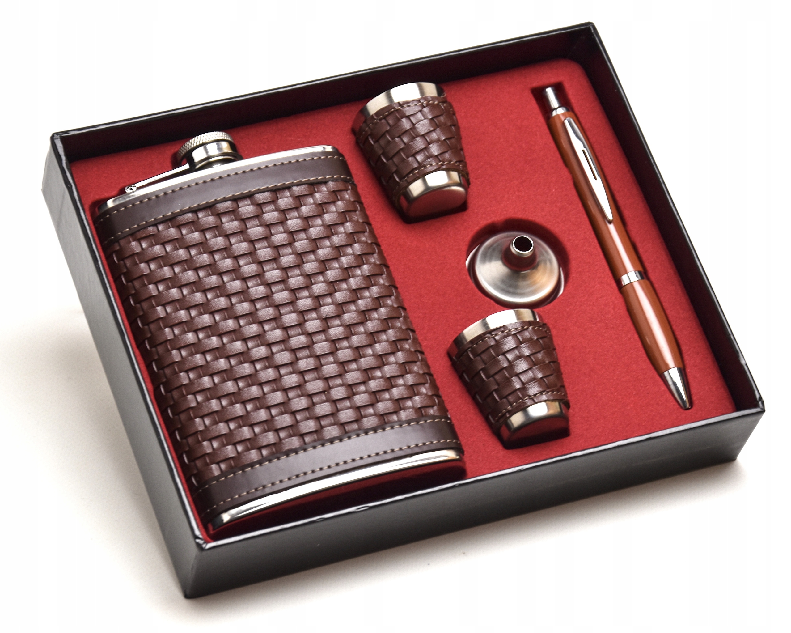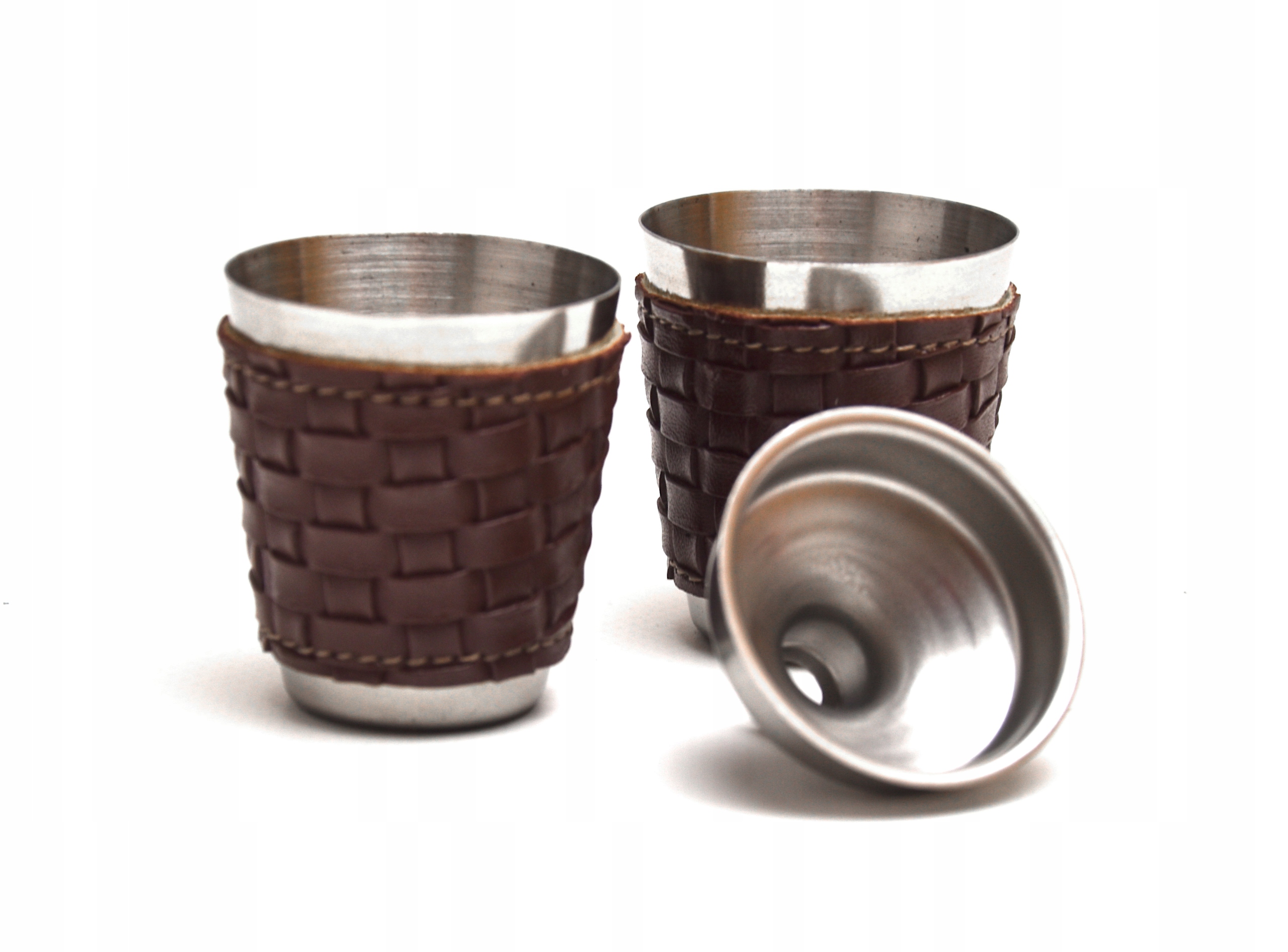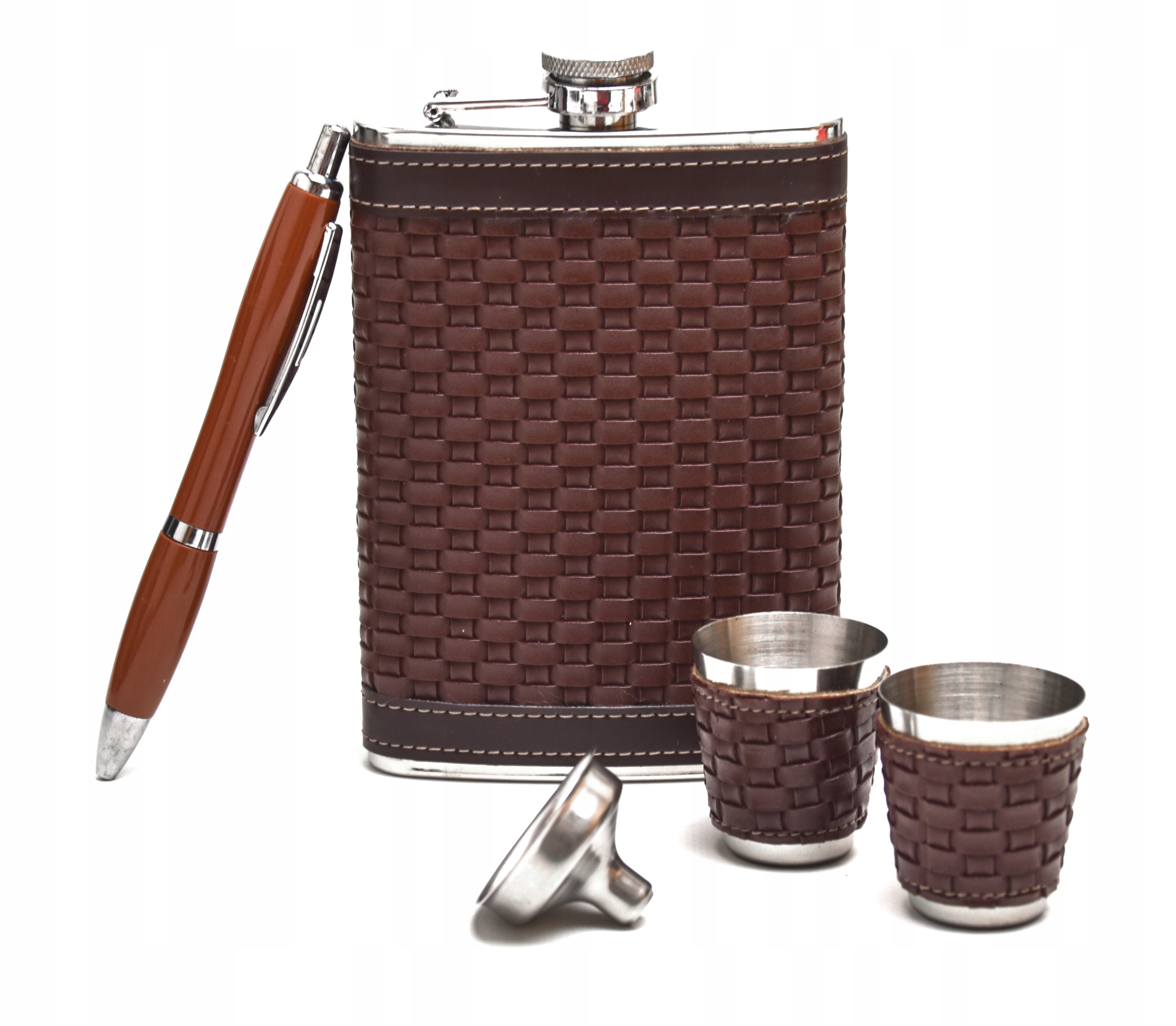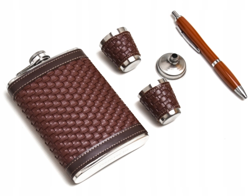- Piersiówka kieliszki oraz lejek wykonane są ze stali nierdzewnej stal-inox i pokryte zostały miękką ekoskórą