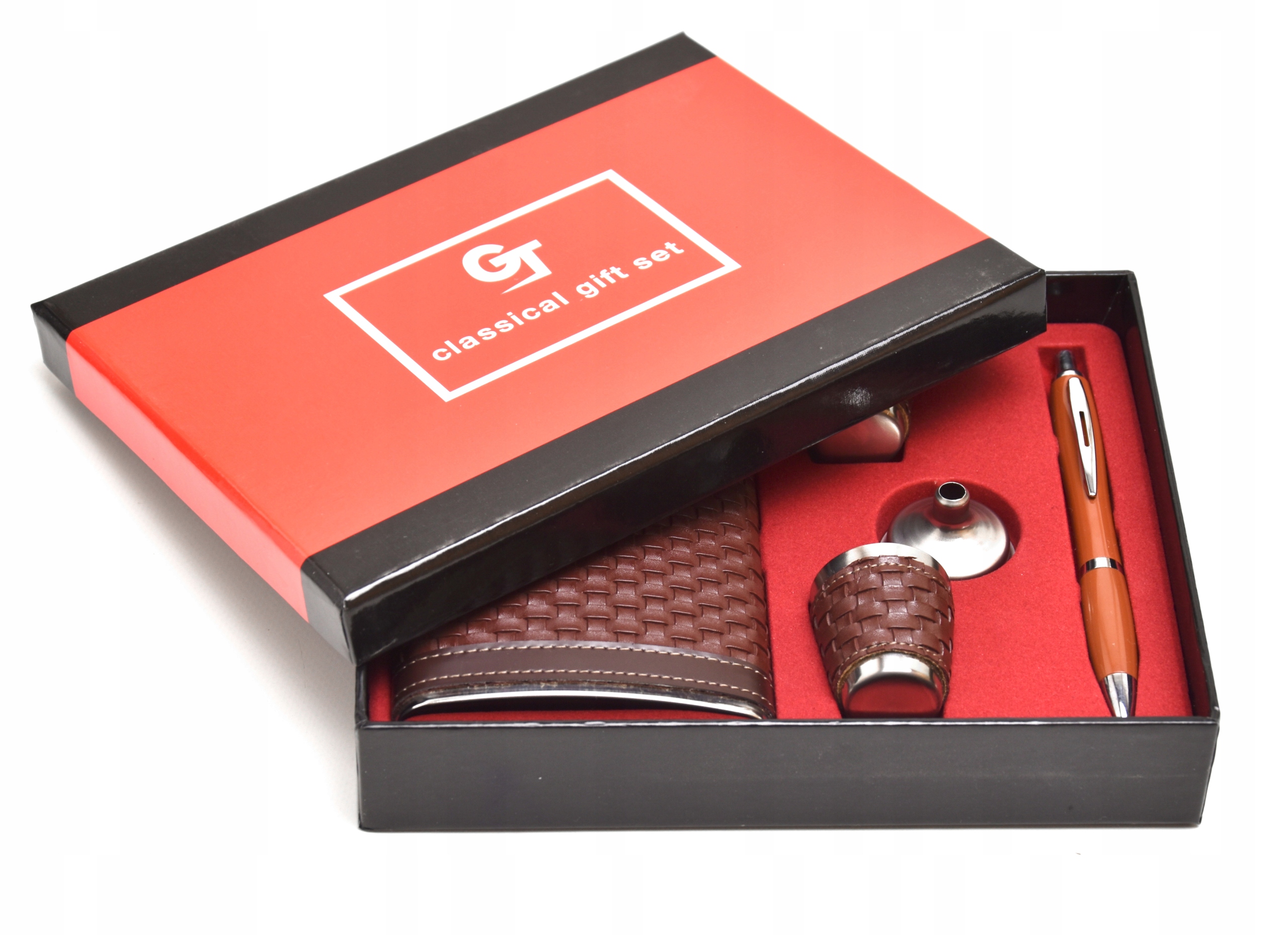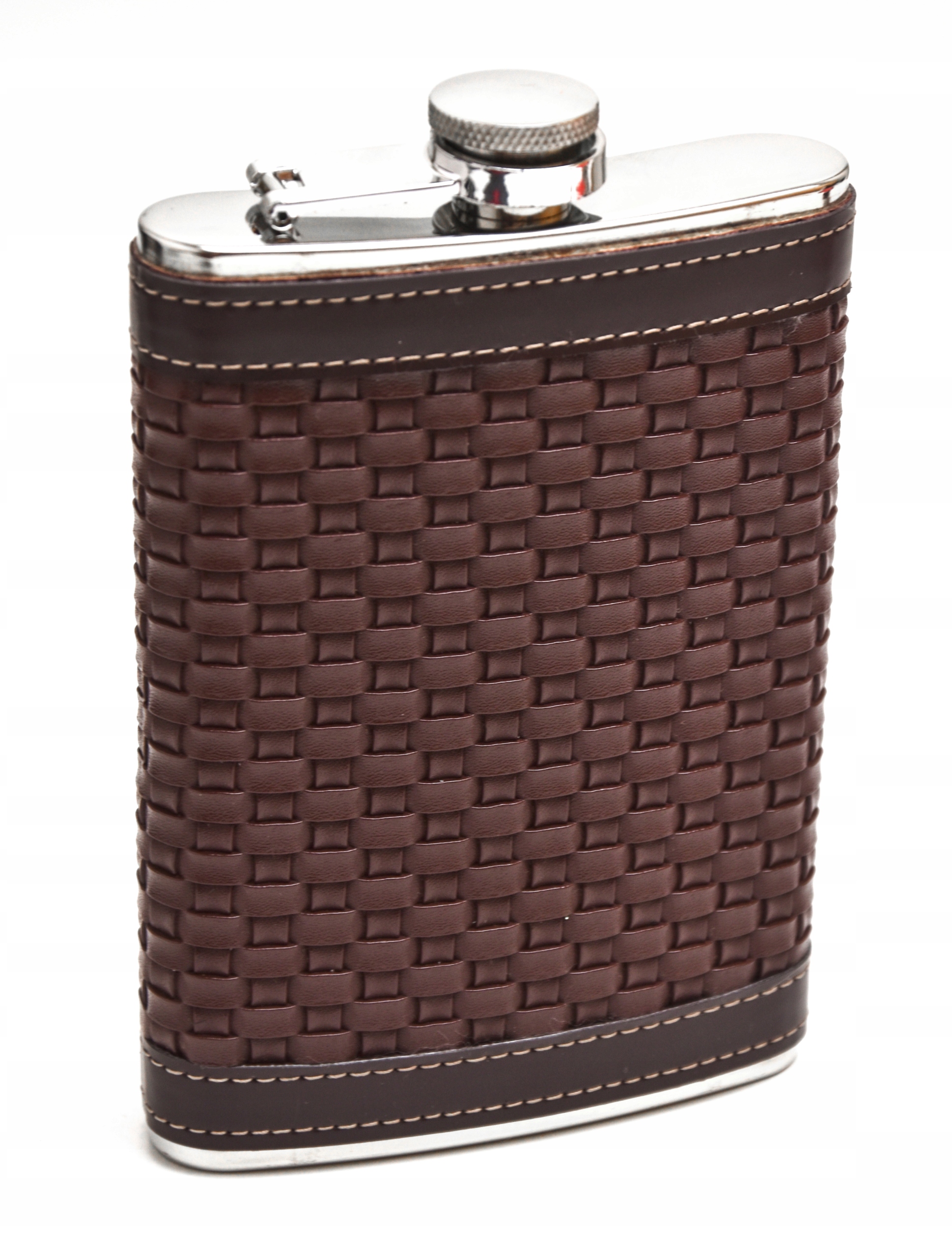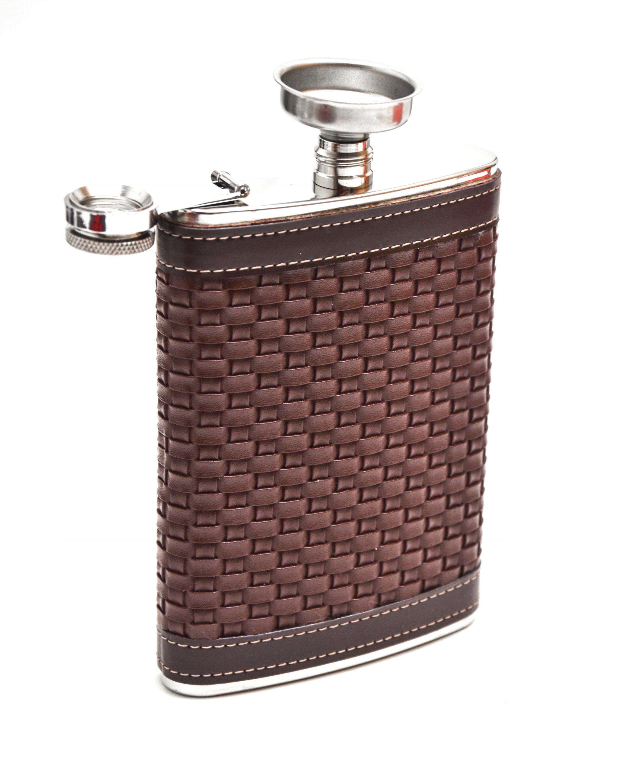 - Piersiówka kieliszki oraz lejek wykonane są ze stali nierdzewnej stal-inox i pokryte zostały miękką ekoskórą
