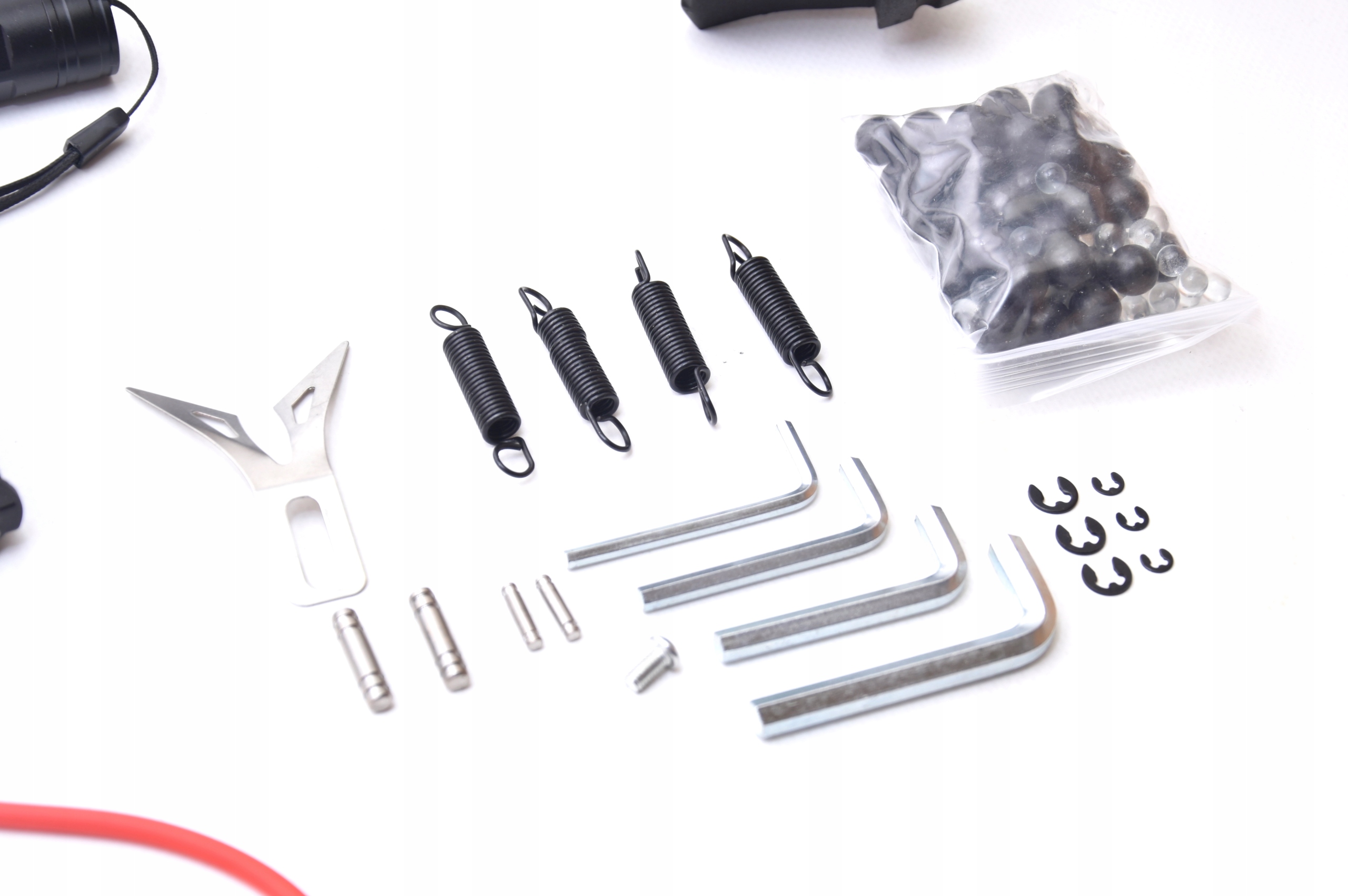 - System sprężyn i podwójnych gum pozwala na jeszcze mocniejszy naciąg a co za tym idzie dalszy zasięg strzału z kulek lub strzał!