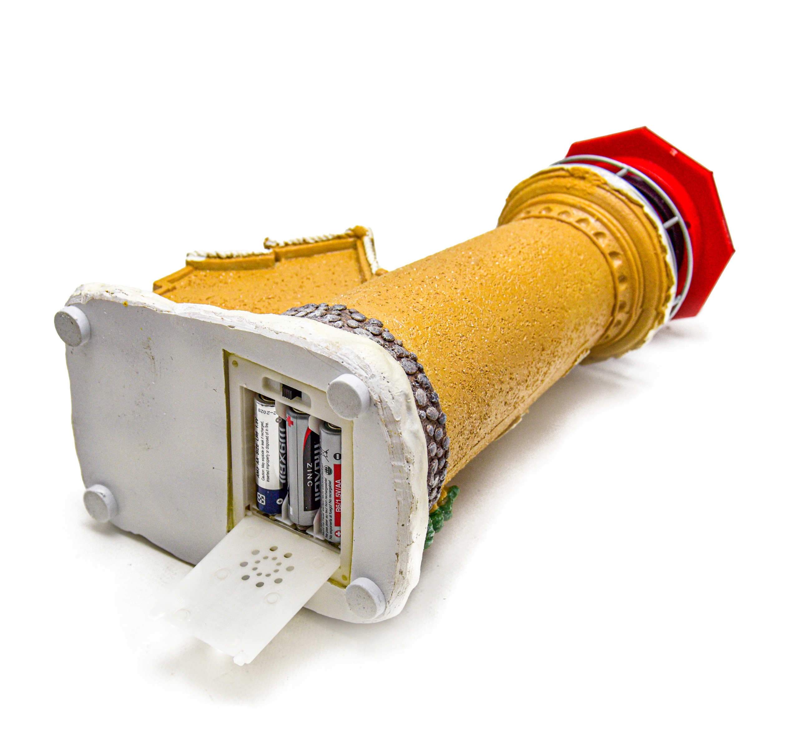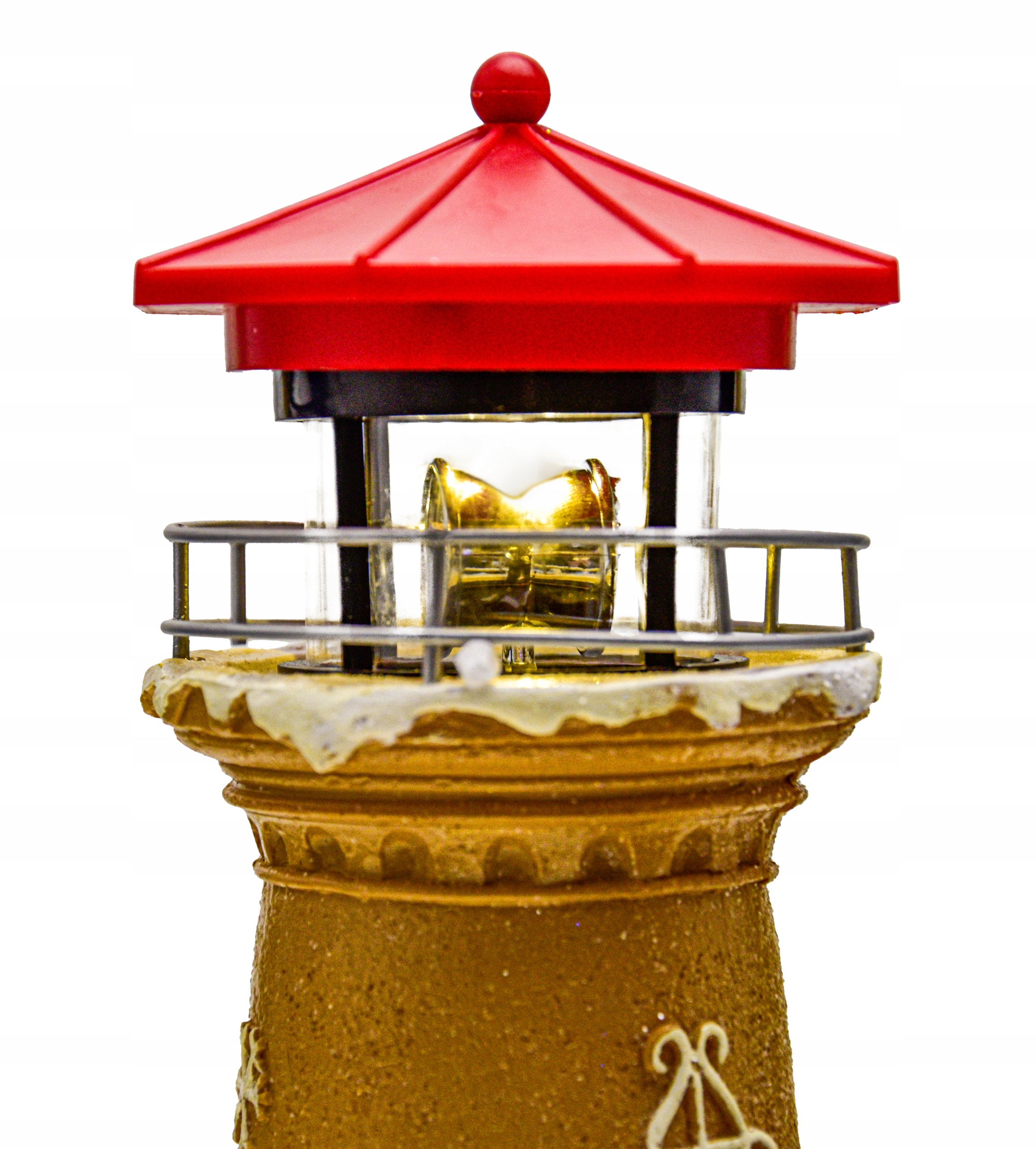 - Najważniejszym elementem ruchomym dekoracji jest górna część latarni morskiej. W jej szklanej komorze znajduje się żółte światło LED, które obraca się powoli wokół własnej osi, tworząc realistyczny efekt prawdziwej pracującej latarni.