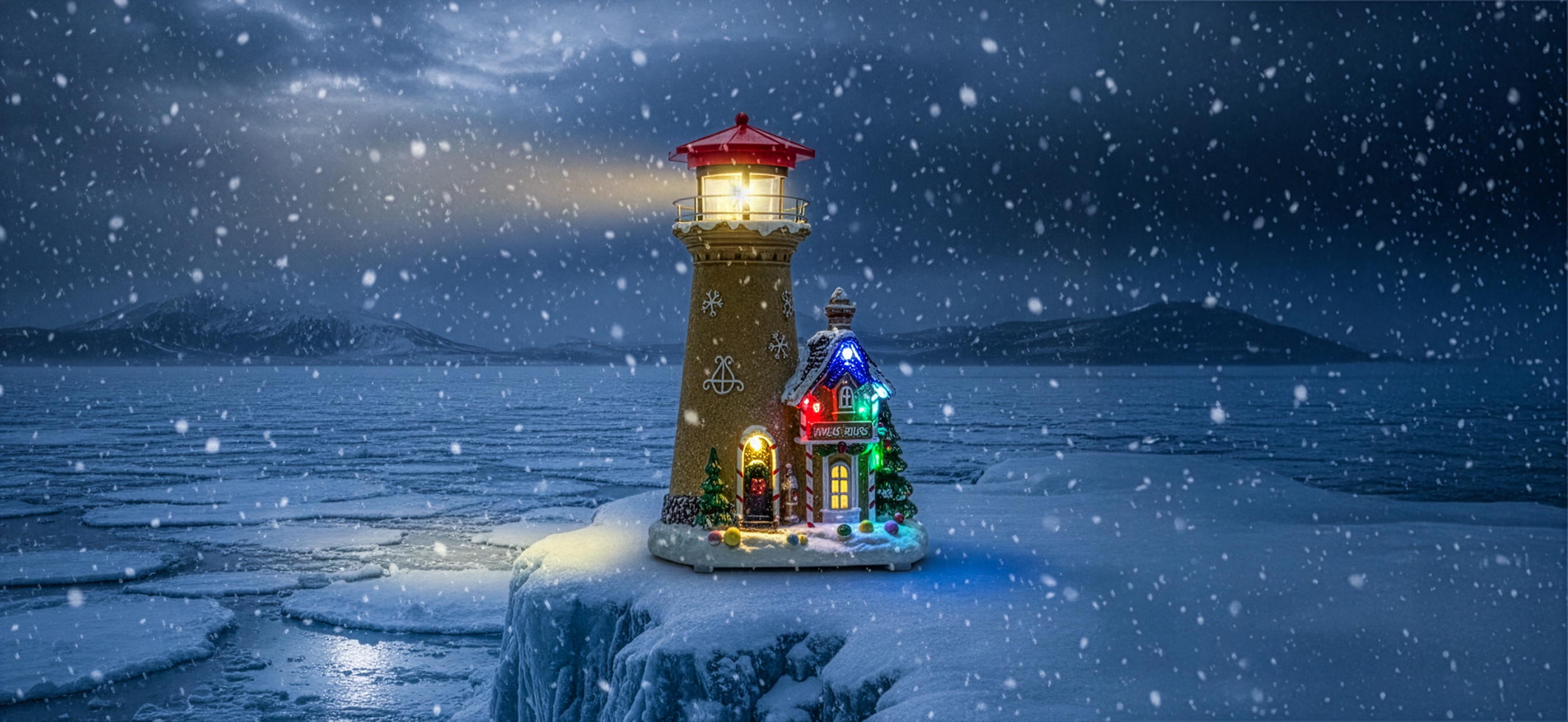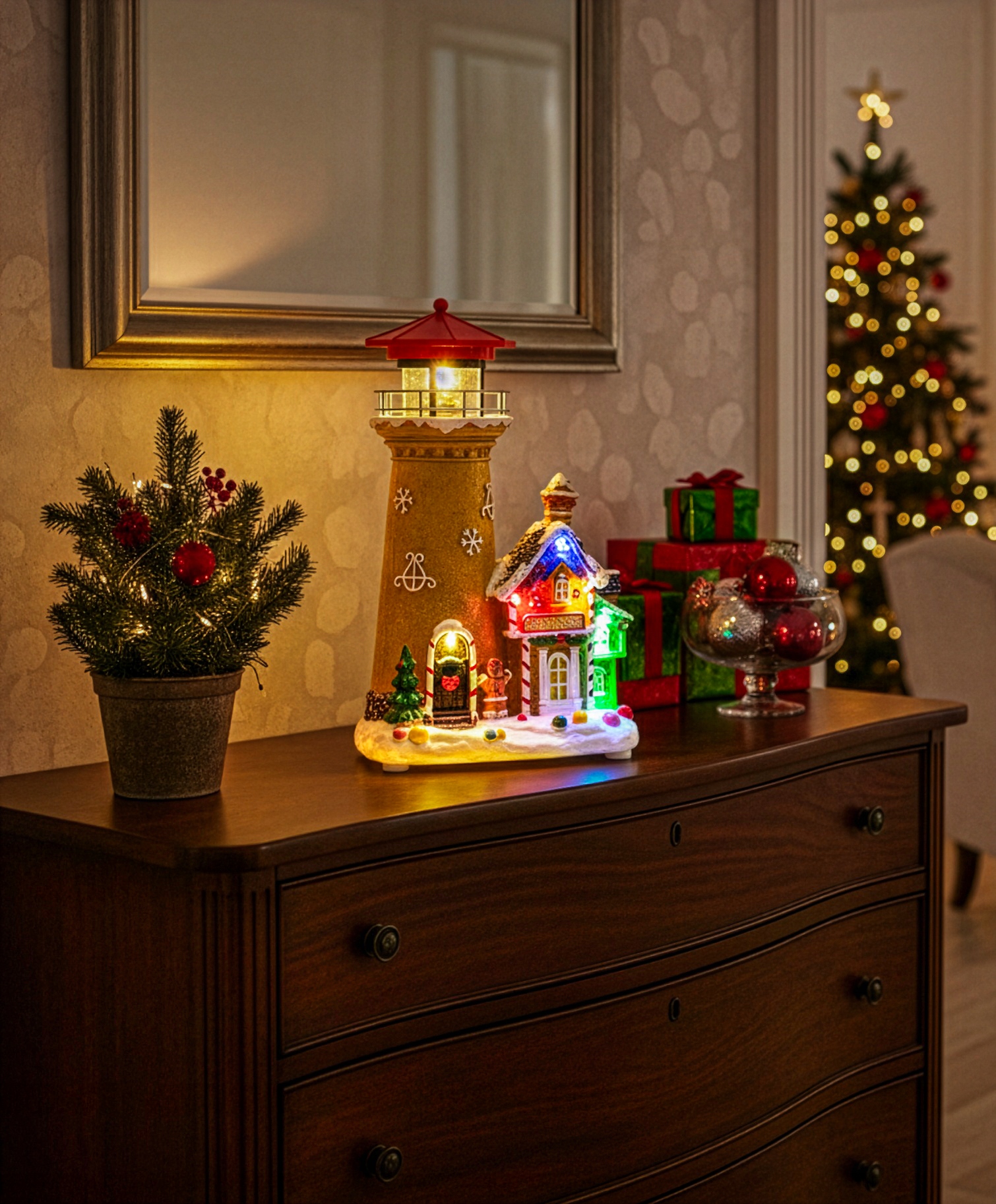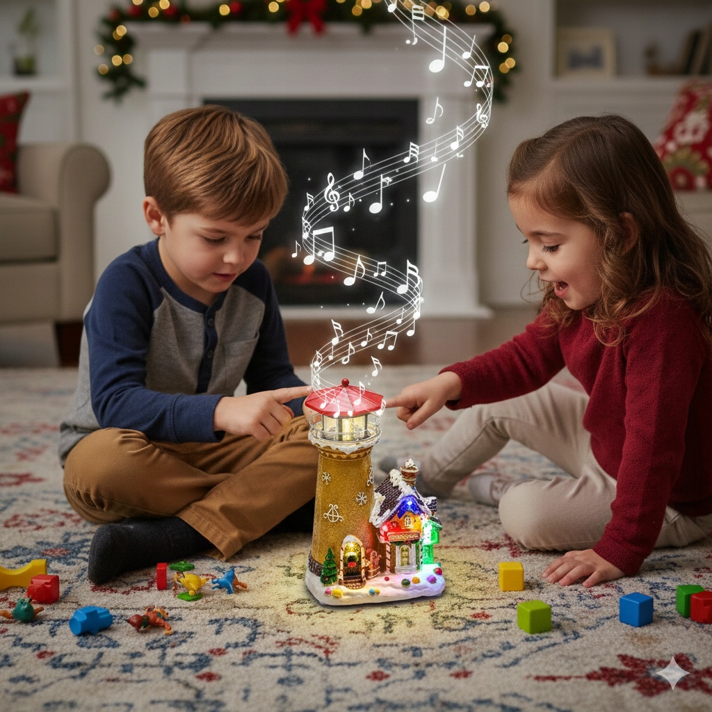 - Wprowadź do swojego domu magiczny klimat świąt dzięki tej niezwykłej dekoracji przedstawiającej zimową scenkę z obracającym się światłem latarni, kolorowym oświetleniem LED oraz pozytywką. To dopracowane miasteczko bożonarodzeniowe prezentuje piękną latarnię morską oraz uroczy domek „Candy Shop”, ozdobiony śniegiem, choinkami i barwnymi zdobieniami, które tworzą wyjątkowy, świąteczny nastrój.