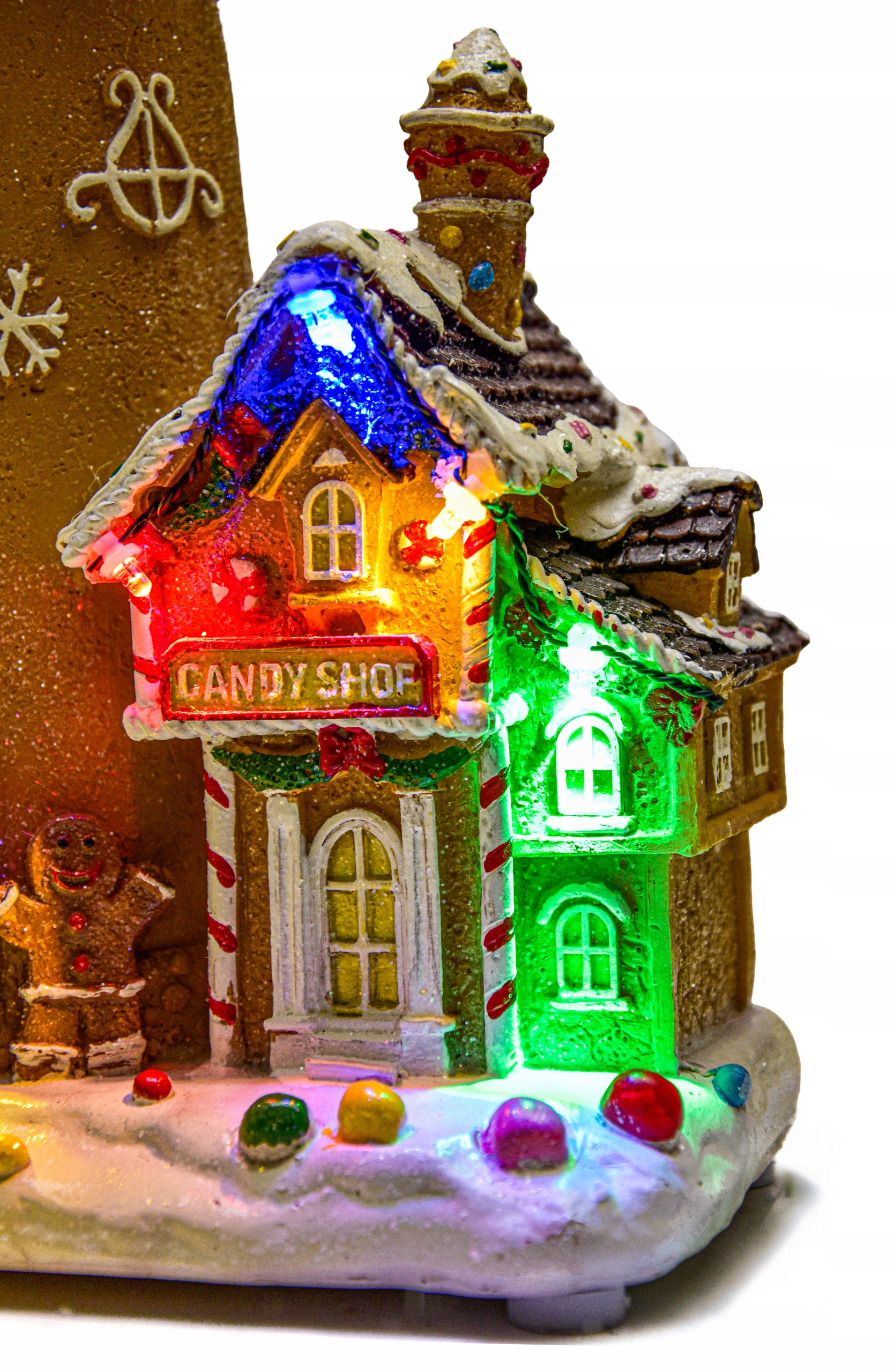 - Z przodu dekoracji znajduje się urocza, statyczna scenka przedstawiająca słodki domek „Candy Shop”, ozdobiony jak piernikowy, świąteczny domek. Wokół okien i drzwi widoczne są biało-czerwone zdobienia przypominające lukier, a na dachu imitacja posypki z kolorowych cukierków.