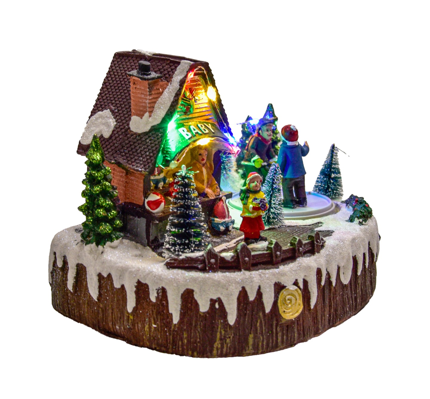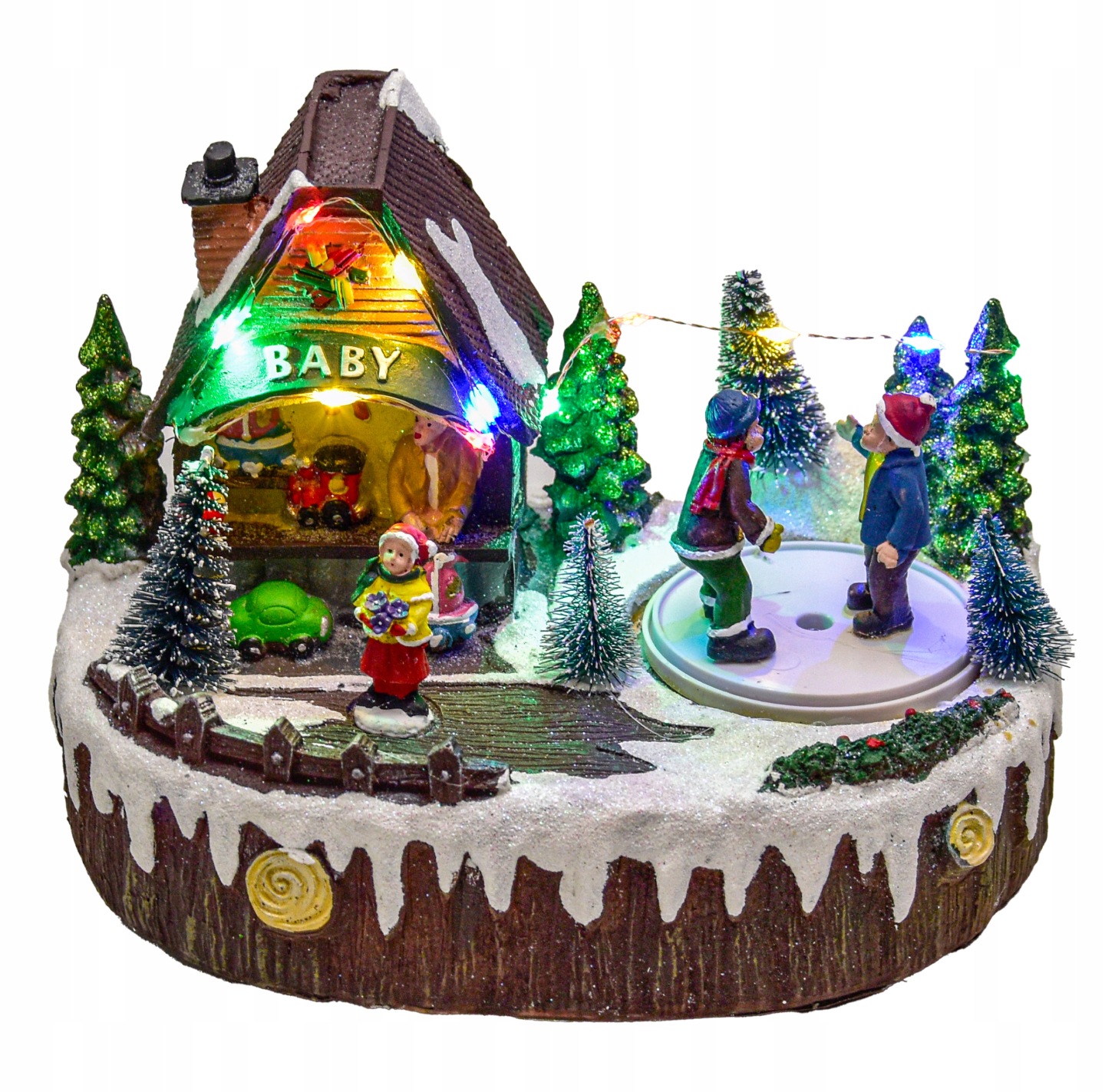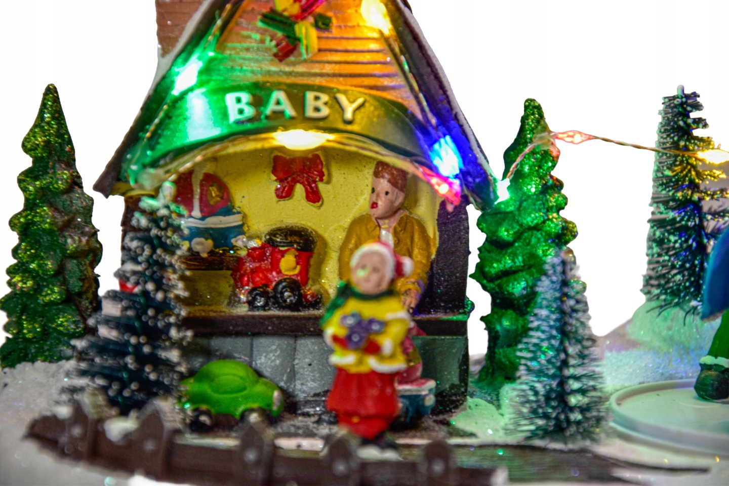 Wprowadź do swojego domu magiczny klimat świąt dzięki tej niezwykłej dekoracji przedstawiającej zimową scenkę z ruchomymi figurkami, kolorowym oświetleniem LED oraz pozytywką. To dopracowane miasteczko bożonarodzeniowe prezentuje uroczy sklep dla dzieci „BABY”, otoczony choinkami, śniegiem i postaciami przygotowującymi się do świąt.