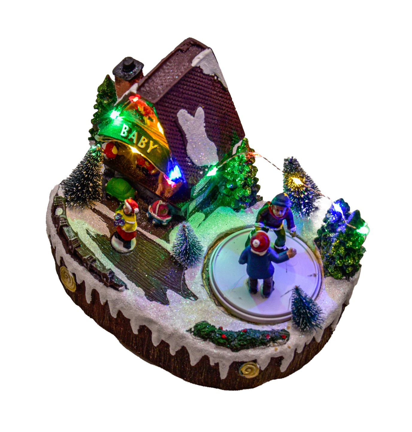 Na dekoracji znajduje się świąteczna zimowa scenka przedstawiająca dwójkę dzieci bawiących się na okrągłej platformie. Figury ustawione są na lodowisku, otoczonym śniegiem i migoczącymi choinkami LED. Postacie wyglądają jakby rozmawiały i wspólnie spędzały zimowy czas na świeżym powietrzu.