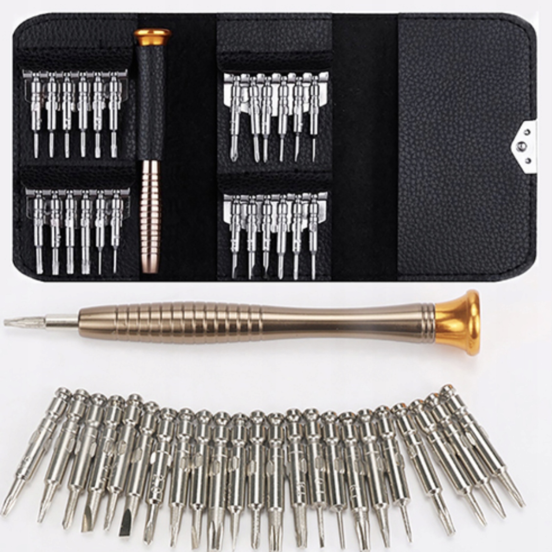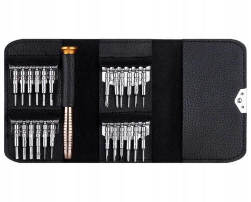 - W zestawie znajduje się 24 precyzyjnych końcówek i profilowana wygodna rączka. Wkrętaki zapakowane w eleganckie i poręczne etui, które wyglądem przypomina portfel.
