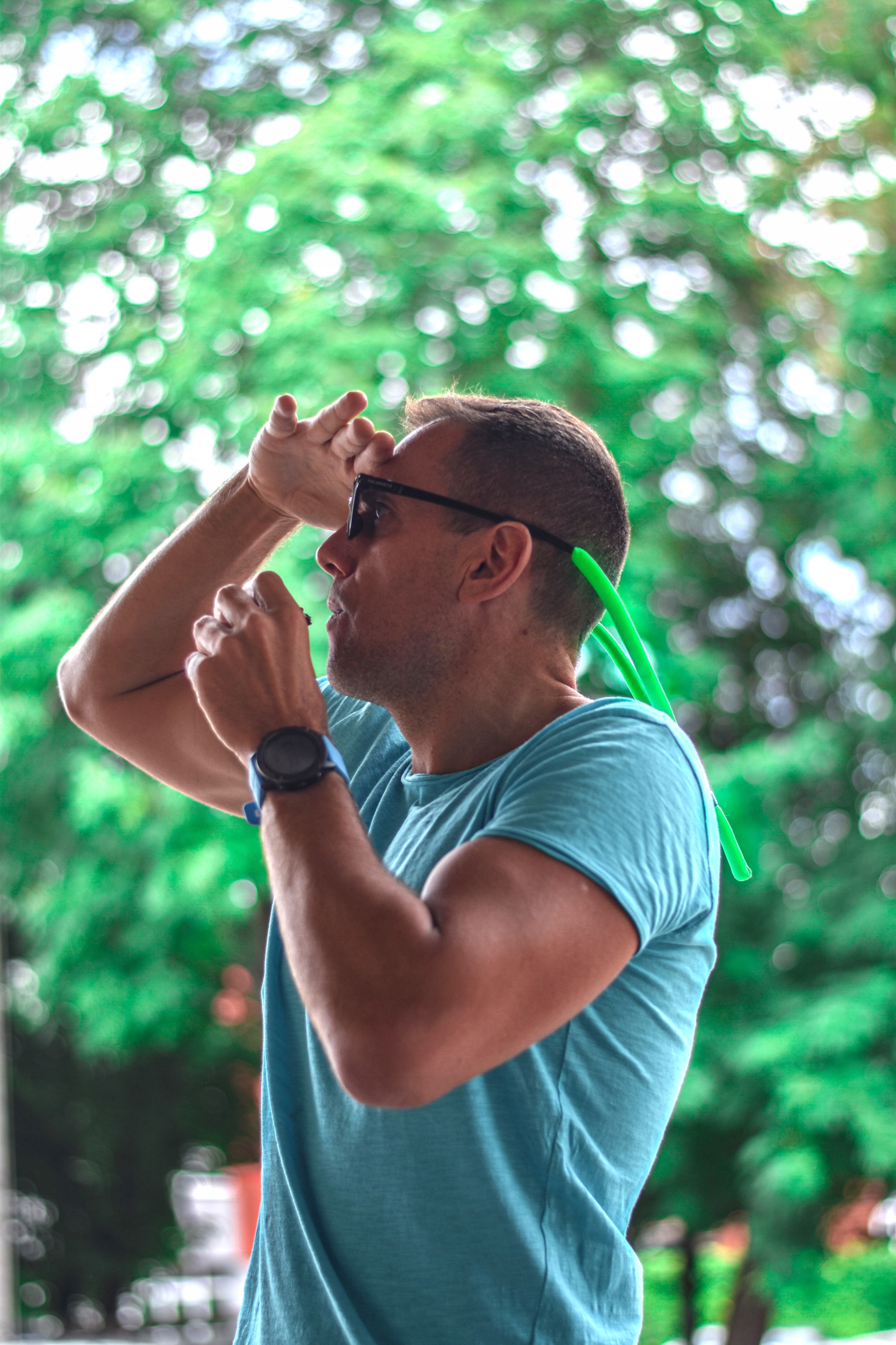 Trzyma okulary na głowie lub zawieszone na szyi.