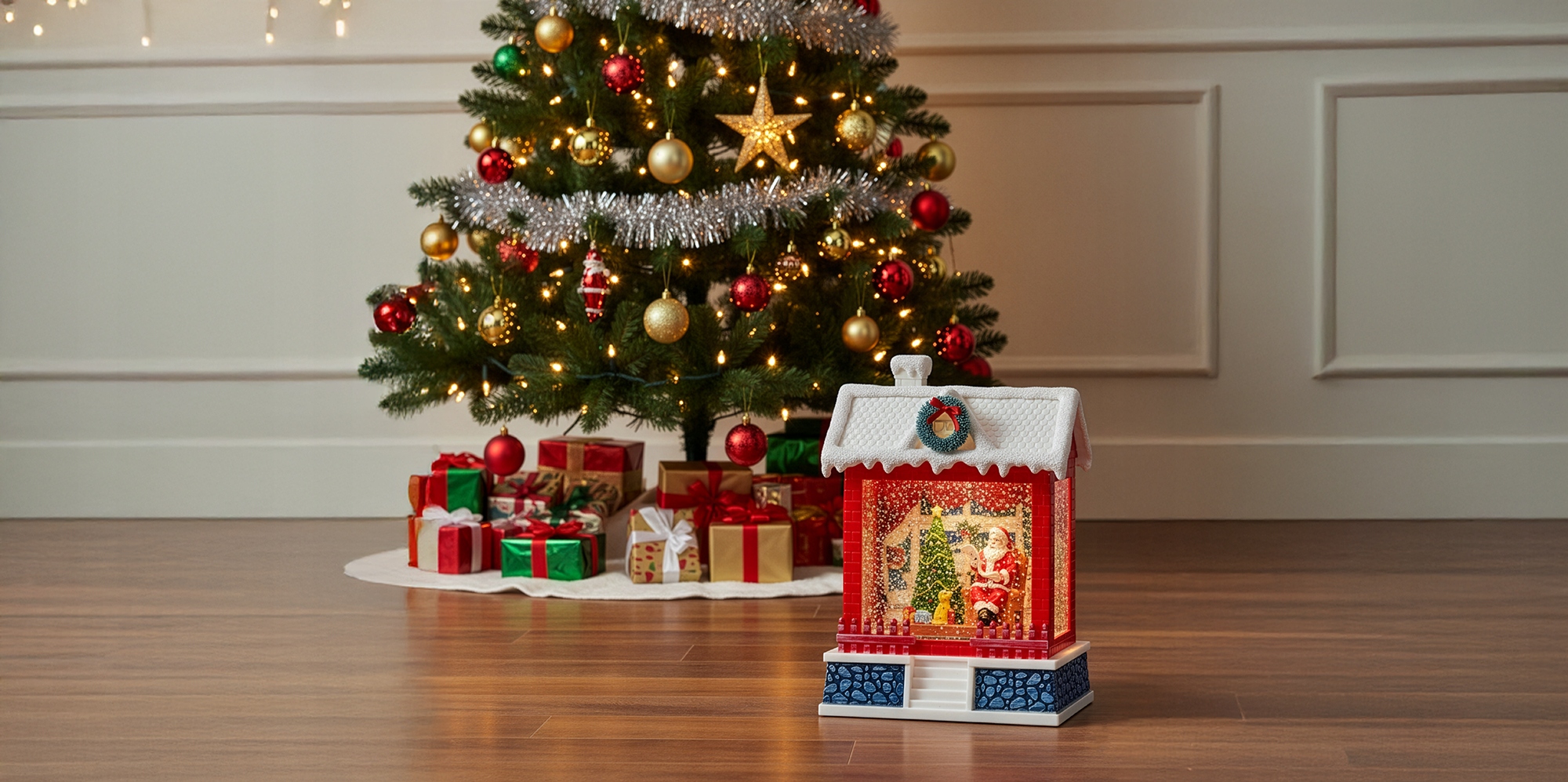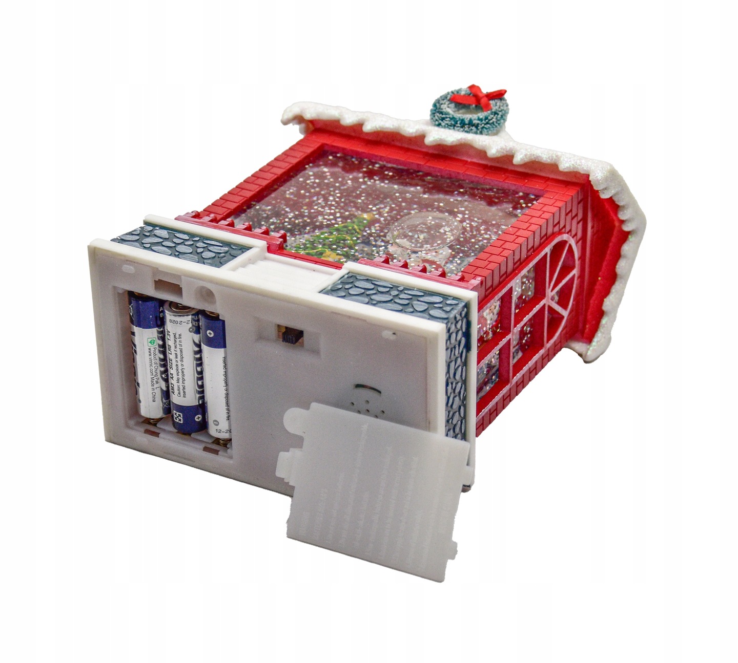- Wewnątrz świątecznego domku znajduje się malownicza sceneria: Mikołaj siedzący przy choince, prezenty, dekoracje i migoczące płatki śniegu wirujące dzięki wbudowanemu mechanizmowi.