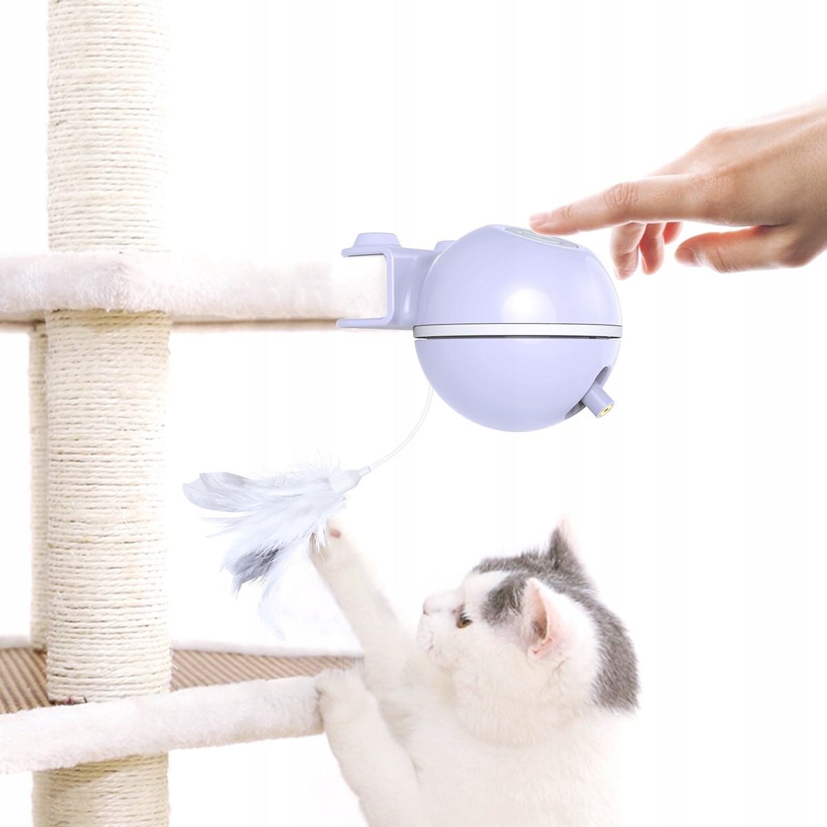 - Wystarczy że zaczepisz urządzenie do drapaka lub jakiegokolwiek innego mebelka w domu np. półki, i włączysz za pomocą dużego włącznika a cała zabawa dopiero się zacznie