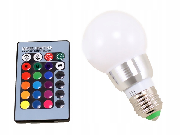 - Dzięki pilotowi IR kompaktowych rozmiarów można w łatwy sposób sterować świeceniem żarówki. Można włączyć / wyłączyć i ustawić kolory i jasność.