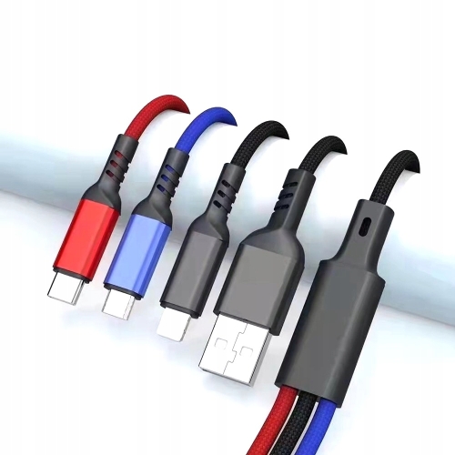 - Dzięki temu że każdy przewód ma inny kolor nie będziesz musiał szukać końcówki do danego urządzenia, długość całego przewodu to 1200mm. Produkt został wykonany z wysokiej jakości materiałów, które zapewniają mu niesamowitą wytrzymałość. 5 miedzianych przewodników gwarantuje szybkie ładowanie i niezawodną transmisję danych. Pleciona, nylonowa powłoka jest niezwykle trwała. Dzięki niej kabel wyróżnia się elastycznością i odpornością na zginanie, zadrapania, a nawet złamania.